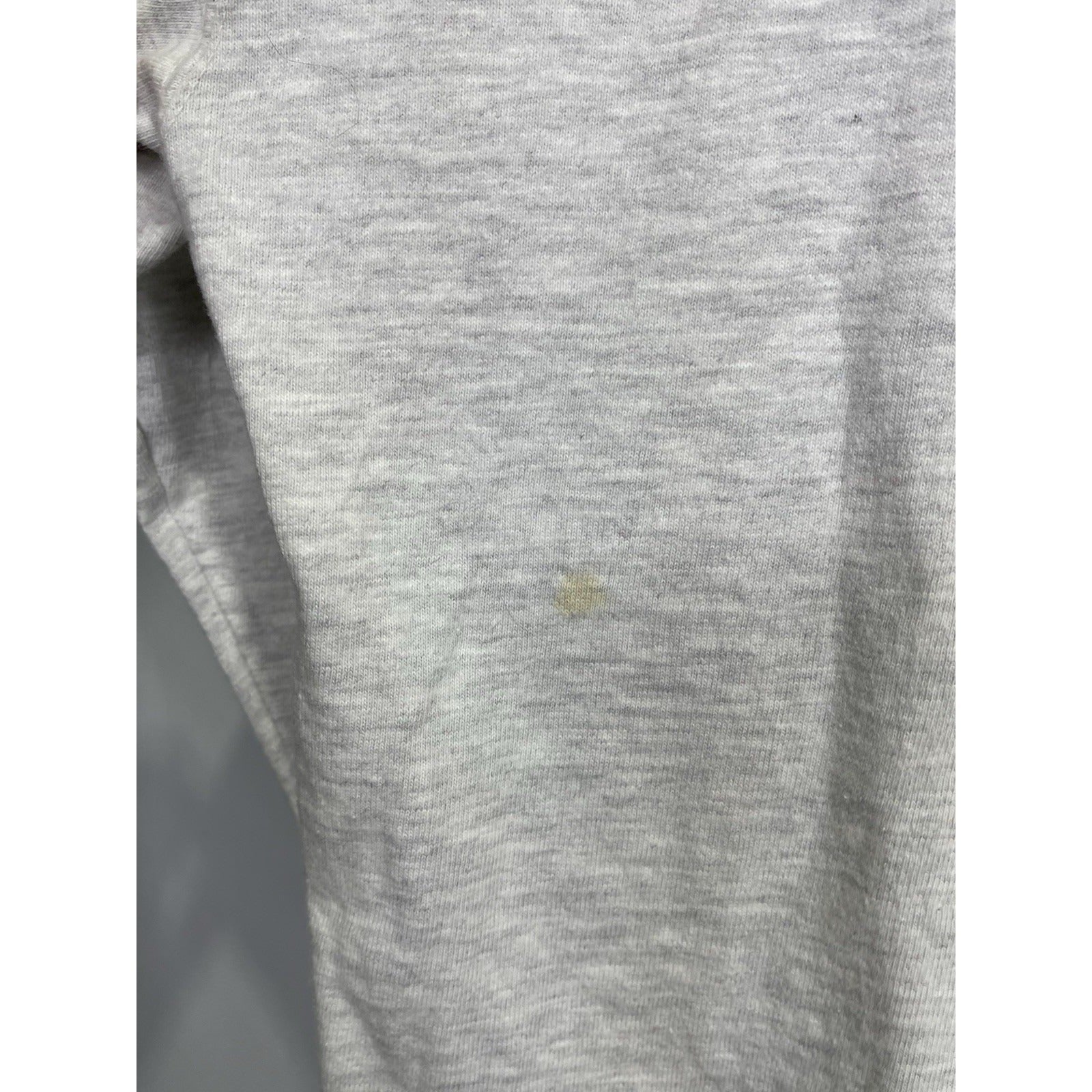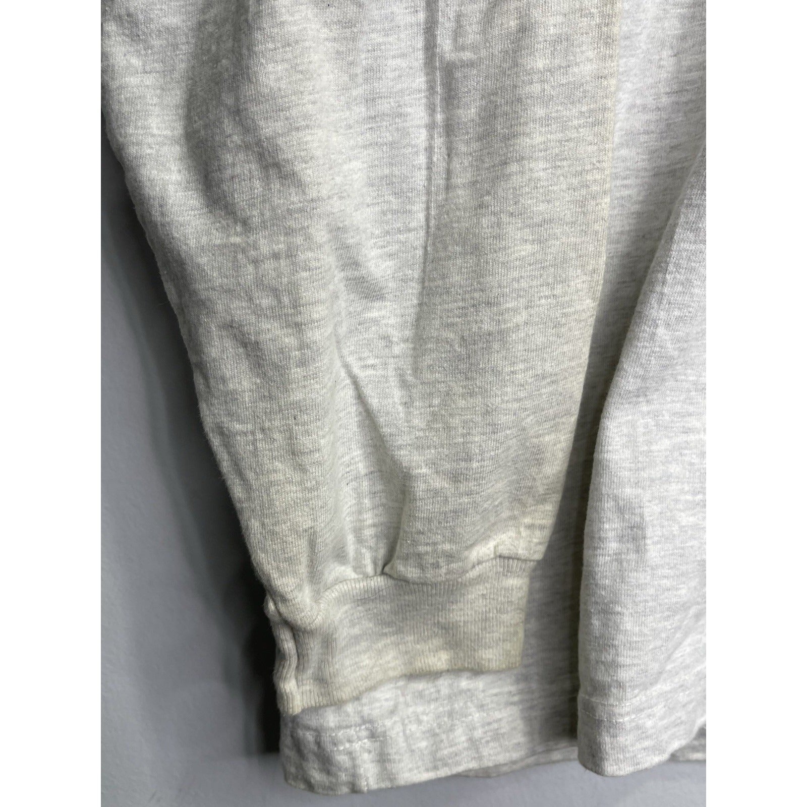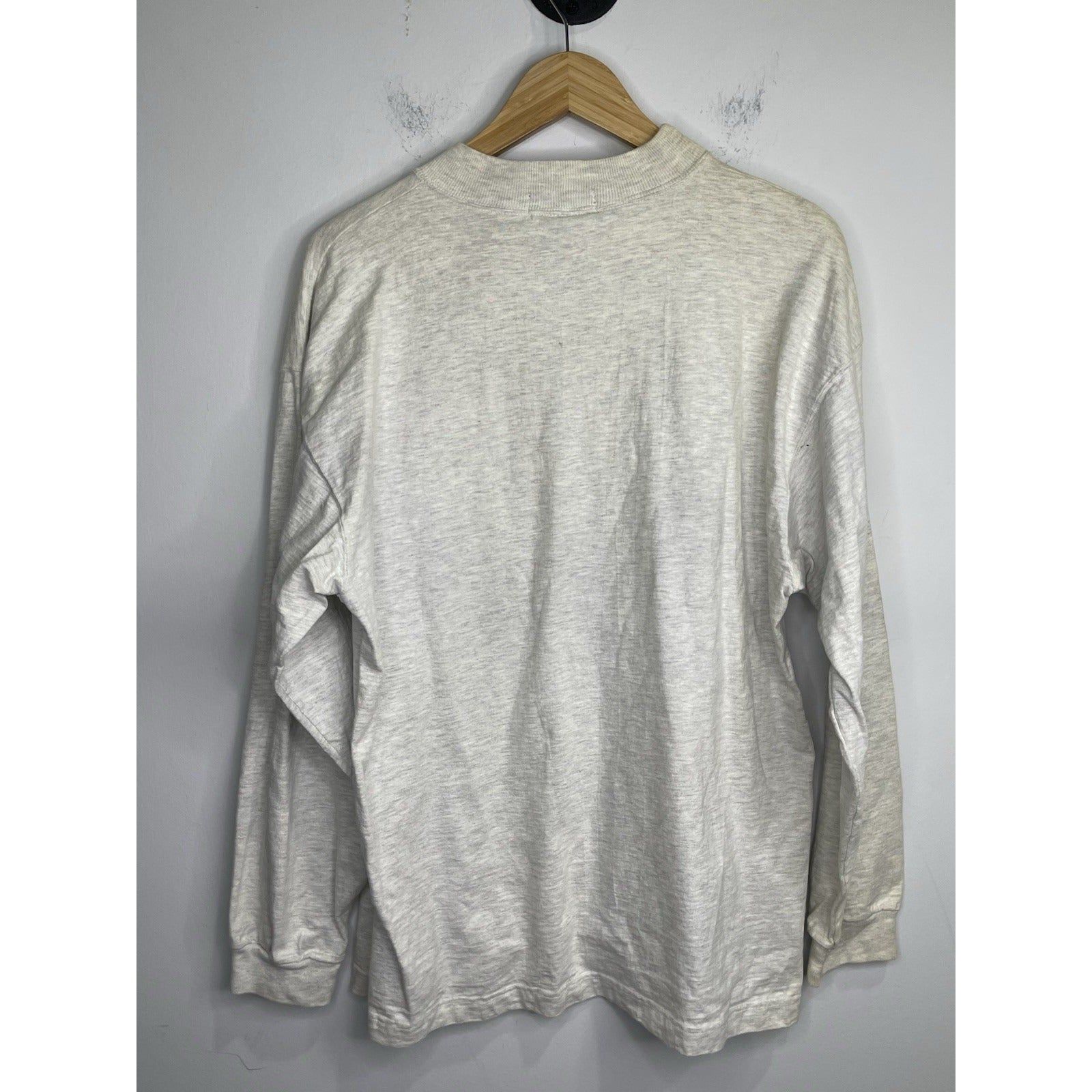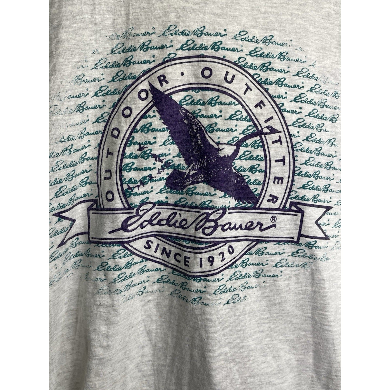 This product is a vintage Eddie Bauer long sleeve t-shirt, made in the USA in the 1990s. The size is L, the color is gray, and the graphic print features a patriotic USA theme. This regular fit t-shirt is perfect for men looking for a classic and comfortable wardrobe staple with a touch of retro style.