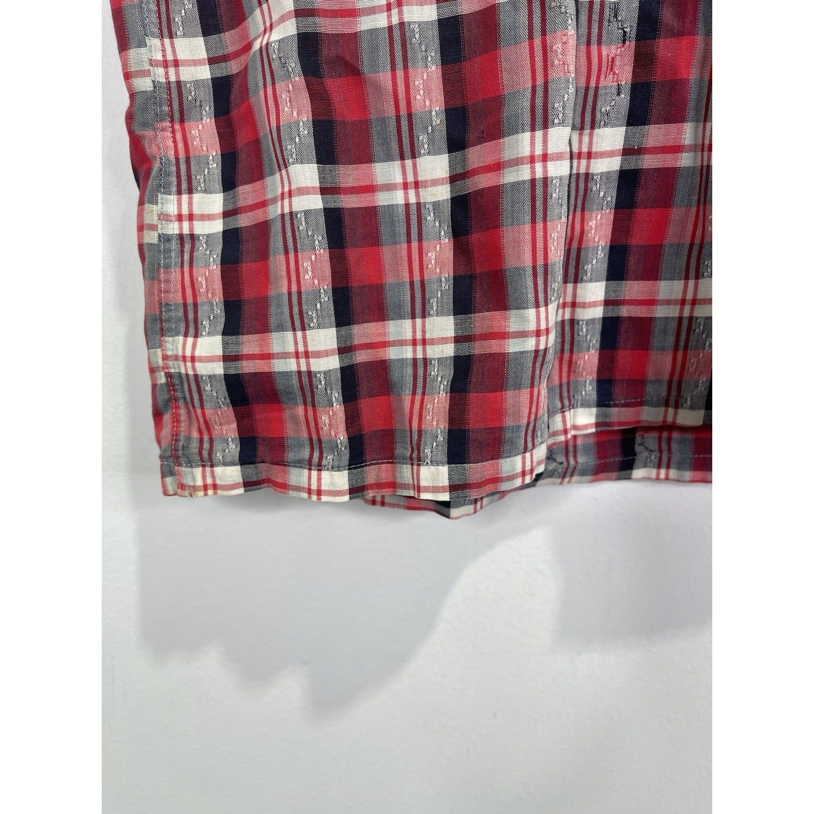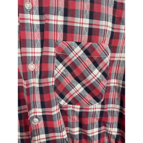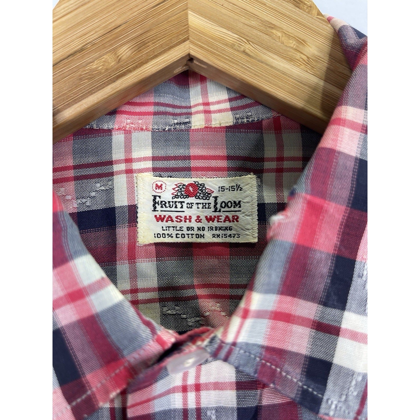 This vintage men's 80s flannel shirt from Fruit of the Loom is a classic red, white, and black plaid with a button-down collar and long sleeves. The shirt is made of flannel fabric with a regular fit, making it perfect for casual occasions. It features a button-up front, pockets, and a retro 80s theme, ideal for a stylish and nostalgic look. With its timeless design and quality construction, this shirt is a must-have for any vintage-loving wardrobe.