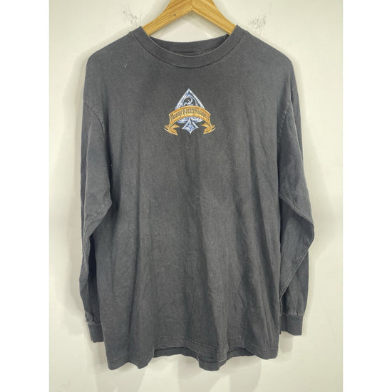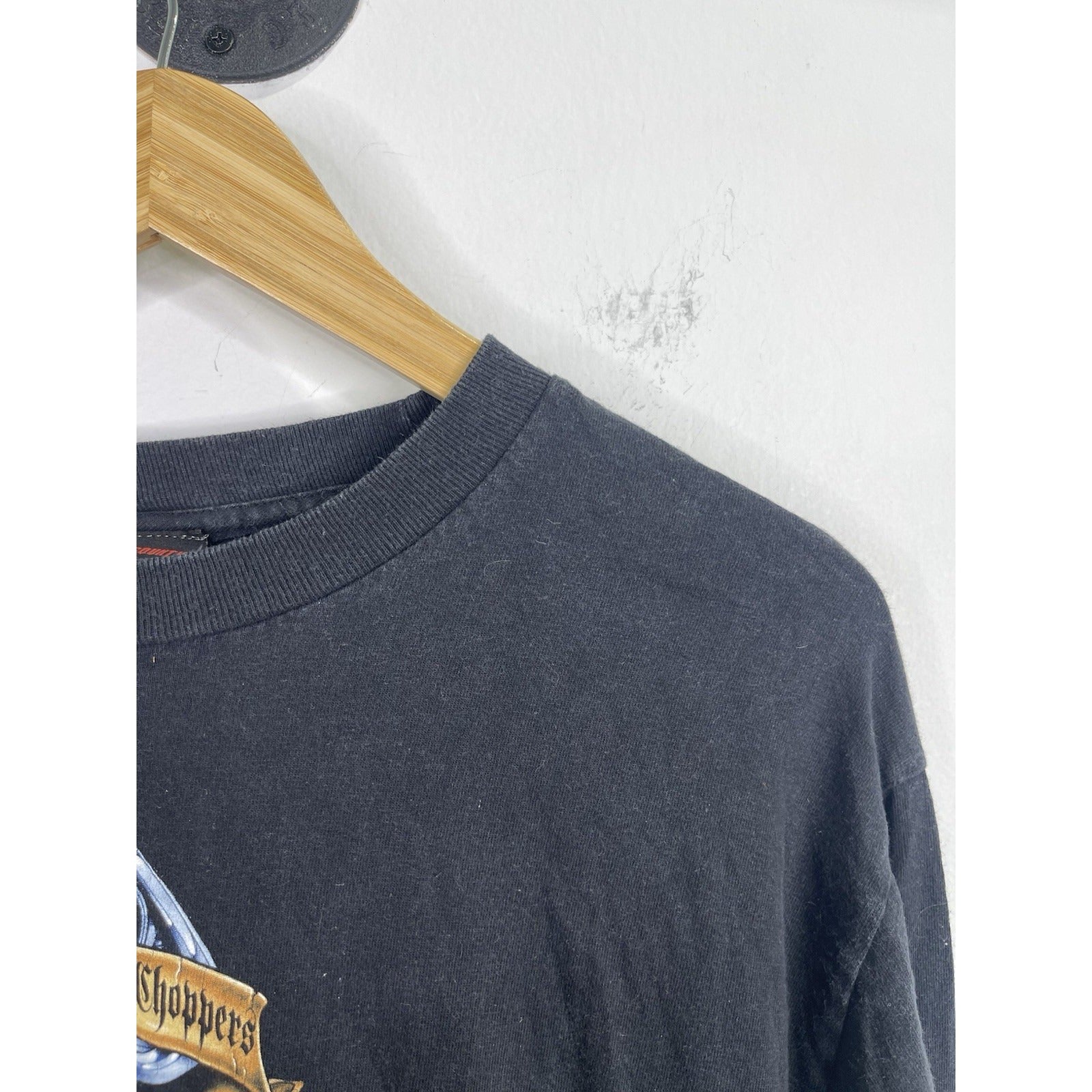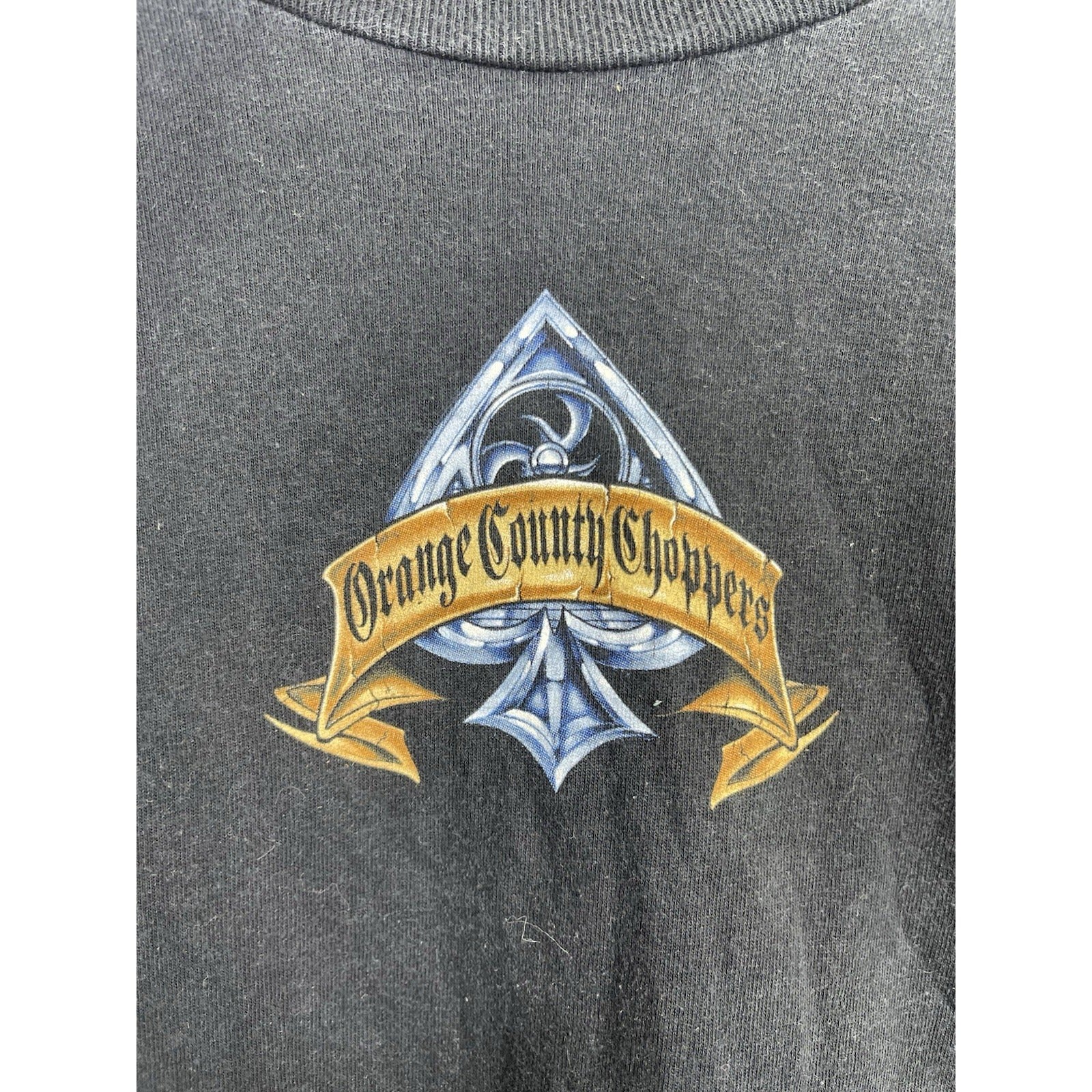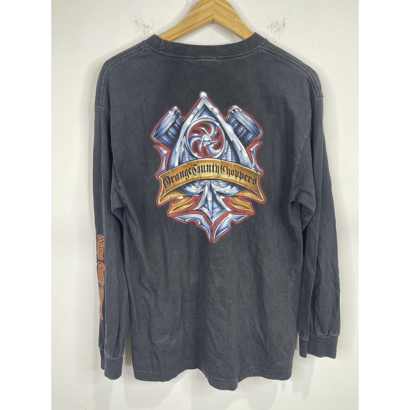 This Vintage Men’s Black Orange County Choppers Long Sleeve T-Shirt in size Large features a classic crew neck and is made from comfortable cotton material. The graphic print design with a 90s motorcycle and biker theme makes it a stylish and unique addition to any wardrobe. Perfect for all seasons, this double-sided shirt is easy to care for and offers a regular fit for a comfortable wear. Showcasing the iconic Orange County Choppers brand, this T-shirt is a must-have for any motorcycle enthusiast or biker lifestyle fan.