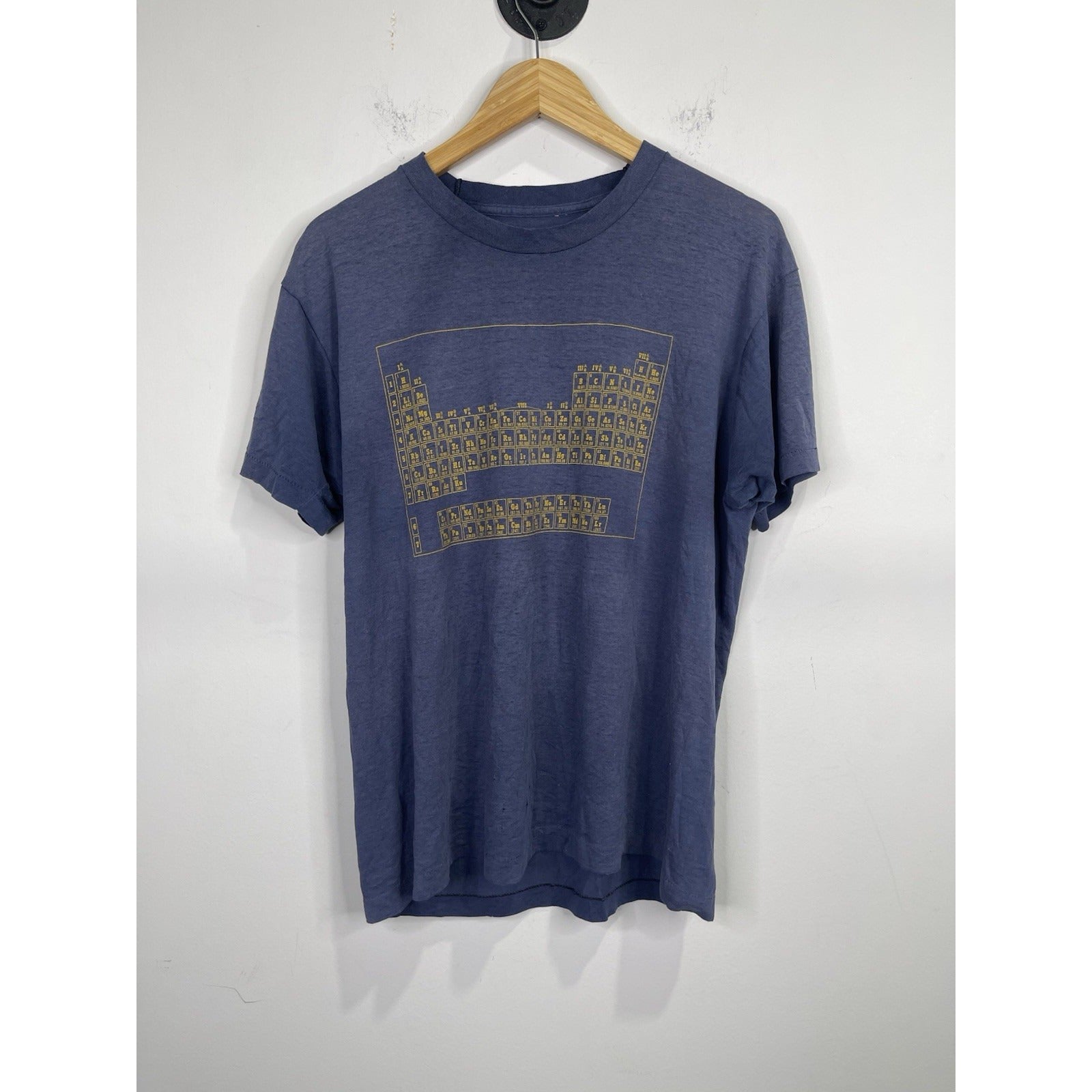 This Vintage Men's Blue Periodic Table Graphic T-Shirt is a stylish and comfortable addition to any wardrobe. Made from soft cotton material, this short sleeve shirt features a crew neck and a regular fit. The graphic print design, featuring the periodic table in shades of blue, adds a unique touch to the vintage aesthetic. Perfect for any man looking for a lightweight shirt that can be worn in all seasons, whether you're a fan of 90s style or just appreciate a quirky design.