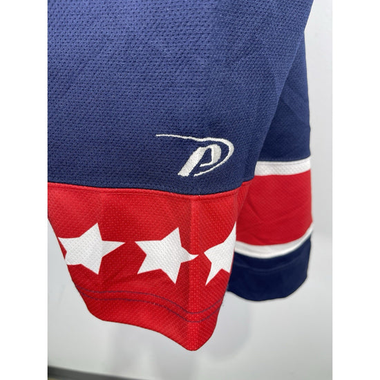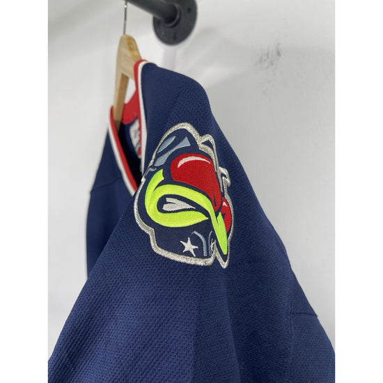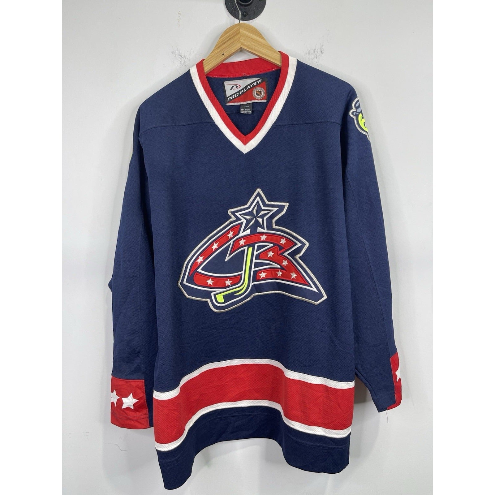 The product is a vintage men's Columbus Blue Jackets jersey in blue, with the official team logo stitched on it. It is officially licensed by the National Hockey League (NHL) and made by Pro-Player. The jersey is in size Large and suitable for both men and women. This item would be perfect for any fan of the Columbus Blue Jackets looking to show their team pride during the regular hockey season. Made in the Jersey country of origin, this jacket is a must-have for any hockey enthusiast.