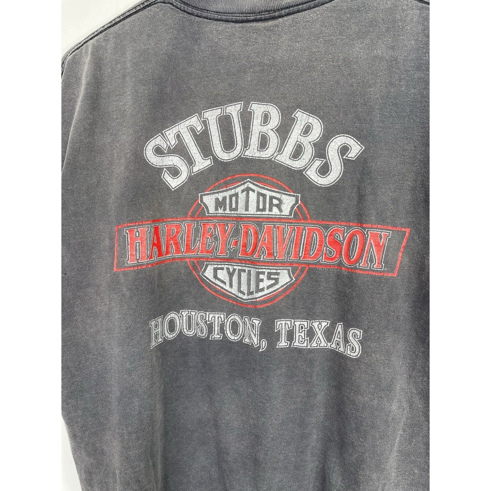 This Vintage Men’s Harley Davidson graphic t-shirt in size L features a classic black color with a crew neck and short sleeves, perfect for all seasons. Made of comfortable cotton material, the shirt showcases the iconic Harley-Davidson logo, making it a great choice for fans of the brand and biker theme. With a regular fit and vintage design, this shirt is a stylish and timeless addition to any man's wardrobe.