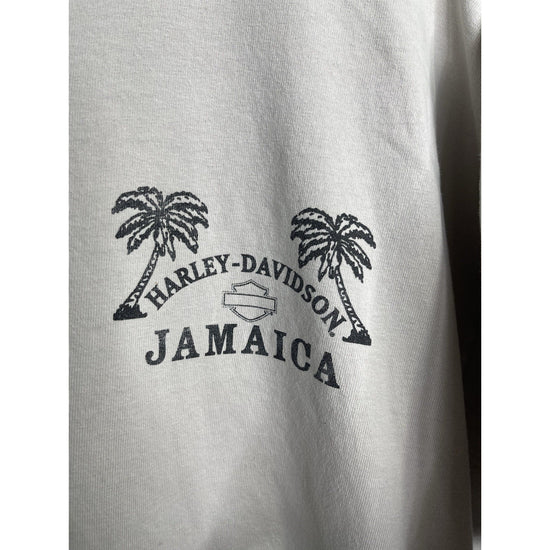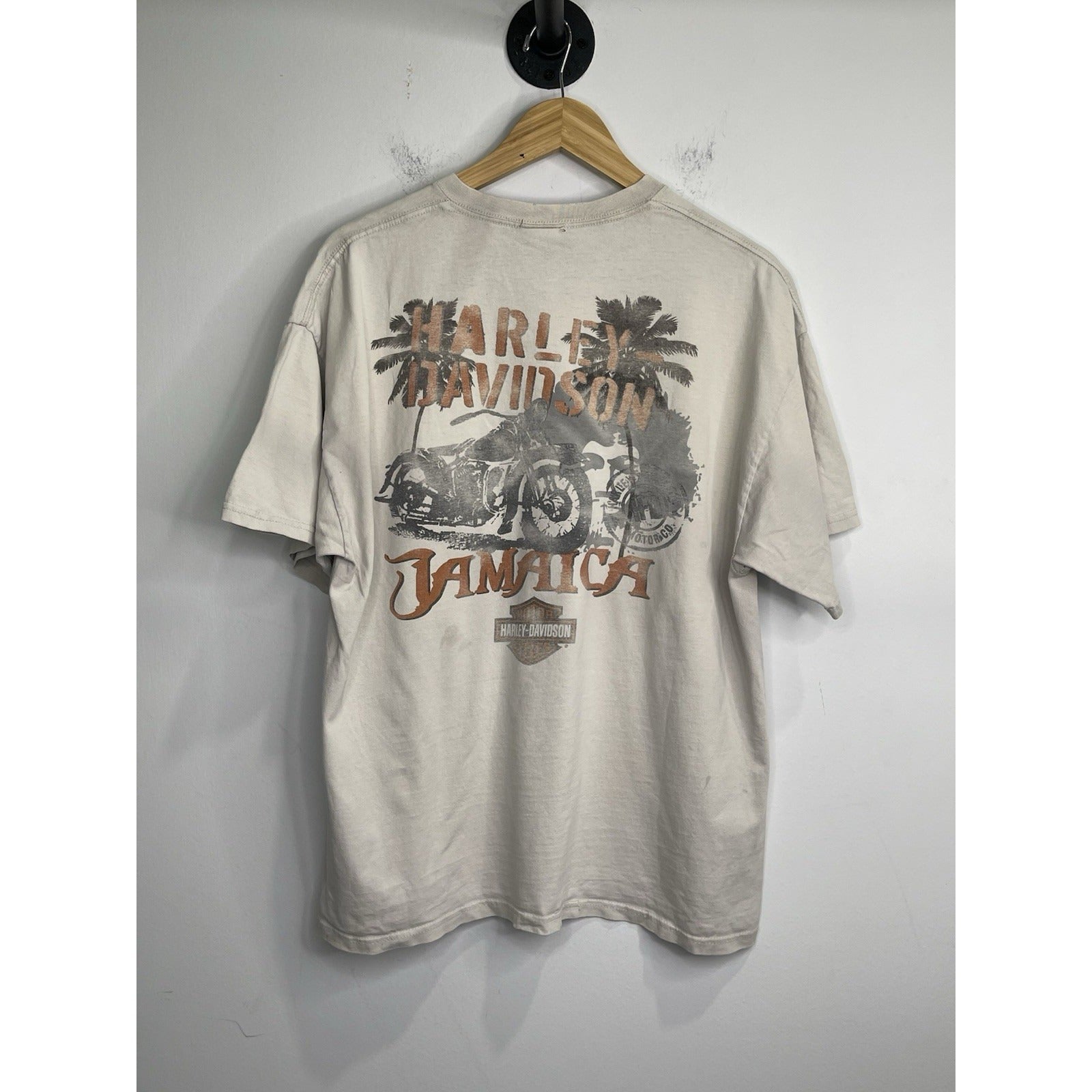 The Vintage Men's Harley Davidson Jamaica T-shirt in size XL features a classic crew neck design with a graphic print depicting the iconic Harley-Davidson brand. Made from comfortable cotton material, this cream-colored t-shirt is perfect for all seasons and embodies a biker theme. With its regular fit and short sleeves, this vintage shirt is a stylish and nostalgic choice for any motorcycle enthusiast.