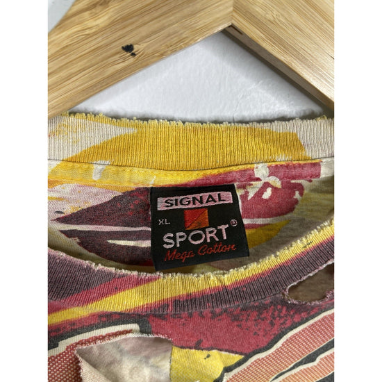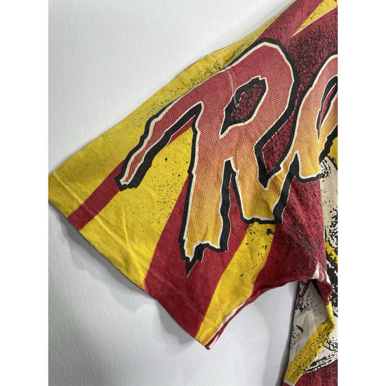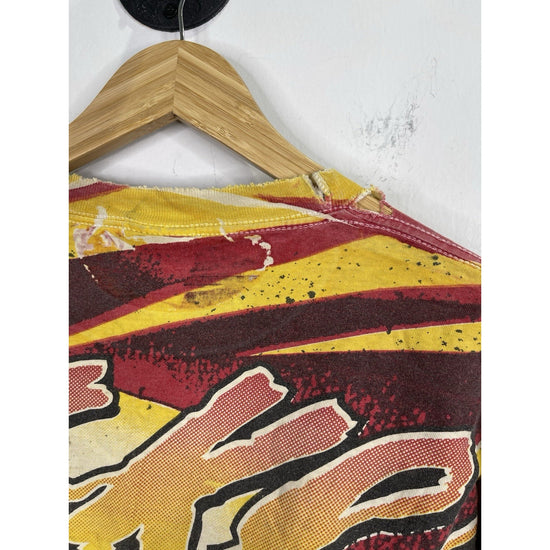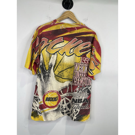The product is a vintage men's Magic Johnson T-shirt featuring an all-over print of the Houston Rockets during the NBA Finals. Made of cotton with a crew neck and short sleeves, this multicolor shirt in size XL has a regular fit and is part of the 90s theme. With the NBA brand logo and graphic print, this nostalgic T-shirt is perfect for fans of basketball history and 90s fashion.