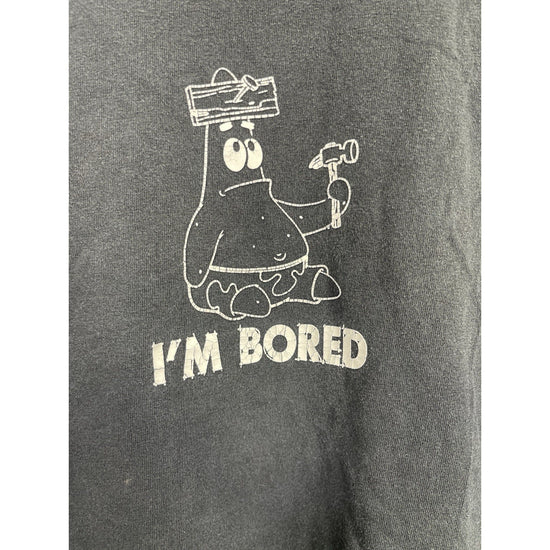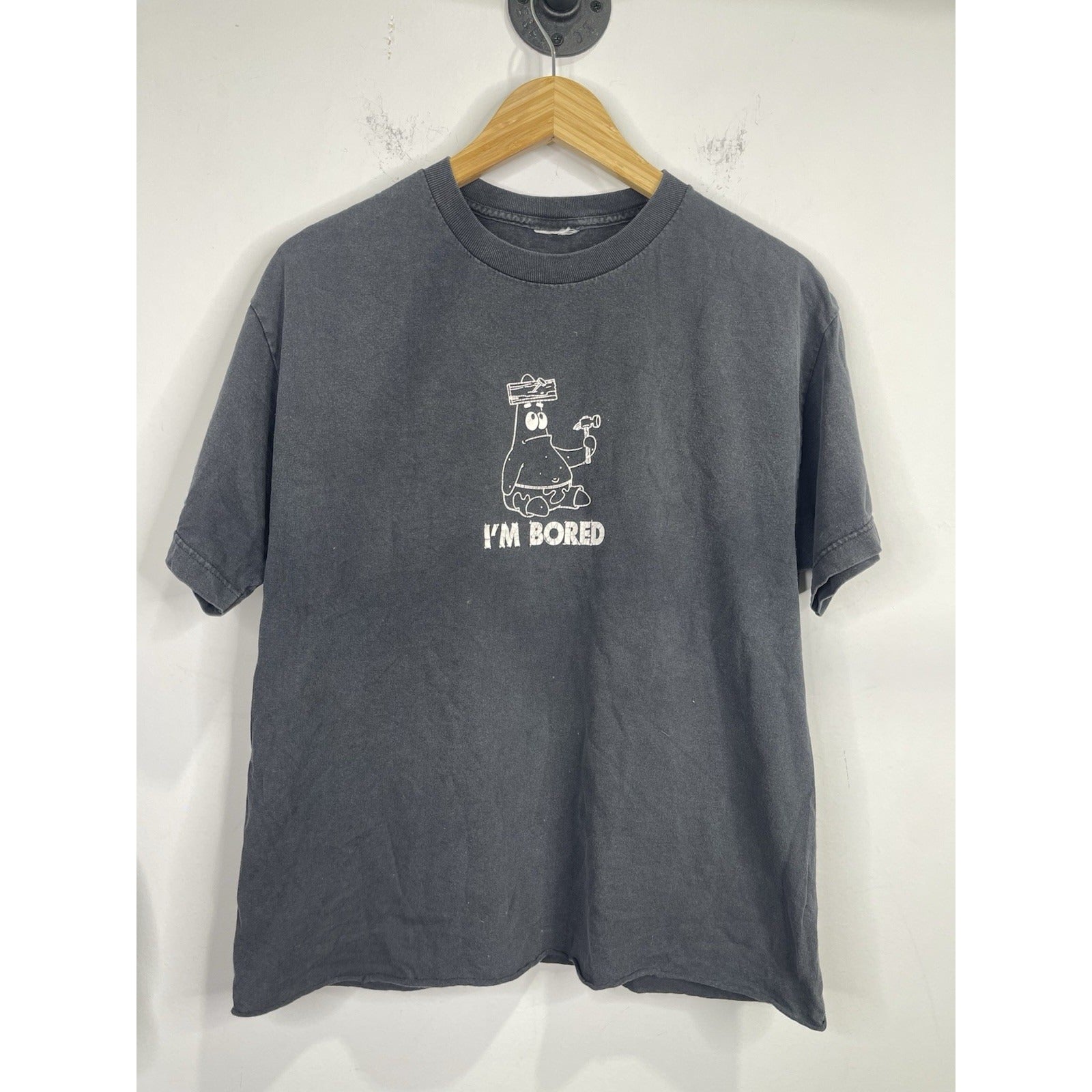 This vintage men's SpongeBob SquarePants Patrick Starfish "I'm Bored" black tee in size L features a graphic print design with a classic crew neck and short sleeves. Made of comfortable cotton material, this regular fit t-shirt is perfect for fans of the cartoon series. The tee is preshrunk and suitable for all seasons, making it a versatile addition to any wardrobe. Show off your love for SpongeBob and Patrick with this nostalgic Nickelodeon brand shirt that captures the 90s vibe of the iconic animated series.
