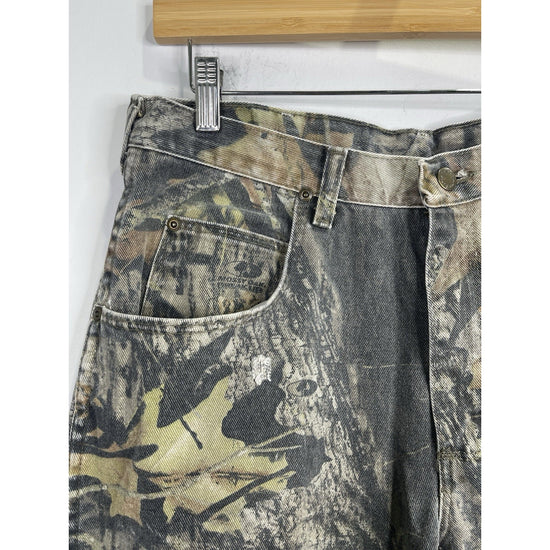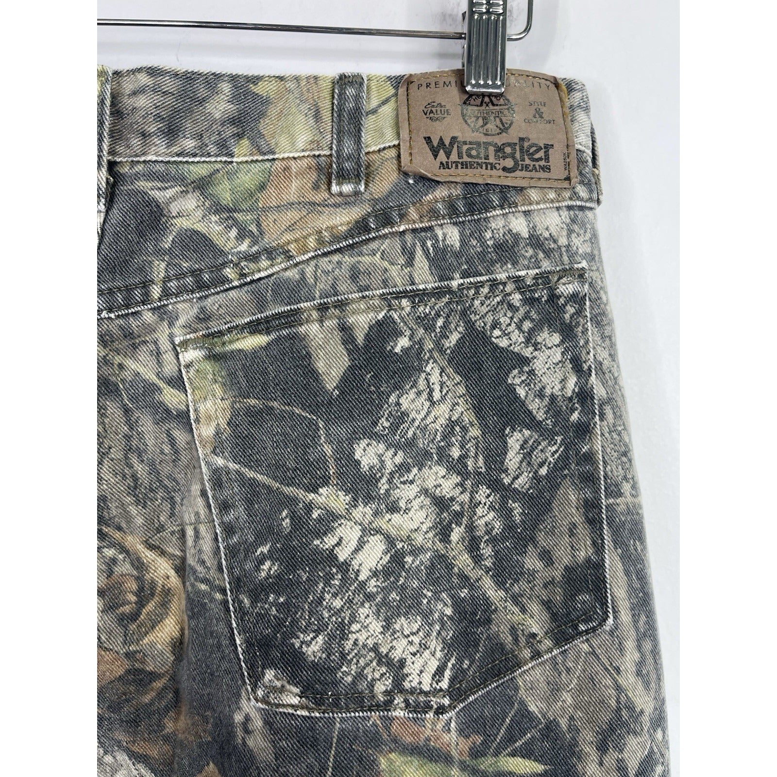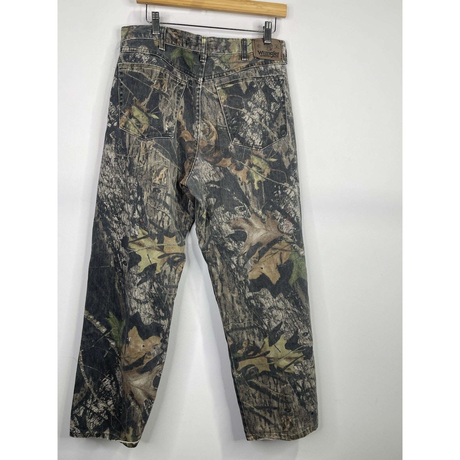 These Vintage Men's Wrangler Camo Double Knee Jeans Pants are a stylish and unique addition to any man's wardrobe. Featuring a classic denim fabric with a faded camouflage pattern, these straight-fit jeans have a mid-rise and a 5-pocket design. The zip and button closure, along with the branded logo accents, add to the vintage charm of these timeless pants. Perfect for all seasons, these jeans offer a comfortable and regular fit, making them a versatile choice for any casual outfit.