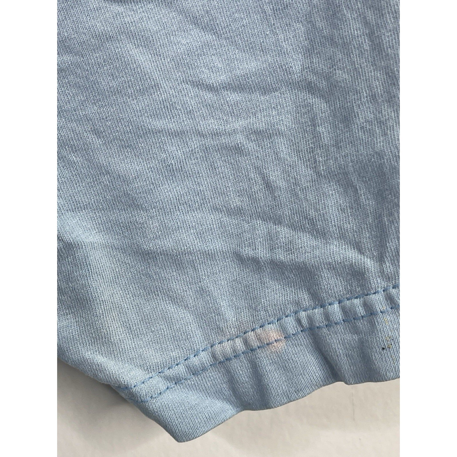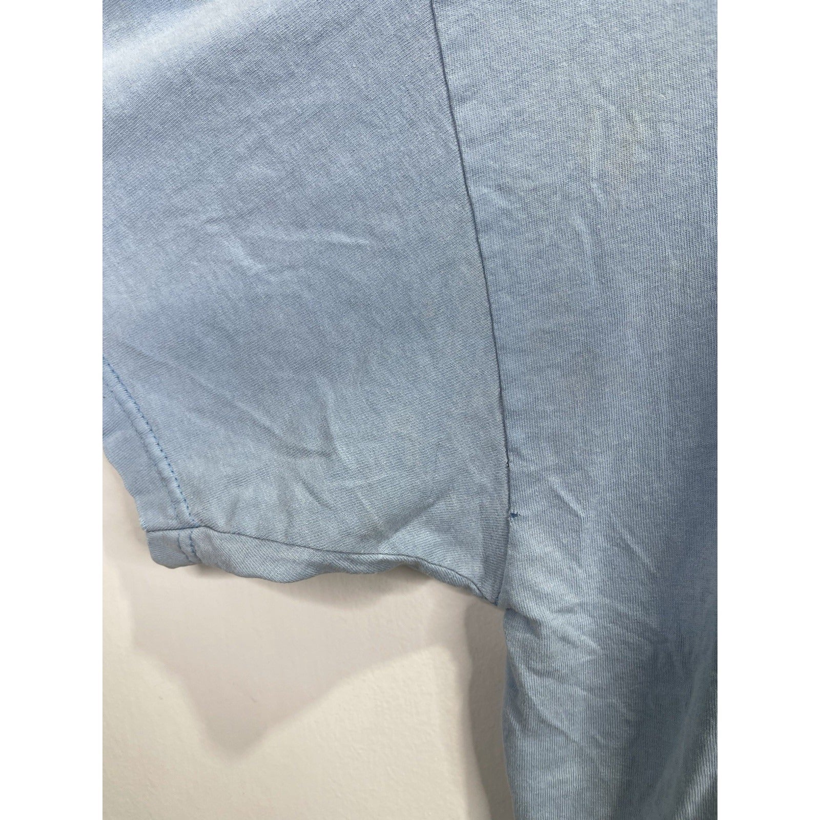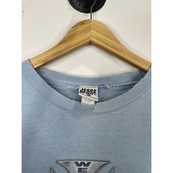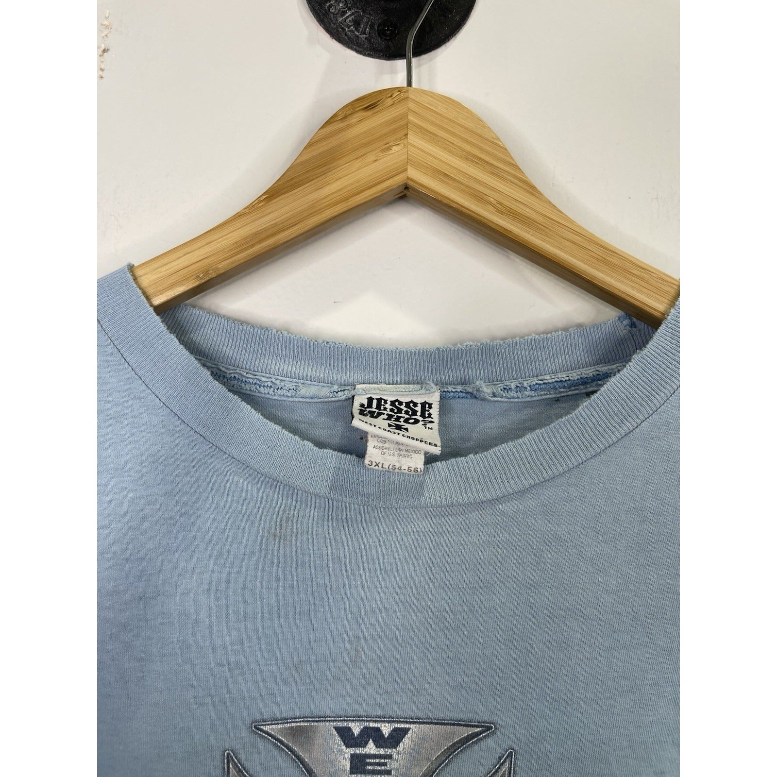 The Vintage Mens Light Blue 3XL Jesse Who West Coast Choppers T-shirt is a graphic print shirt featuring the character Jesse from the West Coast Choppers brand. Made of cotton with a crew neck and short sleeves, this regular fit t-shirt is designed for motorcycle and biker enthusiasts. The vintage style and 90s theme make it a versatile piece suitable for all seasons and a unique addition to any man's wardrobe.