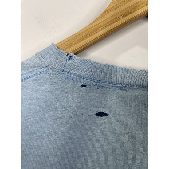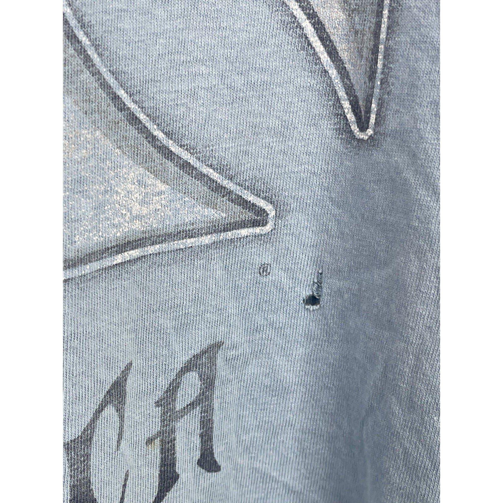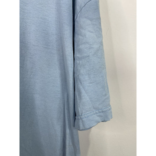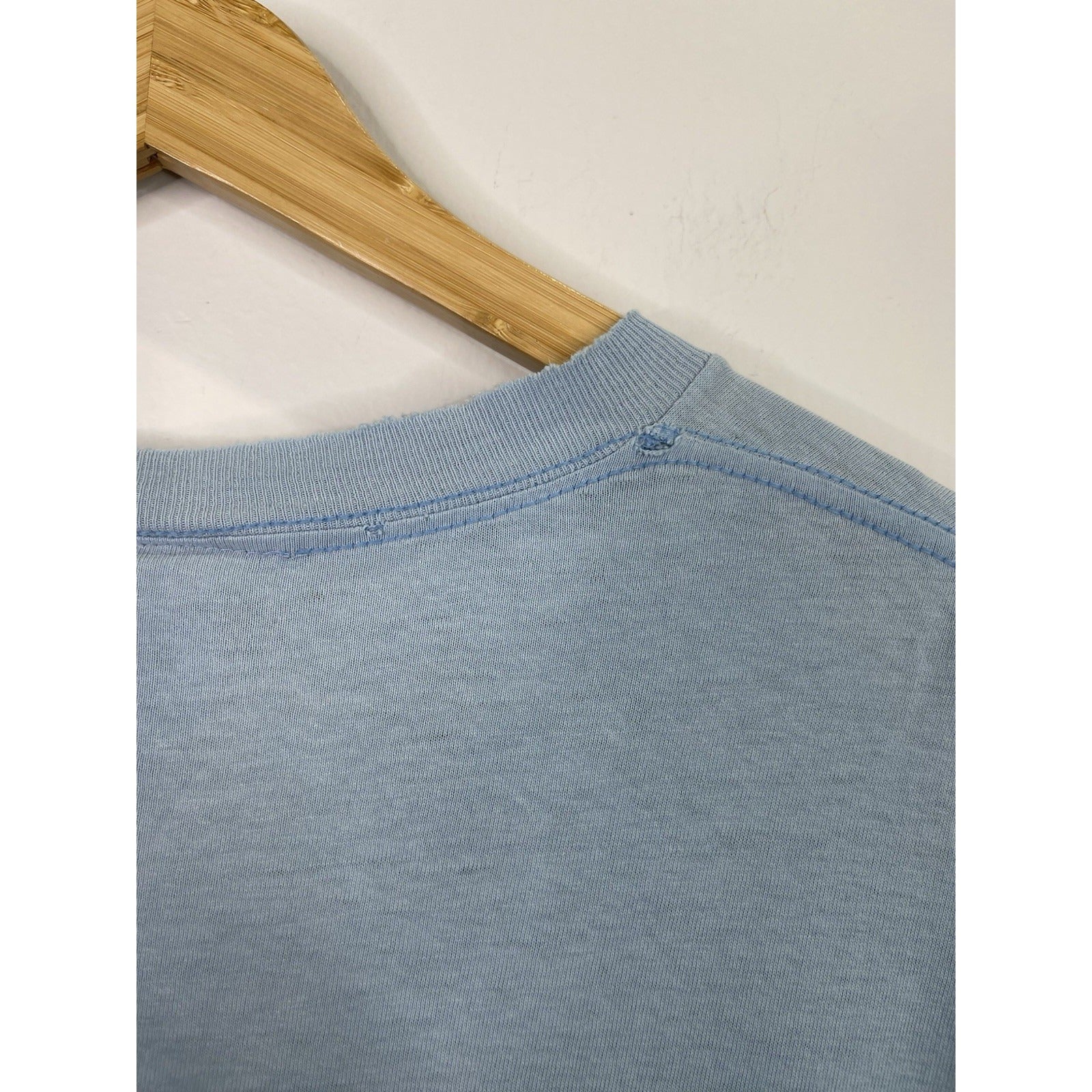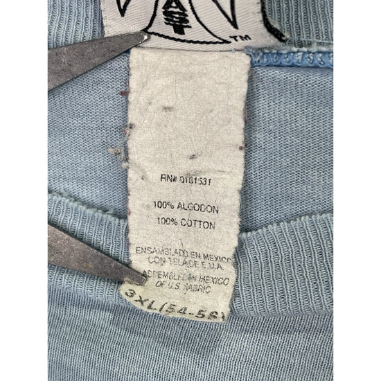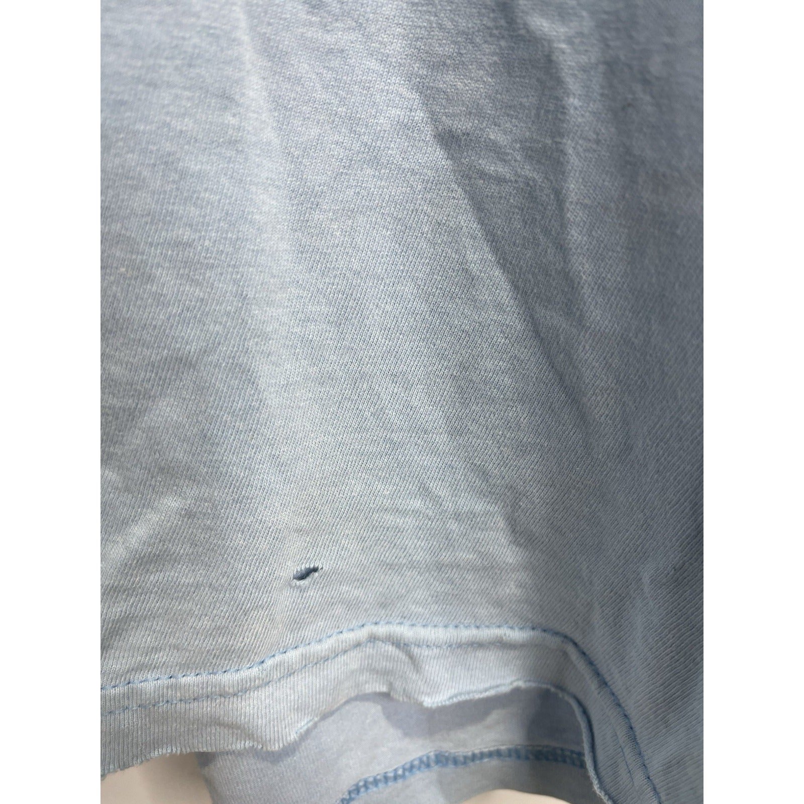The Vintage Mens Light Blue 3XL Jesse Who West Coast Choppers T-shirt is a graphic print shirt featuring the character Jesse from the West Coast Choppers brand. Made of cotton with a crew neck and short sleeves, this regular fit t-shirt is designed for motorcycle and biker enthusiasts. The vintage style and 90s theme make it a versatile piece suitable for all seasons and a unique addition to any man's wardrobe.