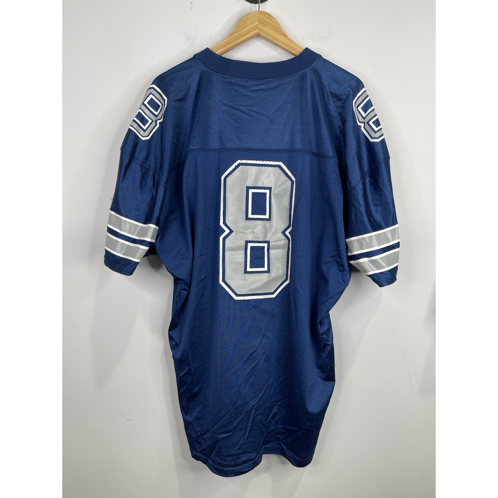 The product is a vintage men's Dallas Cowboys navy blue Champion jersey featuring player Troy Aikman. This officially licensed NFL apparel is of size 52 and is a must-have for any fan of the Dallas Cowboys. Made in the United States, this jersey is a classic piece that showcases your team spirit and pays homage to a legendary player like Troy Aikman. Perfect for wearing during the regular season or as a collector's item, this jersey is a timeless piece for any football enthusiast.