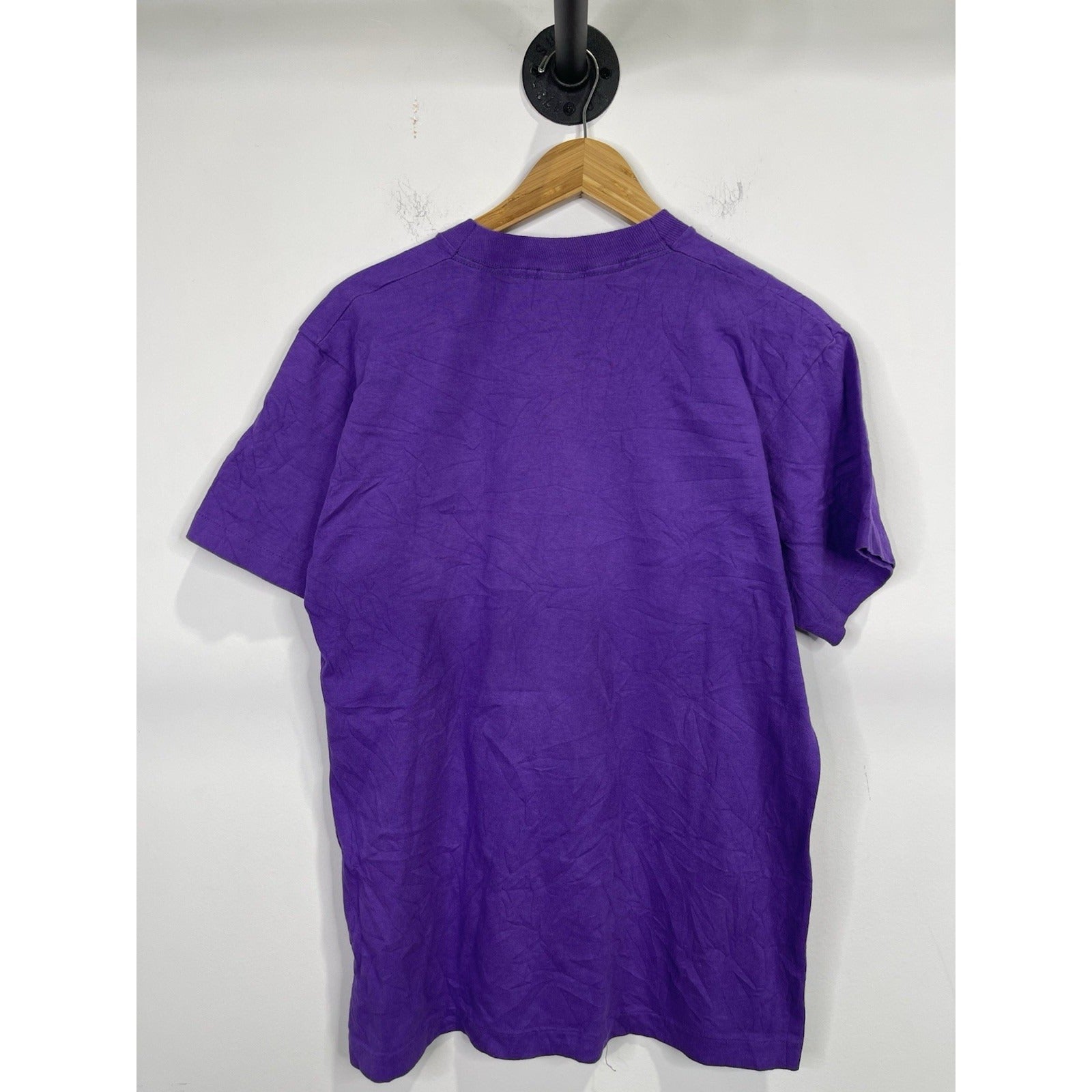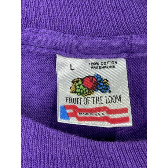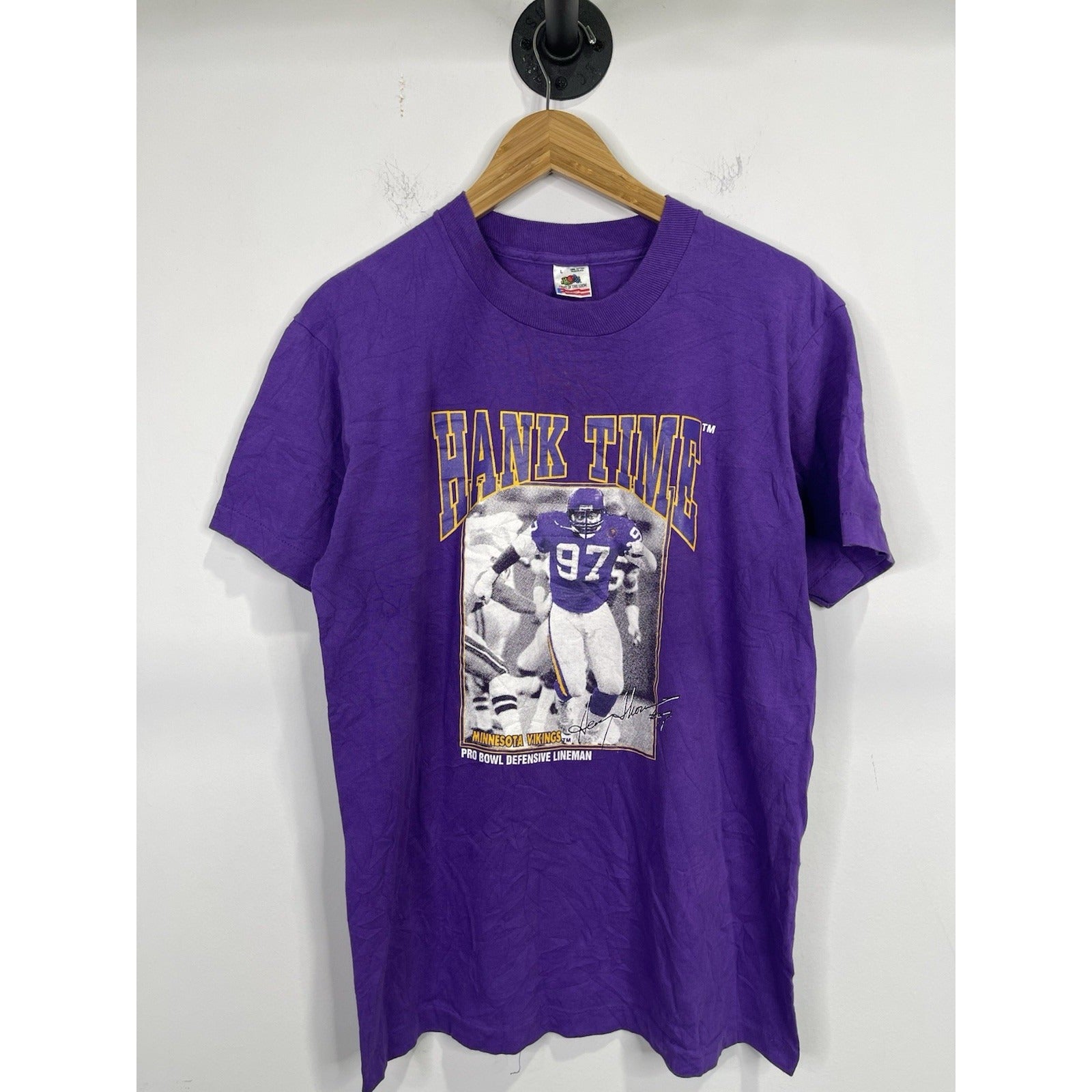 This vintage Minnesota Vikings shirt for men in gray features a graphic print of the Vikings logo, representing the iconic NFL team. Made of cotton, this short sleeve tee is machine washable and suitable for all seasons. With a classic 90s retro design, this shirt is perfect for fans of the Vikings looking to add a piece of sports history to their wardrobe. Made in the United States by Fruit of the Loom, this shirt is a must-have for any die-hard Vikings supporter.