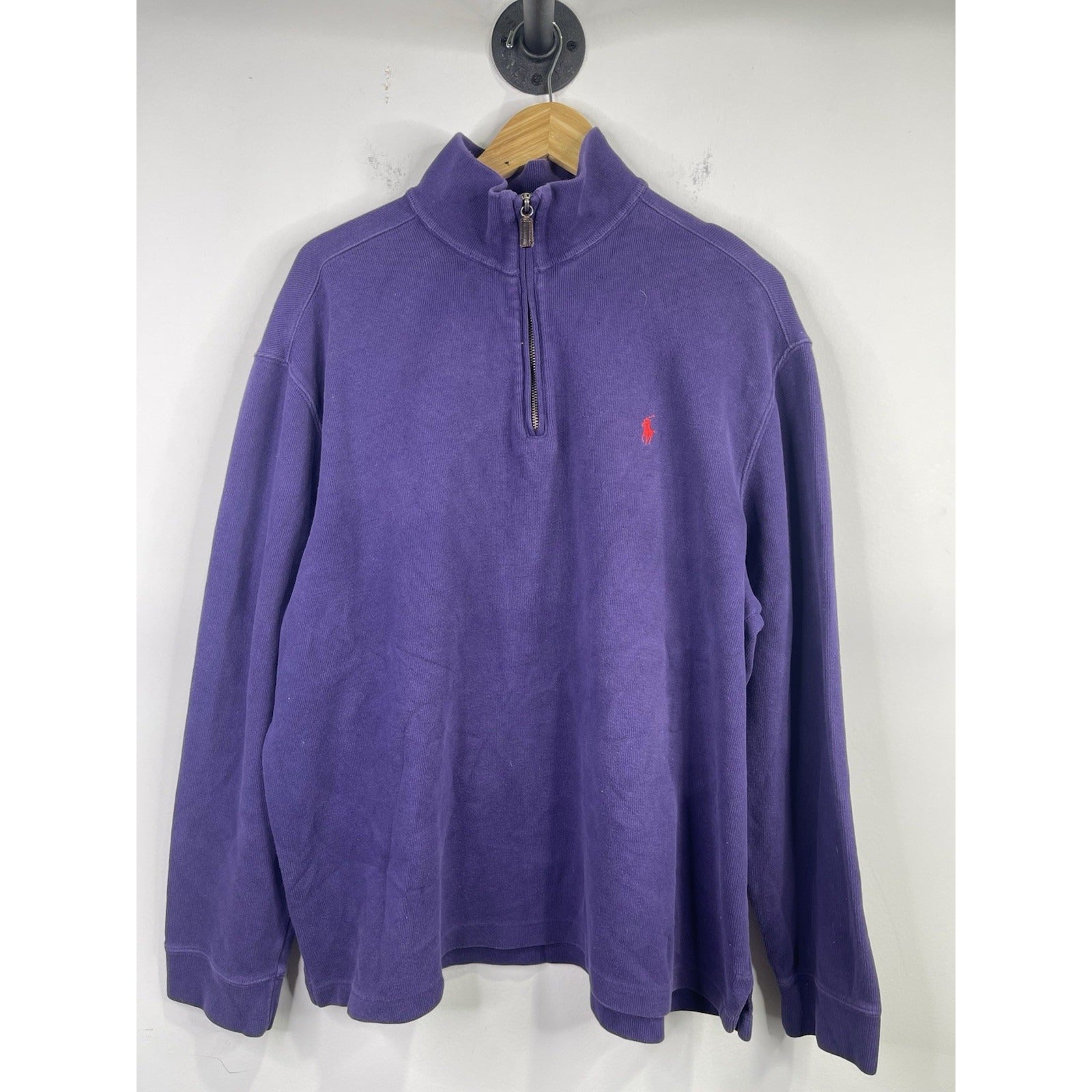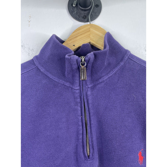This Vintage Polo by Ralph Lauren sweater is a stylish and versatile addition to any man's wardrobe. Made from tight-knit cotton fleece, this long sleeve sweater features a high neck with a 1/4 zip closure, making it perfect for casual occasions in all seasons. The slim fit and classic solid purple color, accented with the brand's iconic logo, add a timeless touch to this pullover sweater.