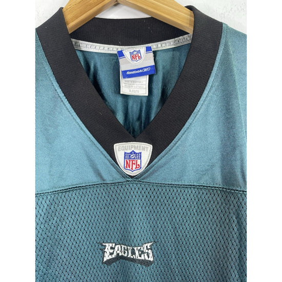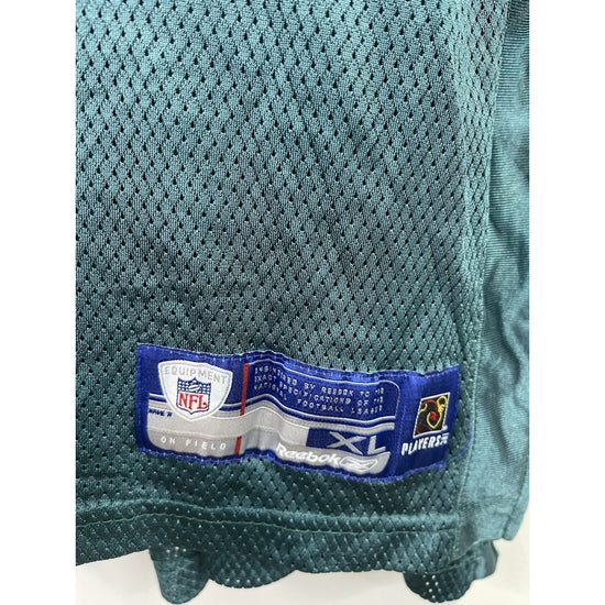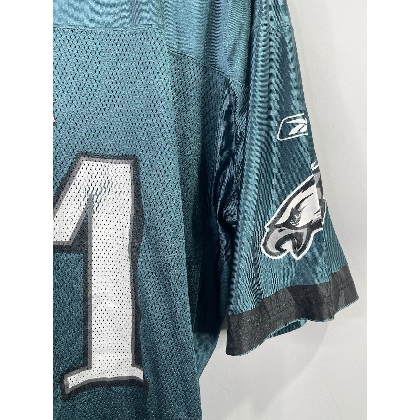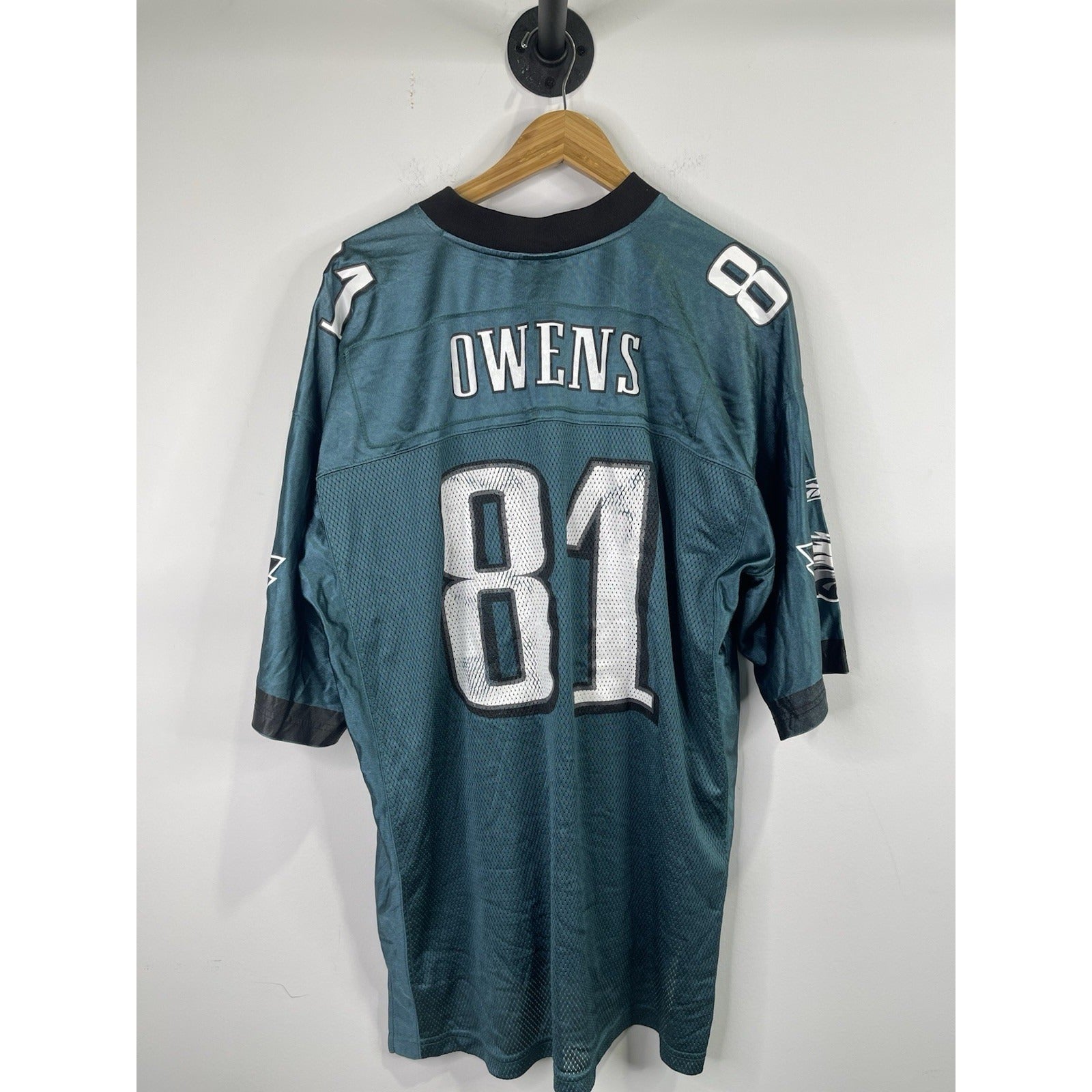 The product is a vintage Reebok Terrell Owens Philadelphia Eagles jersey in size XL and green color. This officially licensed NFL fan apparel features the iconic Philadelphia Eagles team logo and is made in Korea. Suitable for men and perfect for wearing during the regular season games, this jersey is a must-have for any Eagles fan looking to show their team spirit.