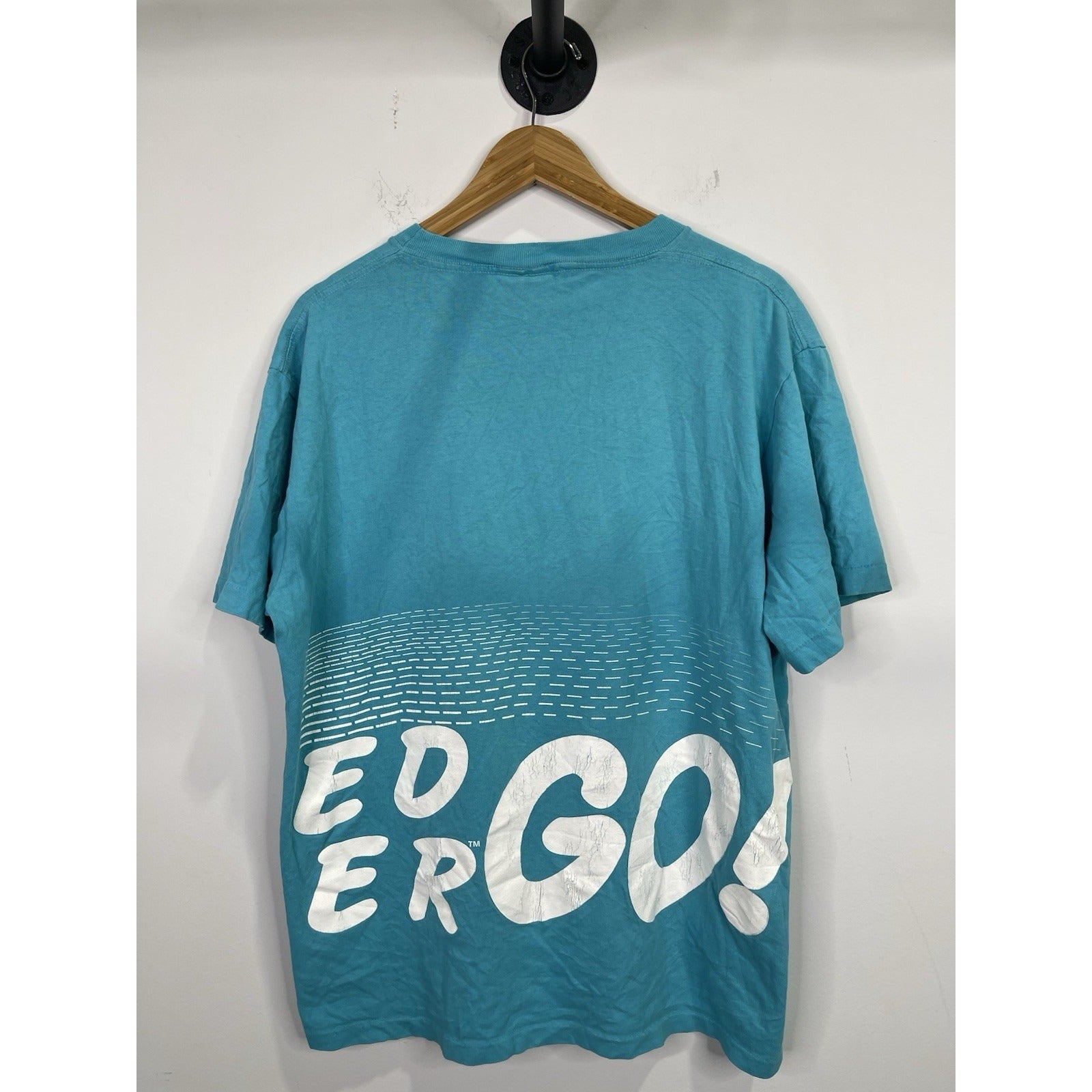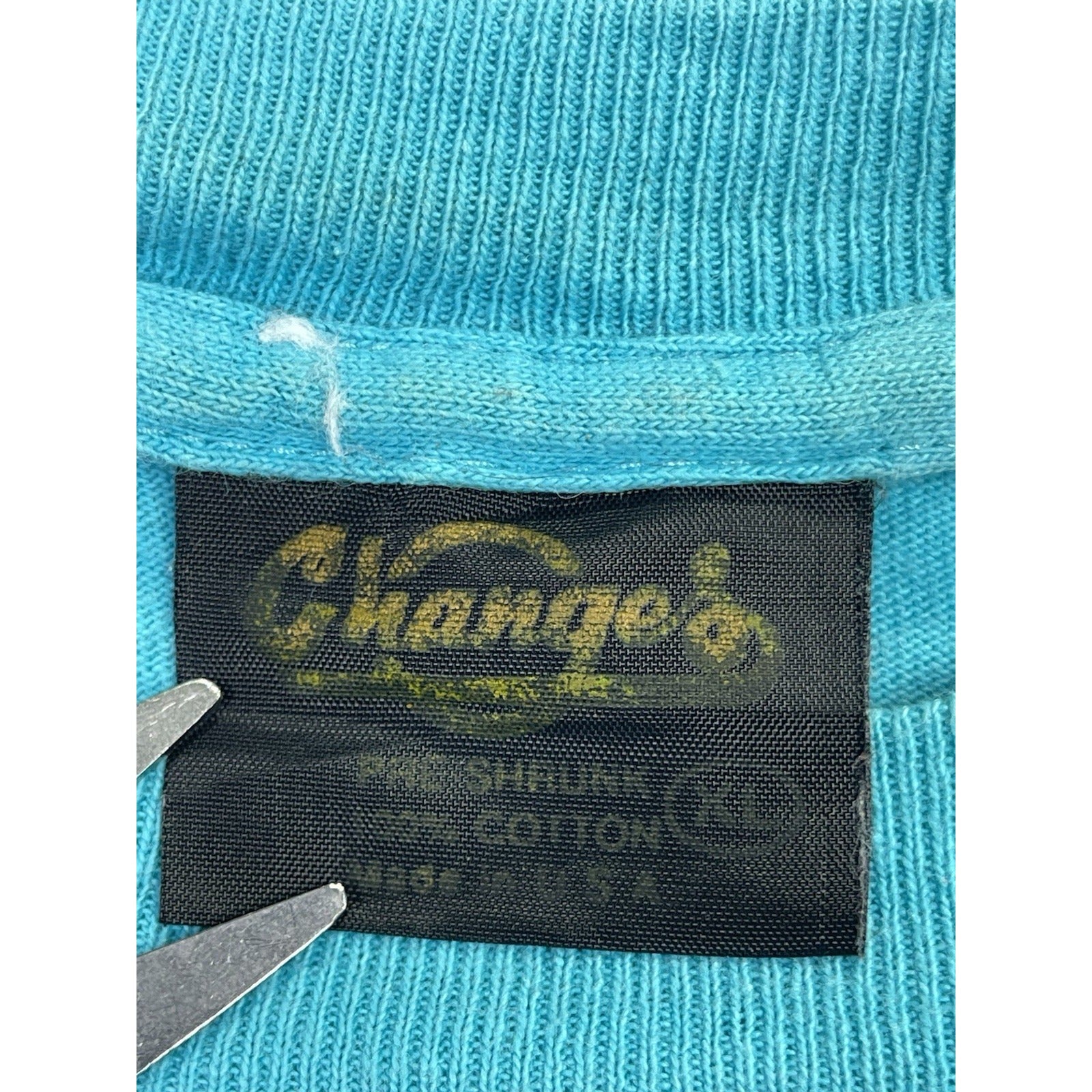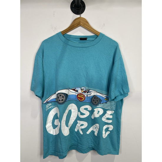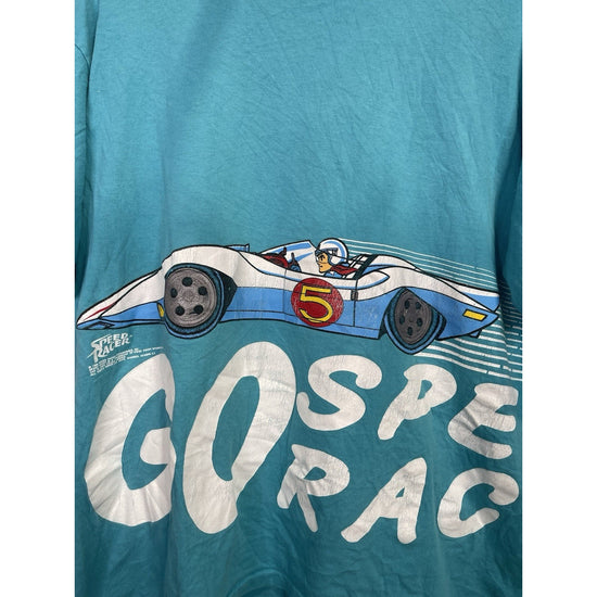 The Vintage Speed Racer 1993 Shirt is a unique retro piece featuring an all-over print of the beloved character Speed Racer. Made of cotton in a vibrant teal color, this shirt is a size XL with a crew neckline and short sleeves, perfect for a regular fit. Ideal for fans of 90s cartoons and anime, this vintage shirt is a nostalgic addition to any collection, representing the iconic Speed Racer Racer model. Made in the United States, this shirt is a must-have for collectors and enthusiasts of classic animation.