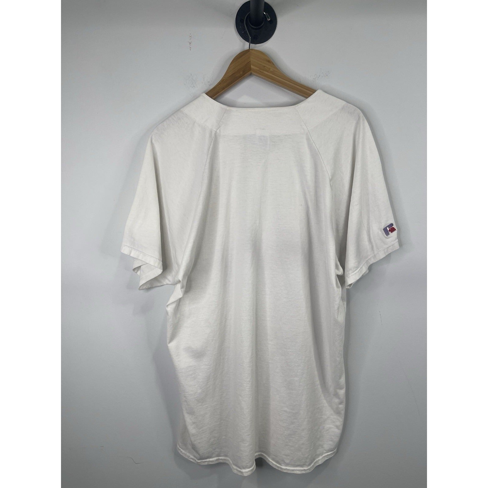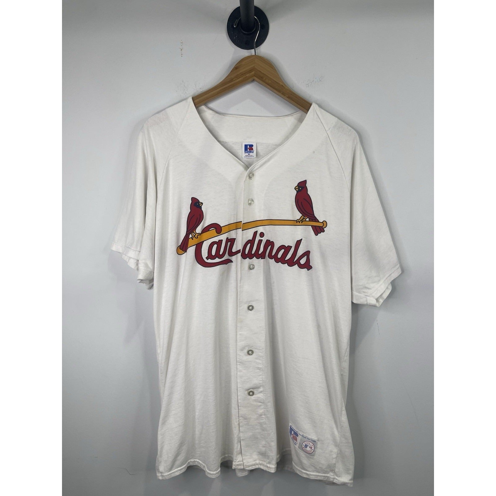 This Vintage St. Louis Cardinals Shirt is a classic men's XL button-up from the brand Russell Athletic. The retro-themed shirt features a striped blue pattern with a V-neckline and short sleeves, made from comfortable cotton knit fabric. This vintage piece is perfect for fans of the St. Louis Cardinals or anyone looking to add a touch of nostalgia to their wardrobe. Made in the United States, this shirt exudes a timeless style with a button-down collar and a regular fit for a comfortable and classic look.