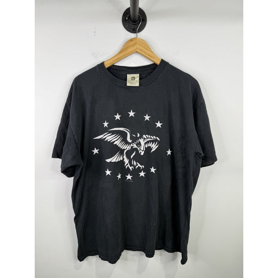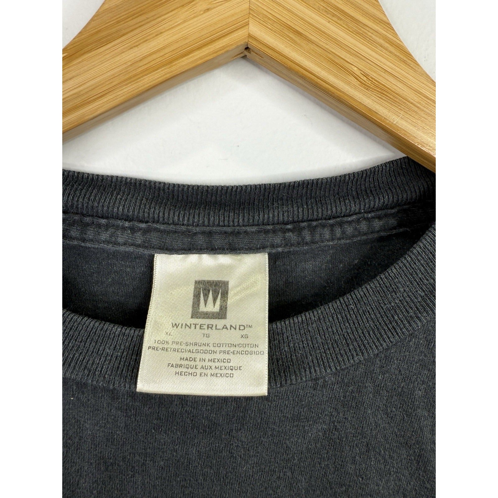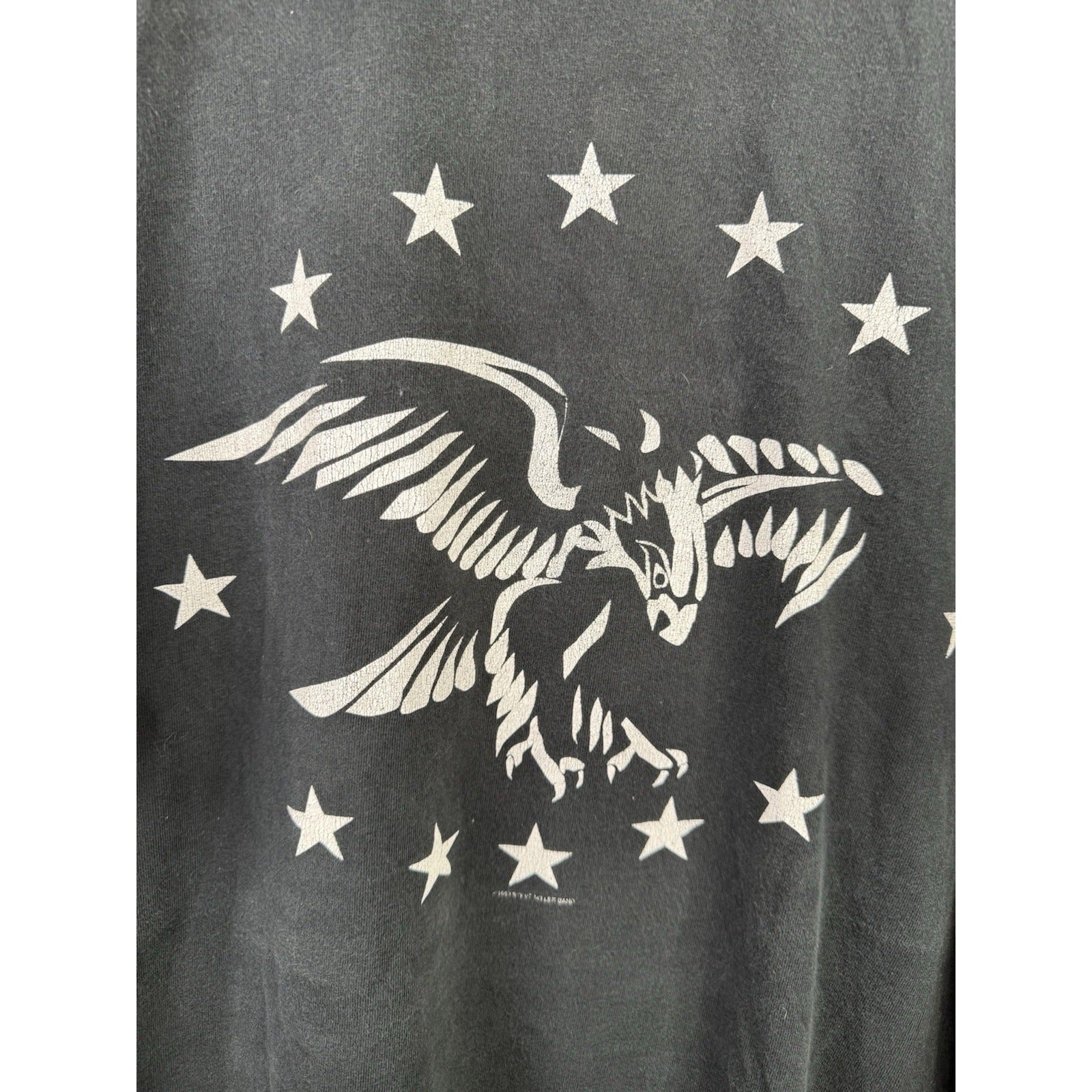 This Vintage 1999 Steve Miller Band 'Fly Like an Eagle' T-shirt in size XL is a classic piece for any fan of the band. Made by Winterland, this regular fit shirt features a black color with a band theme. The short sleeve design and vintage style make it a nostalgic and unique addition to any music lover's wardrobe. Made in Mexico, this shirt showcases the iconic Steve character associated with the Steve Miller Band.