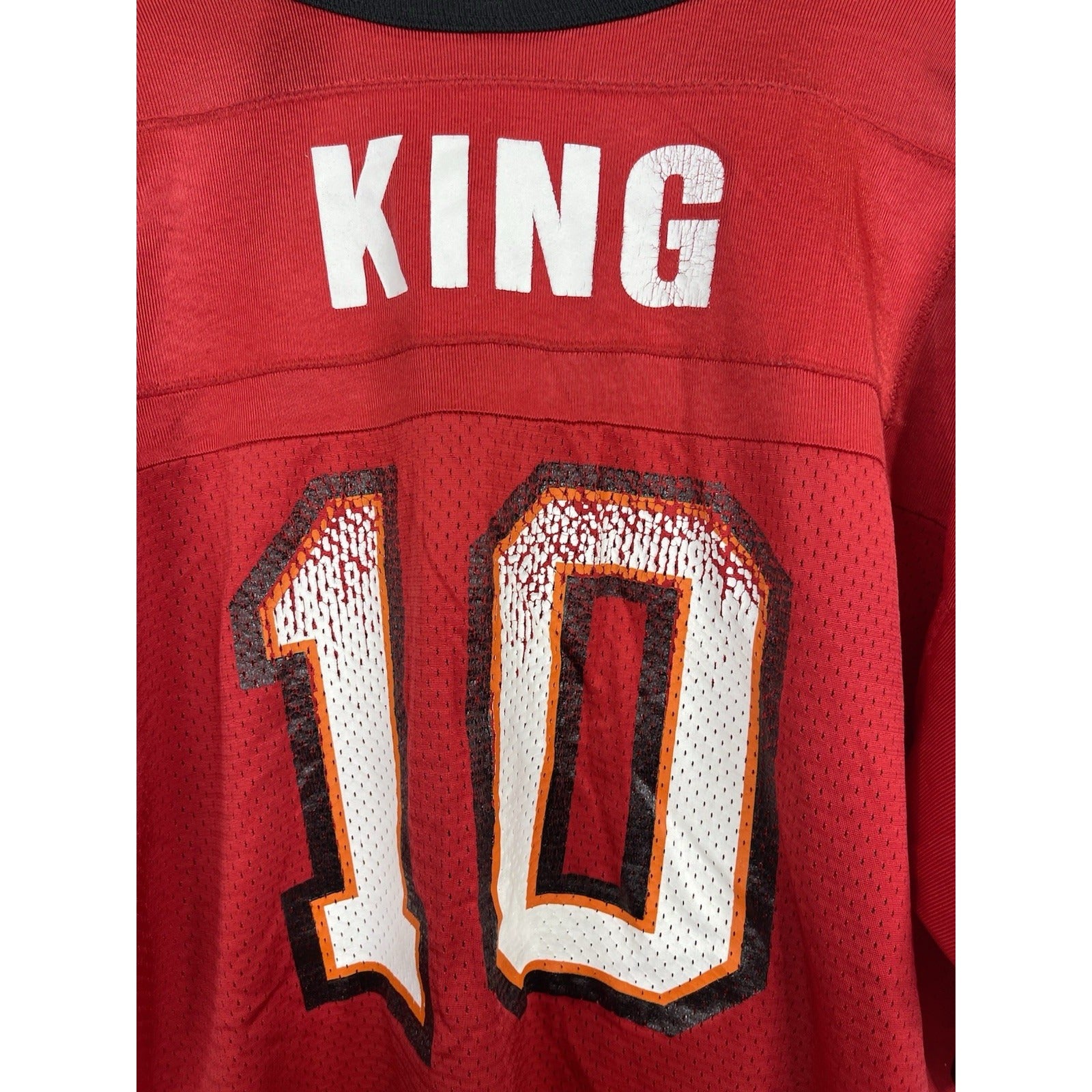 This product is a vintage Tampa Bay Buccaneers jersey in size Medium, made by Adidas and features the player name "King". The jersey is officially licensed by the National Football League (NFL) and is perfect for men who are fans of the Tampa Bay Buccaneers team. The red color and classic design make it a must-have for any football enthusiast looking to show their support for their favorite team during the regular season games.