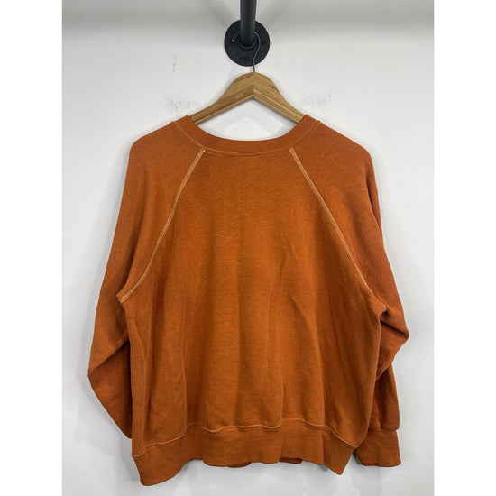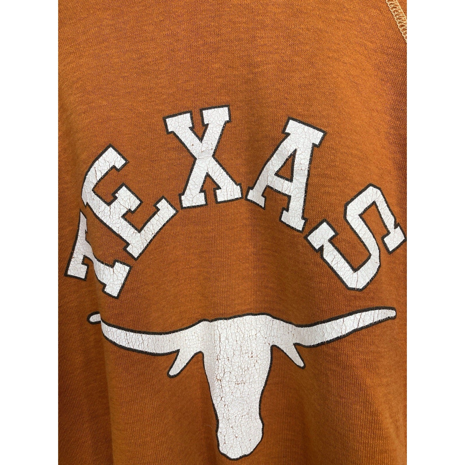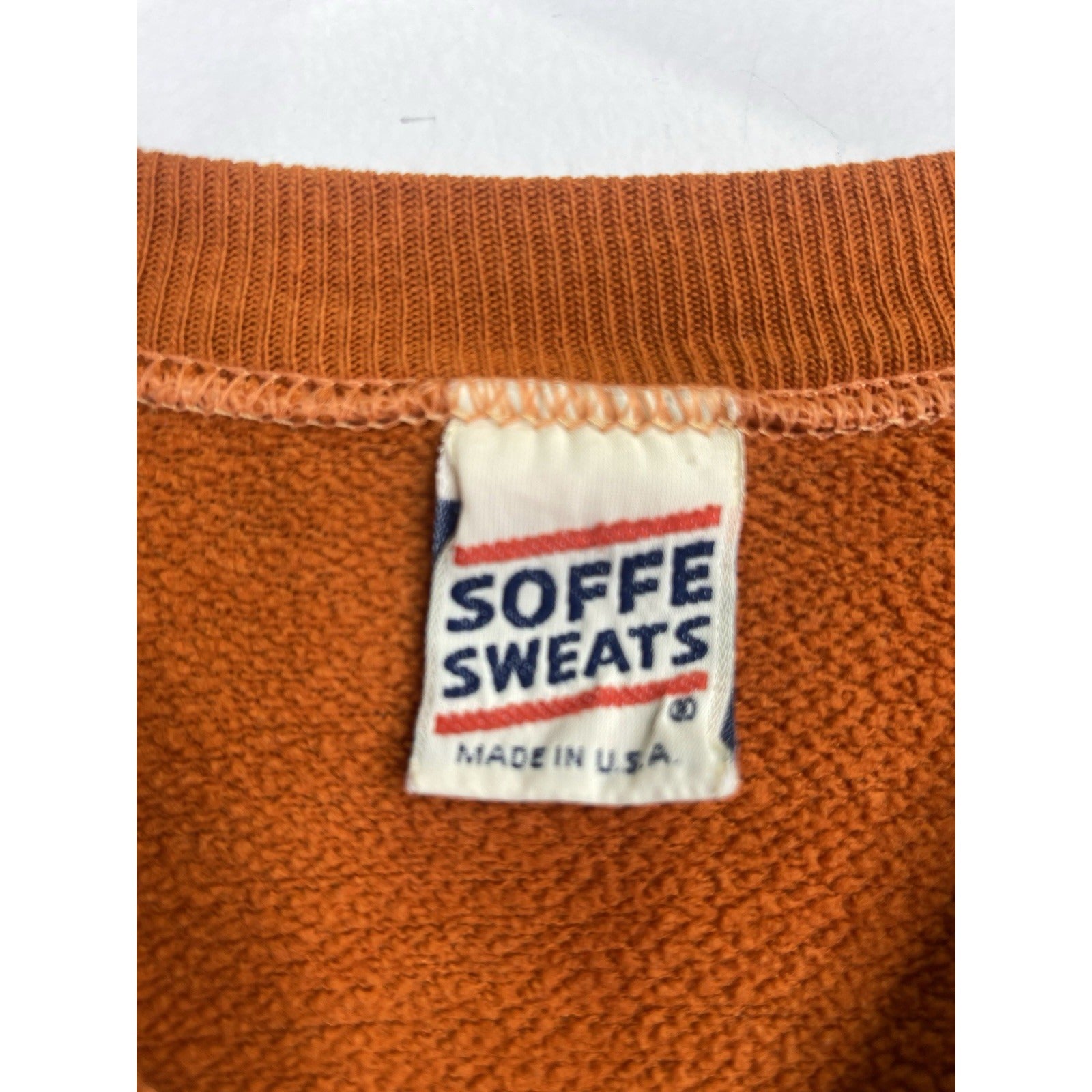 The product is a vintage Texas Long Horns orange pullover sweatshirt in size large, made by Soffe in the United States. It features a graphic print of the university's logo, making it a perfect choice for fans of the team or those who appreciate vintage clothing. The sweatshirt is made of cozy fleece fabric, providing warmth and comfort for cooler days. With its classic pullover style and vibrant orange color, this sweatshirt is a must-have for any Texas Long Horns enthusiast.