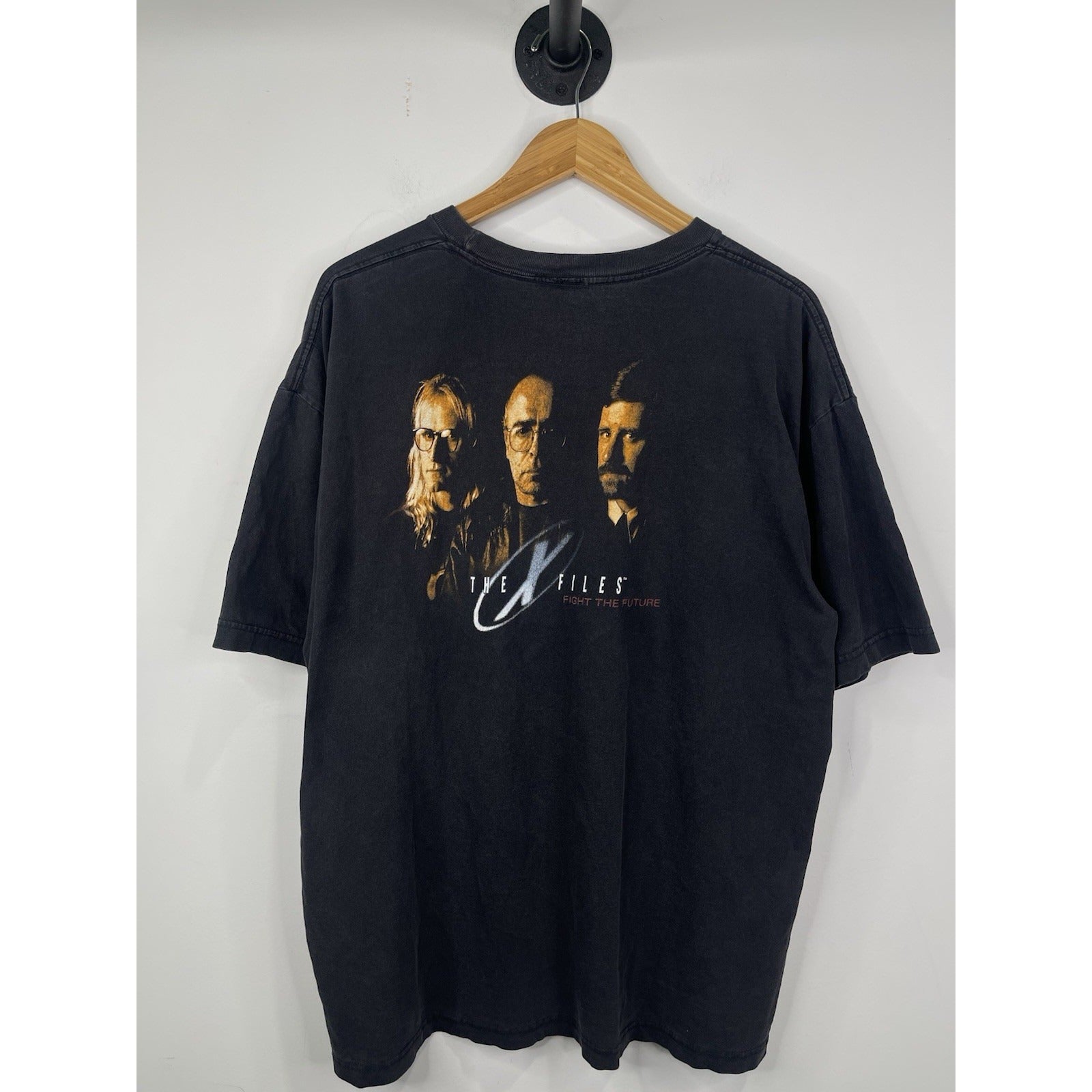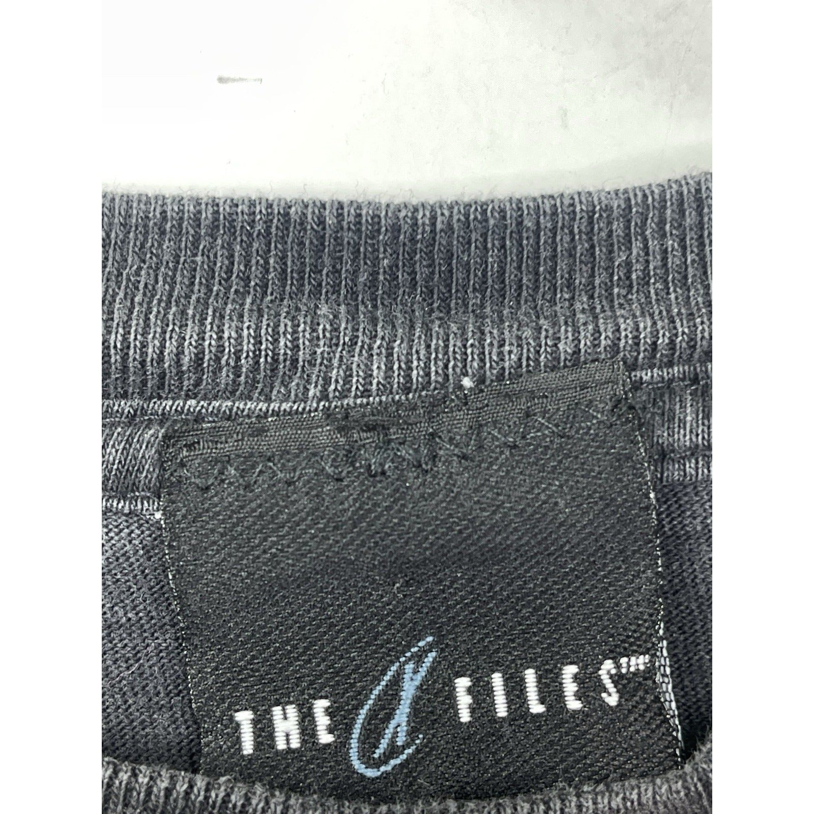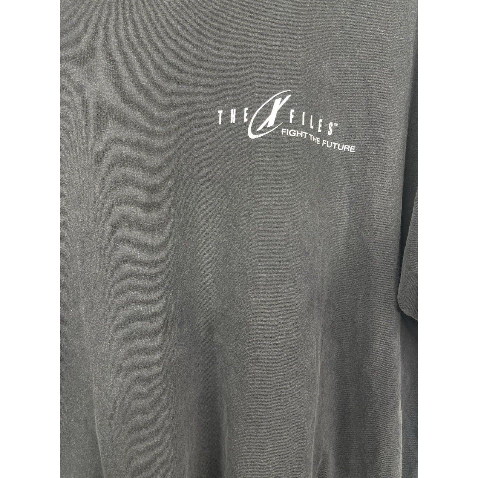 This vintage The X Files T-shirt from 1998 features a faded graphic print with characters from the popular TV show. Made of cotton and featuring a crew neck and short sleeves, this black shirt is perfect for fans of The X Files and vintage movie promo merchandise. The regular fit and easy care instructions make it a comfortable and stylish addition to any wardrobe, representing a piece of 90s TV history with its nostalgic design and tie-in to the Twentieth Century Fox production.
