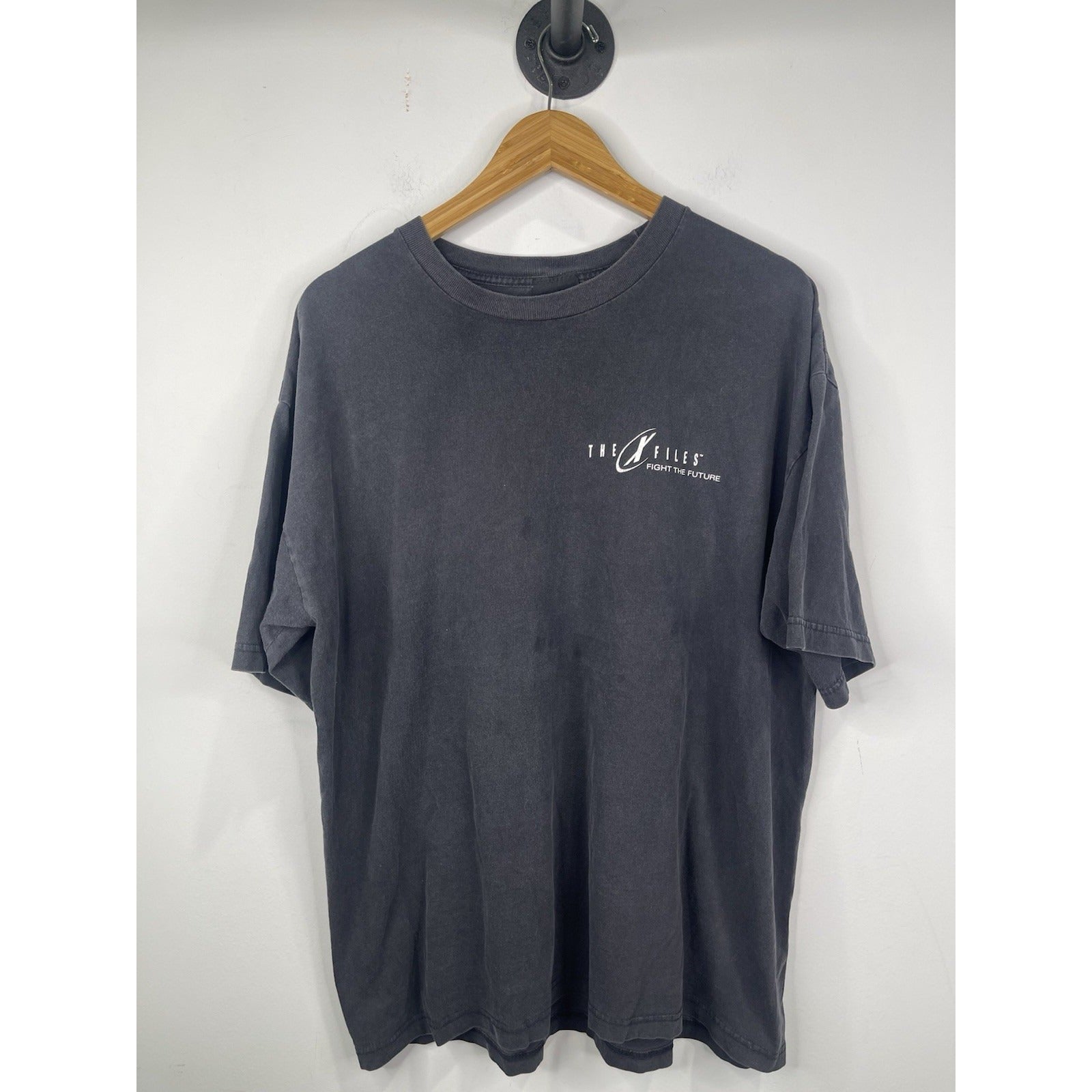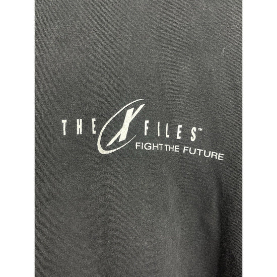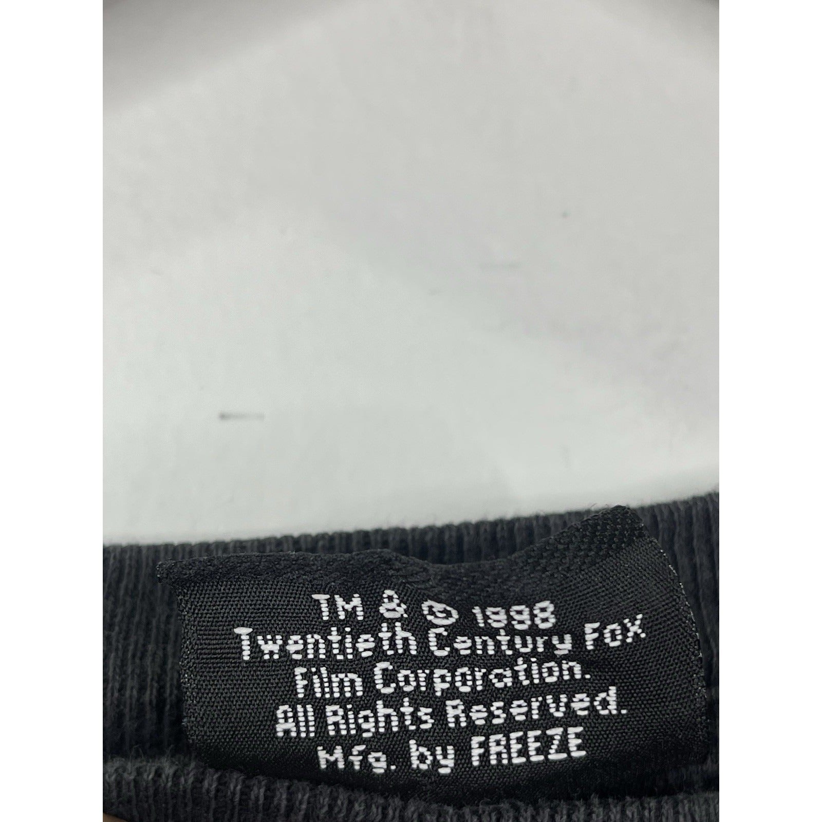 This vintage The X Files T-shirt from 1998 features a faded graphic print with characters from the popular TV show. Made of cotton and featuring a crew neck and short sleeves, this black shirt is perfect for fans of The X Files and vintage movie promo merchandise. The regular fit and easy care instructions make it a comfortable and stylish addition to any wardrobe, representing a piece of 90s TV history with its nostalgic design and tie-in to the Twentieth Century Fox production.