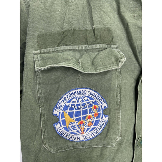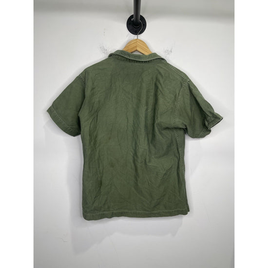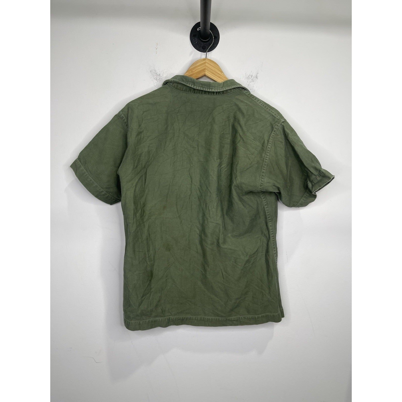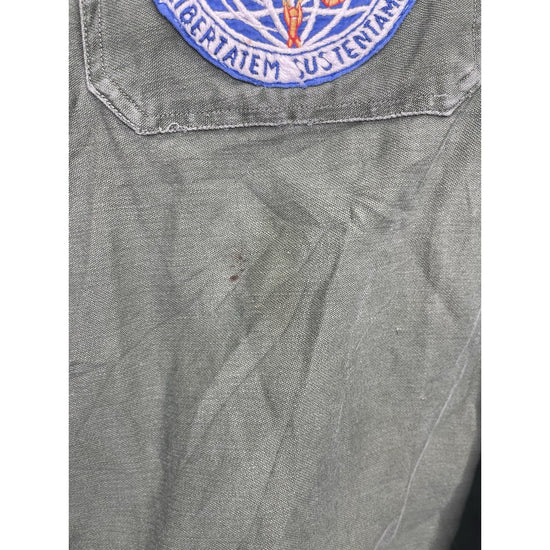 The product is a vintage United States Air Force USAF air defense green cotton short sleeve shirt in size medium. This collectible item falls under the theme of militaria, specifically representing the Air Force Branch. Made in the United States, this shirt is a piece of military history that may appeal to collectors or enthusiasts of military uniforms and accessories.