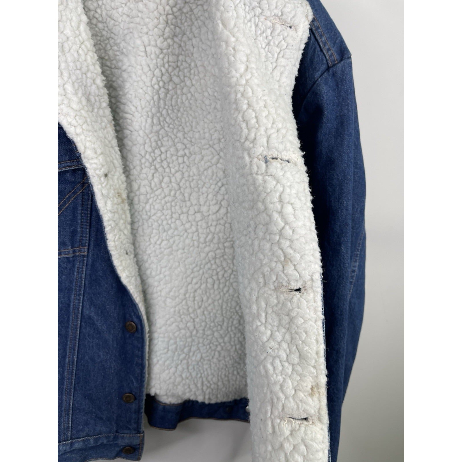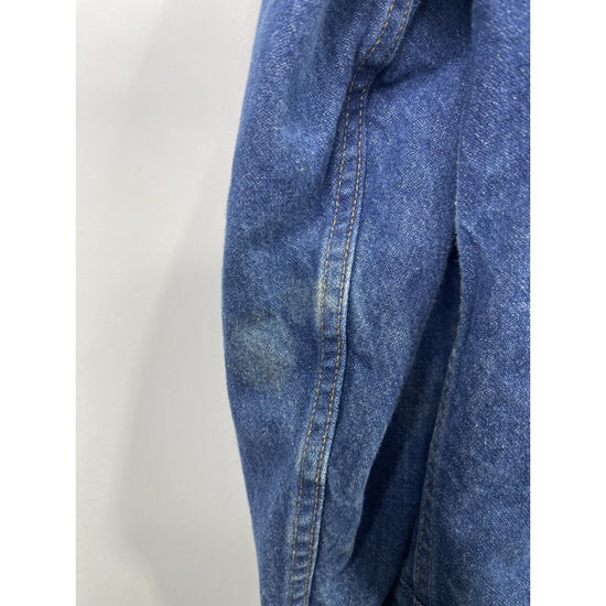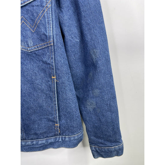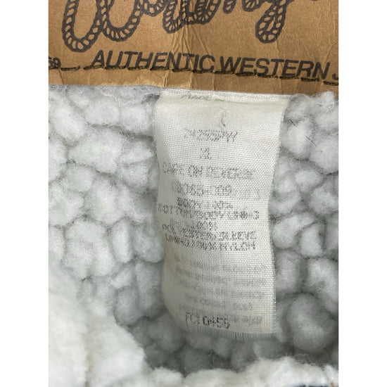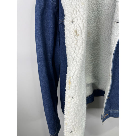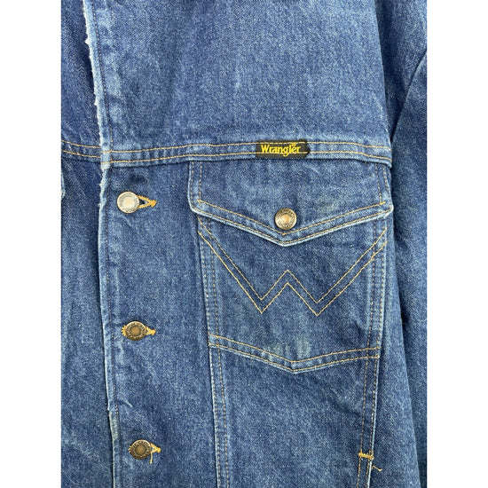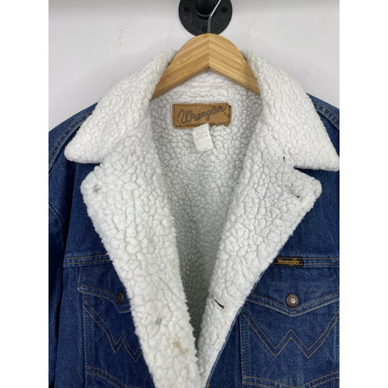 This vintage Wrangler Jacket is a stylish and classic addition to any man's wardrobe. Made with durable cotton denim and lined with cozy polyester sherpa, it offers both comfort and warmth. The blue color and solid pattern give it a timeless Western feel, perfect for casual or workwear occasions. Featuring a collared bomber jacket style with adjustable waist and pockets, this rugged piece is ideal for outdoor activities and riding. With its 90s vintage charm and iconic Wrangler brand, this jacket is a must-have for any classic denim enthusiast.