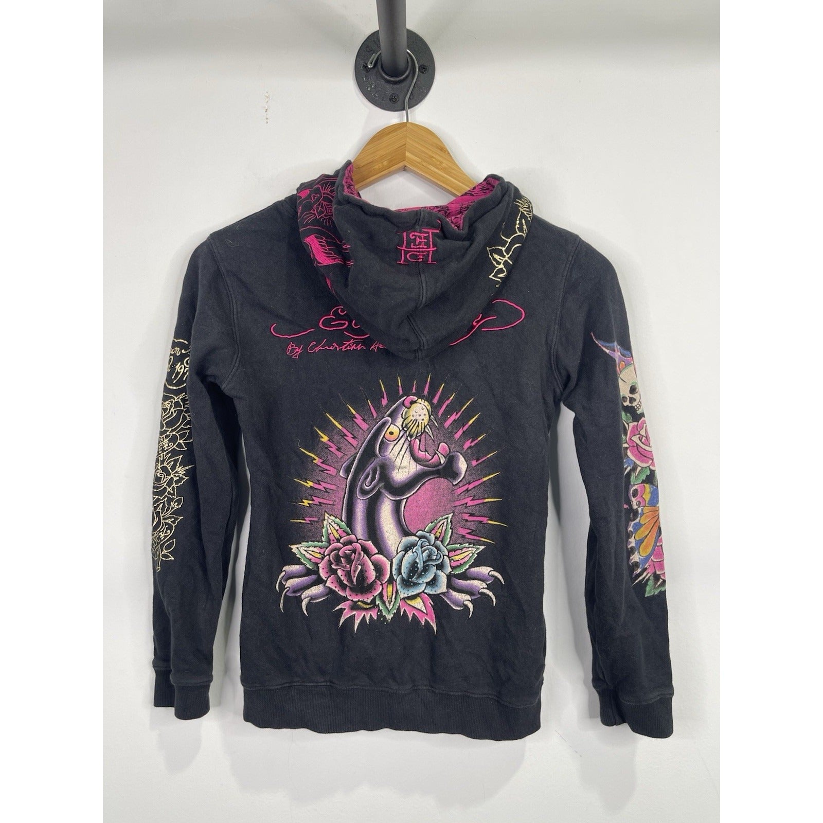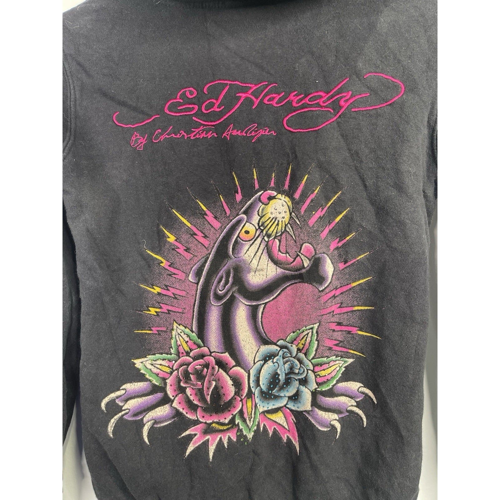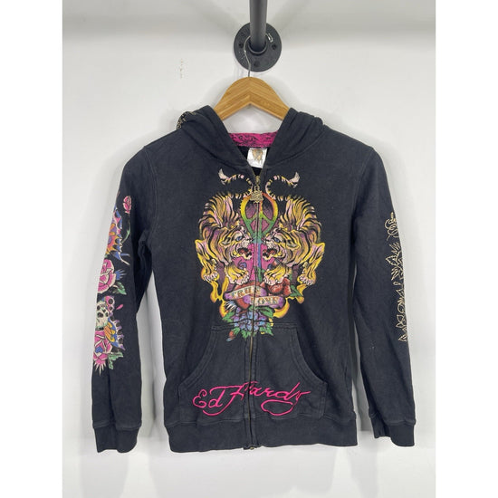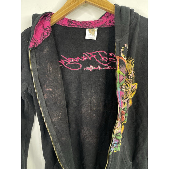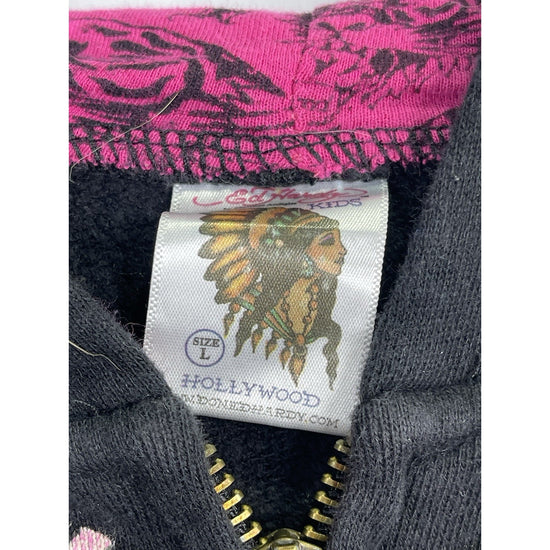 The Vintage/Y2k Ed Hardy Kids True Love Panther Zip-up Hoodie in Size Large is a stylish and unique sweater for girls. Made from 100% cotton fleece material, this black hoodie features a long sleeve, full zip closure, and a hood for added comfort. The graphic print design with a panther character and love theme adds a fun and trendy touch to this vintage piece from the Ed Hardy brand. Perfect for adding a touch of personality to any little girl's wardrobe.