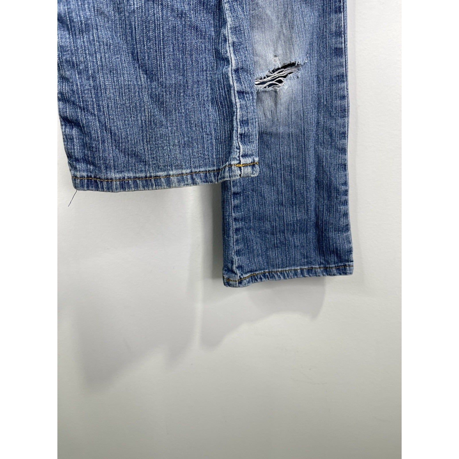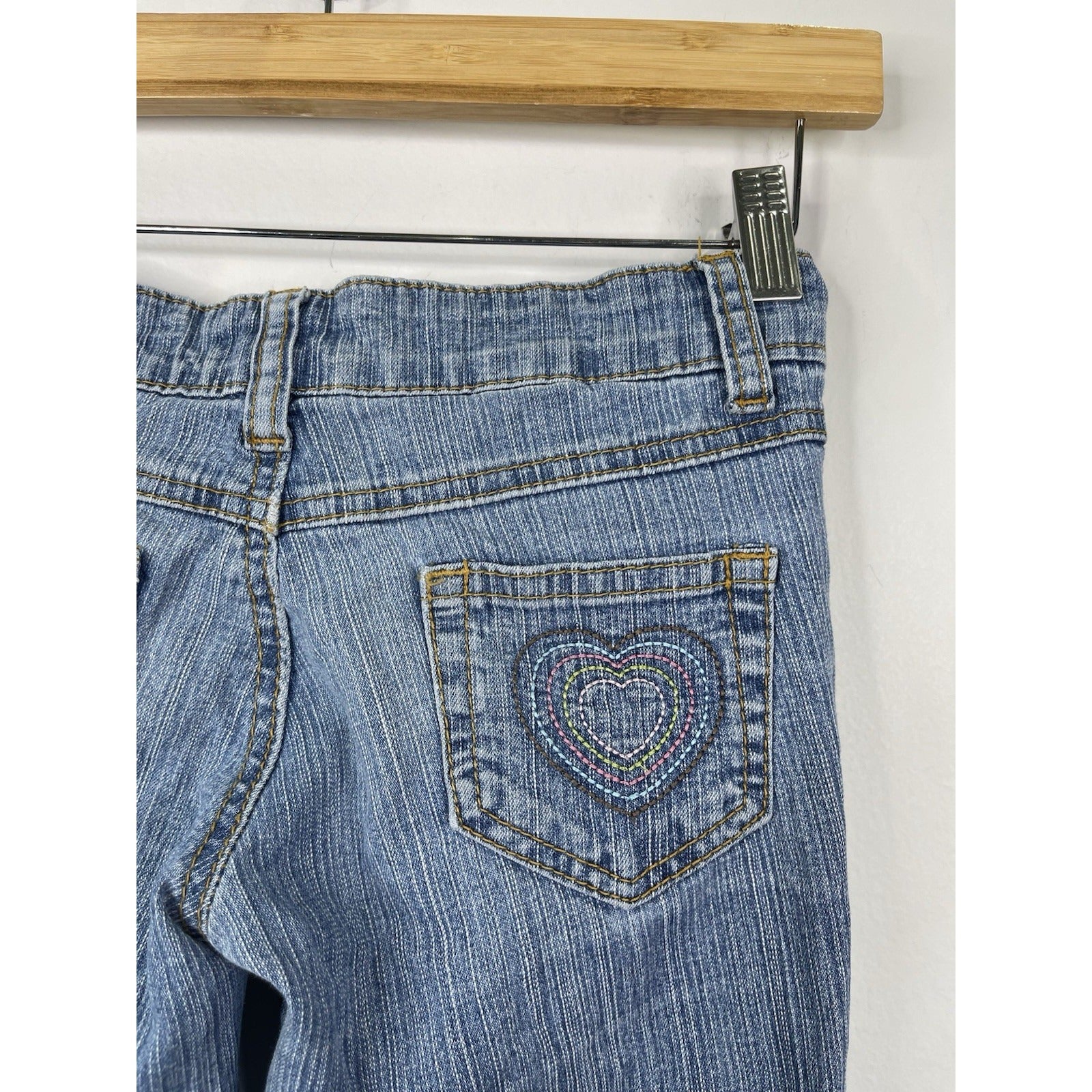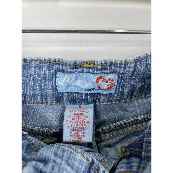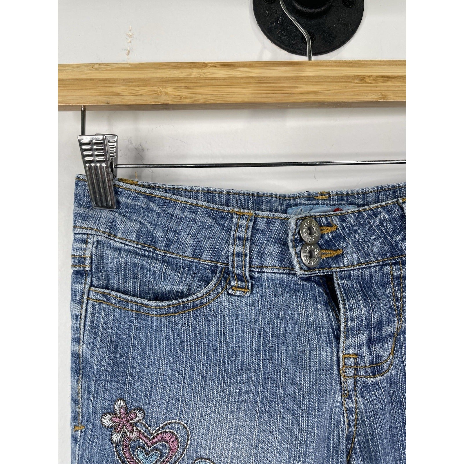 These Vintage Y2K Youth Blue Heart Light Wash Embroidered Denim Bootcut Jeans in size 8 are a stylish and fun addition to any girl's wardrobe. Made from a blend of polyester, ramie, and cotton, these jeans feature a solid blue color with embroidered heart details, perfect for a casual and trendy look. The bootcut style and regular fit make them comfortable for everyday wear, while the zip closure adds convenience. Perfect for school or any casual occasion, these vintage jeans are a unique and playful choice for young girls.