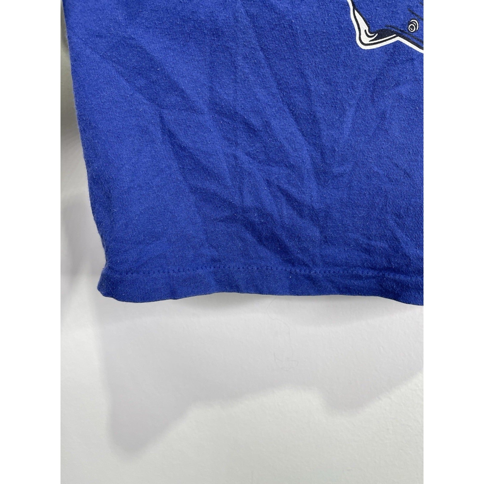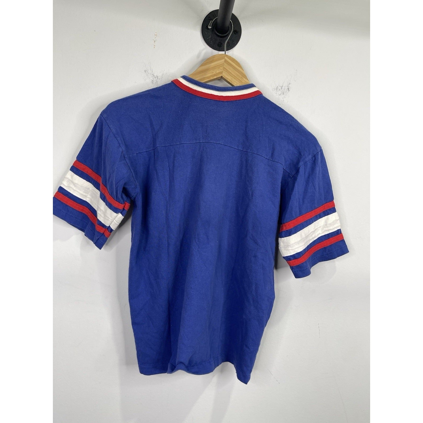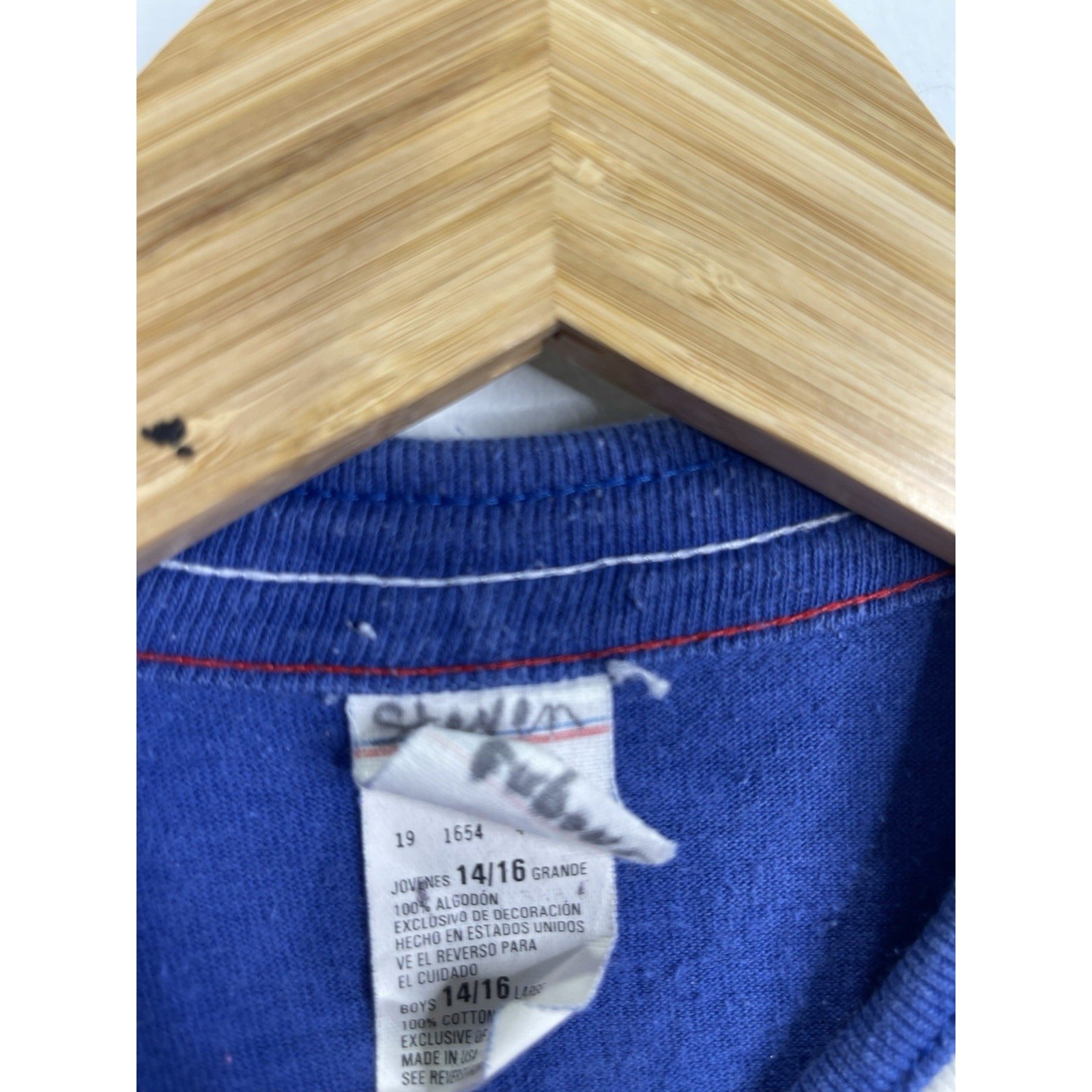 This Vintage Youth Blue New England Patriots GTS T-Shirt Jersey in size 14-16 is an officially licensed product of the National Football League (NFL). Made for football fans and specifically featuring the New England Patriots team, this unisex children's jersey is perfect for showing support during the regular season games. Made in the USA, this jersey in the iconic blue color is a must-have for any young fan looking to represent their favorite team on game day.
