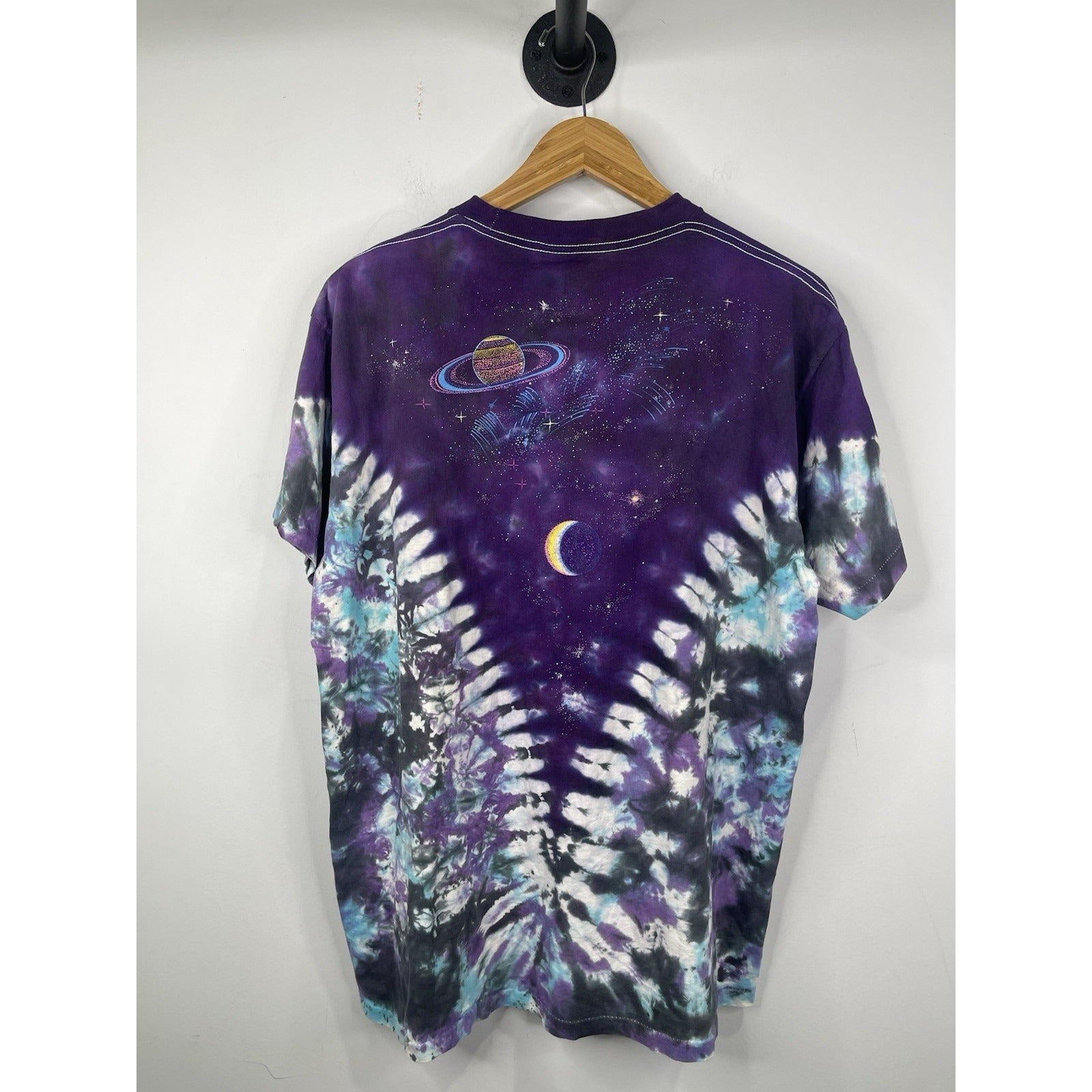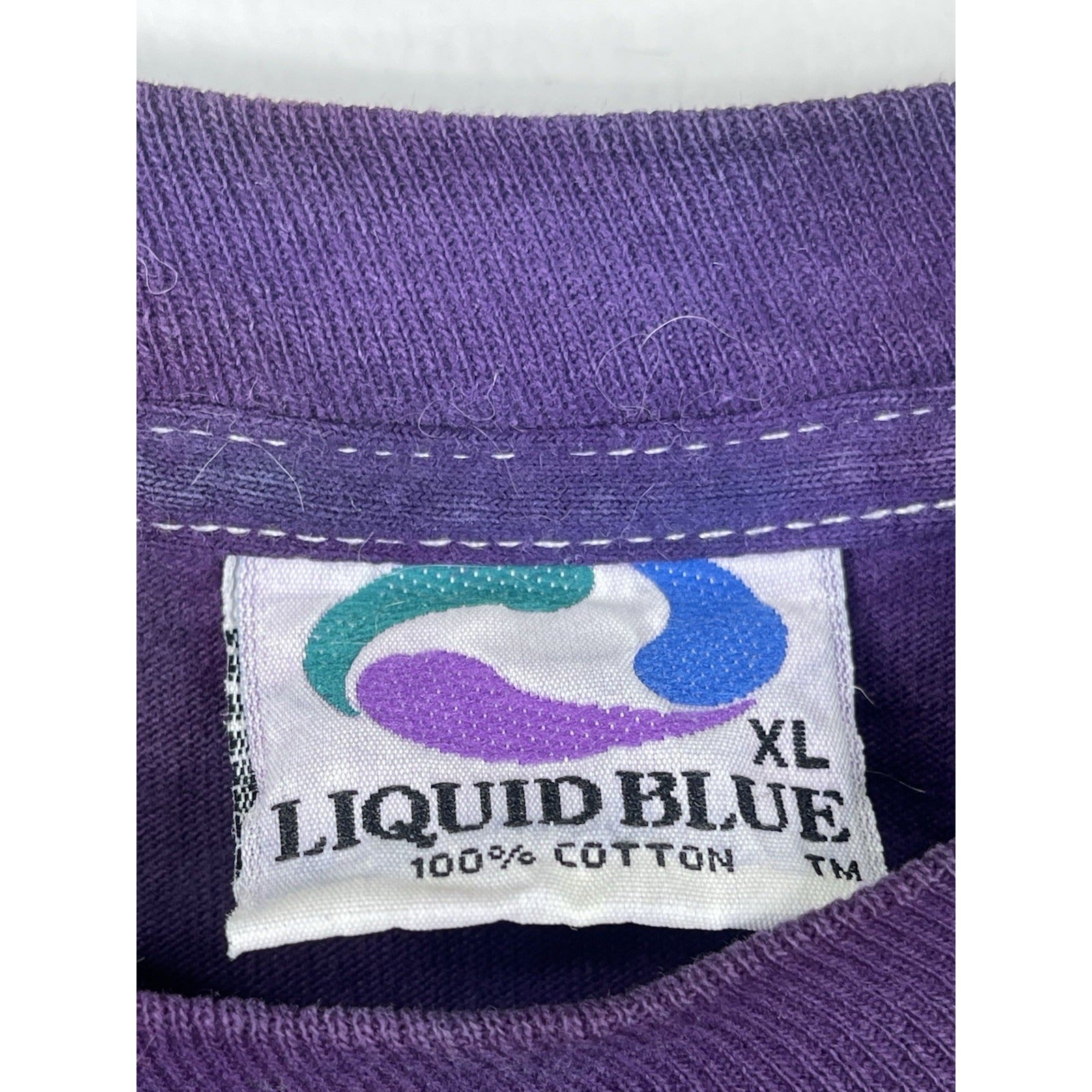 This vintage 90's Liquid Blue all over print galaxy space purple tie-dye t-shirt in size XL features a graphic design with a space theme. Made of cotton with a crew neckline and short sleeves, it offers a regular fit and is suitable for all seasons. The shirt is perfect for men who appreciate retro clothing with a vibrant space character, making it a standout addition to any wardrobe. Made in the United States, this t-shirt embodies the unique style and innovation of the 90's era.