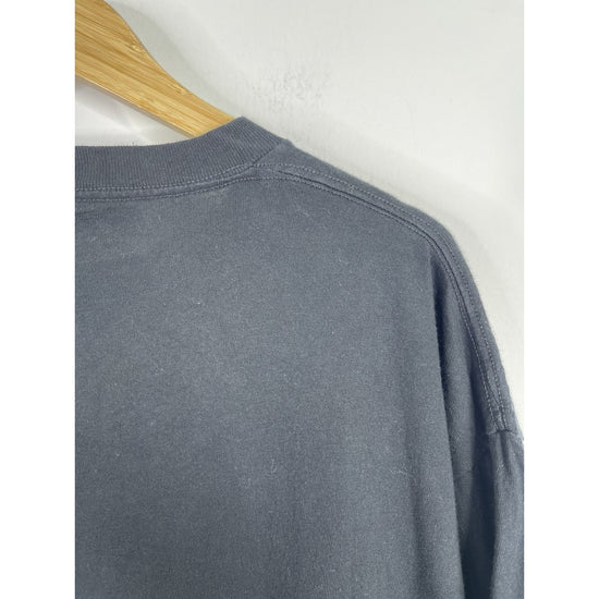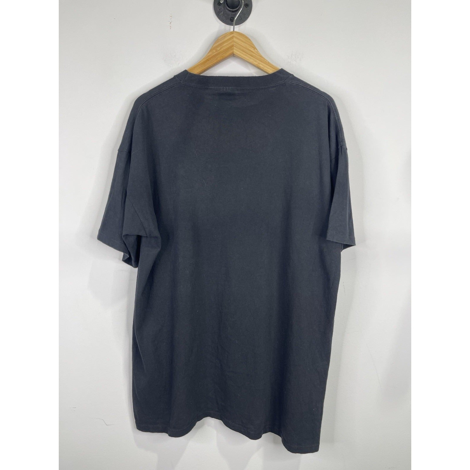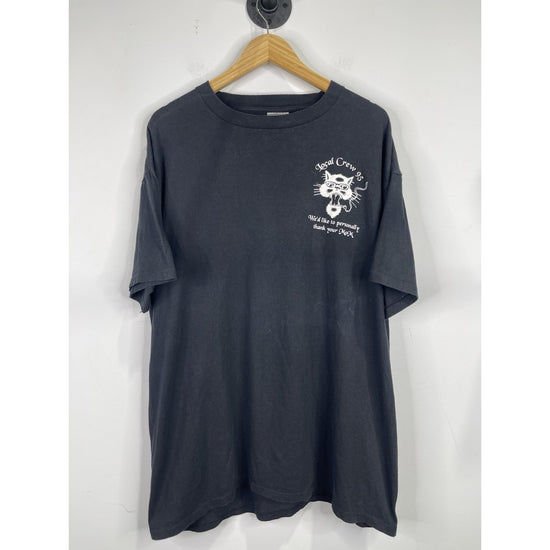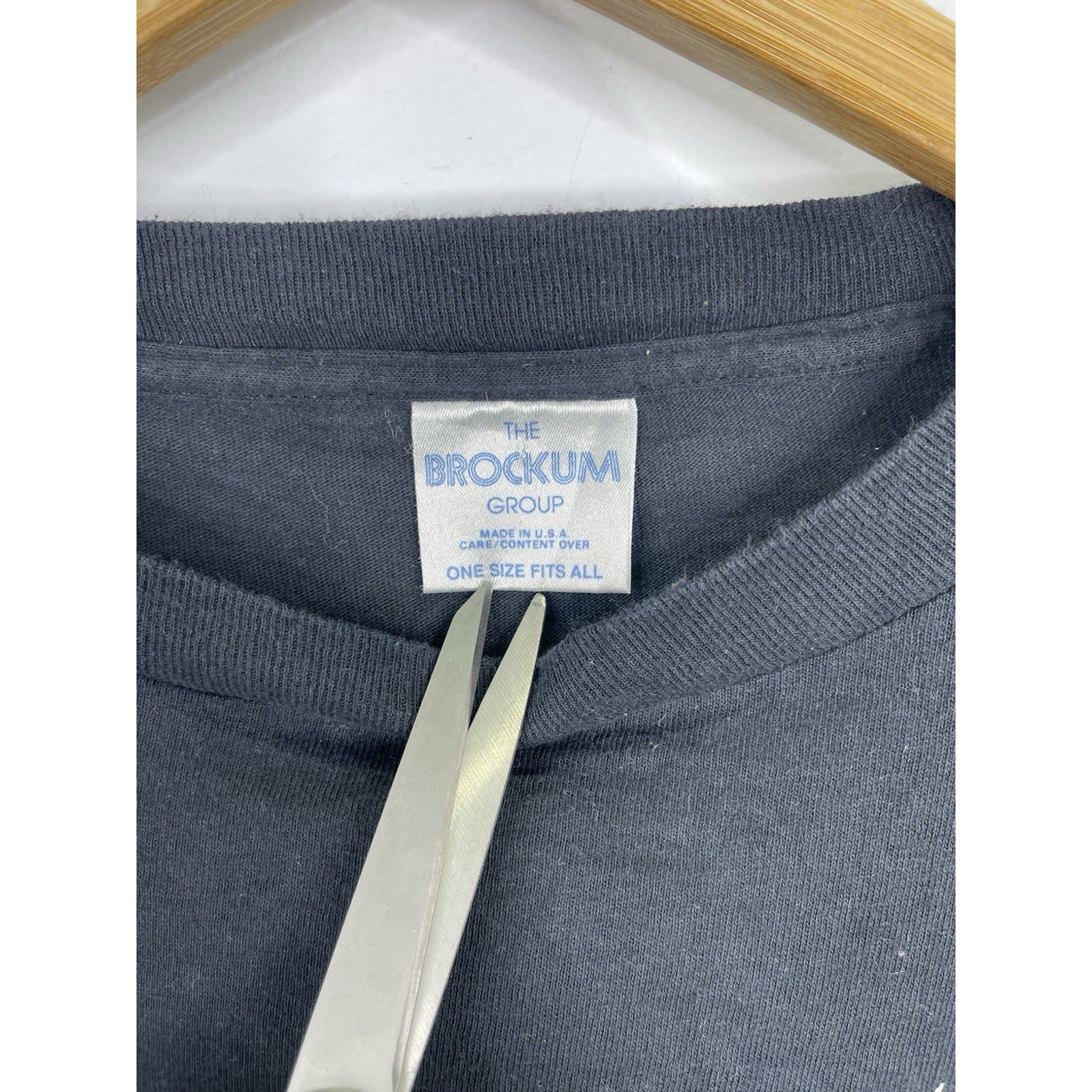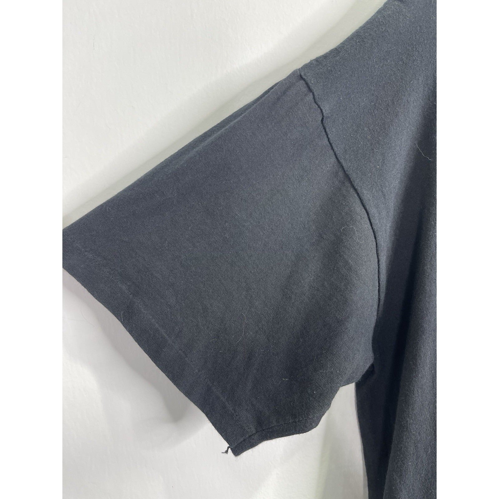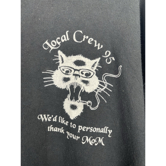 The VTG Back Stage Local Crew 1995 Black Cat Logo T-Shirt is a vintage piece featuring a solid black color with a crew neck and short sleeves. Made of cotton, this regular fit shirt showcases a graphic print of a black cat logo, perfect for fans of music and the occult. One size fits all, this unisex shirt from Brockum is a stylish addition to any wardrobe, suitable for all seasons. Made in the United States, this T-shirt is a unique find for those who appreciate retro fashion and music memorabilia.