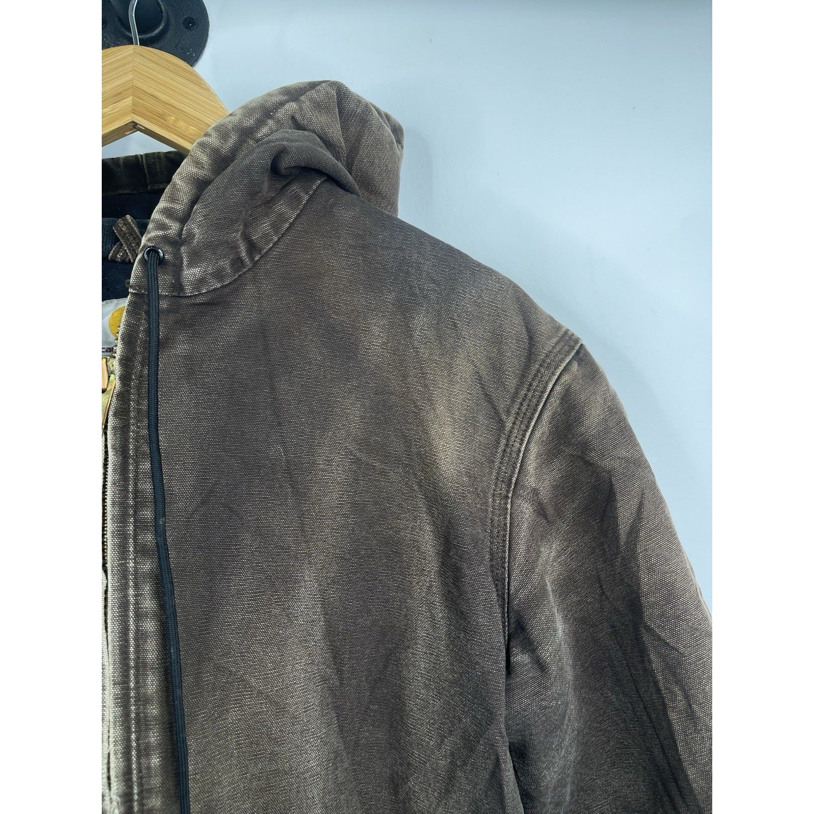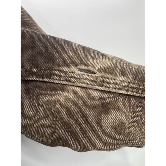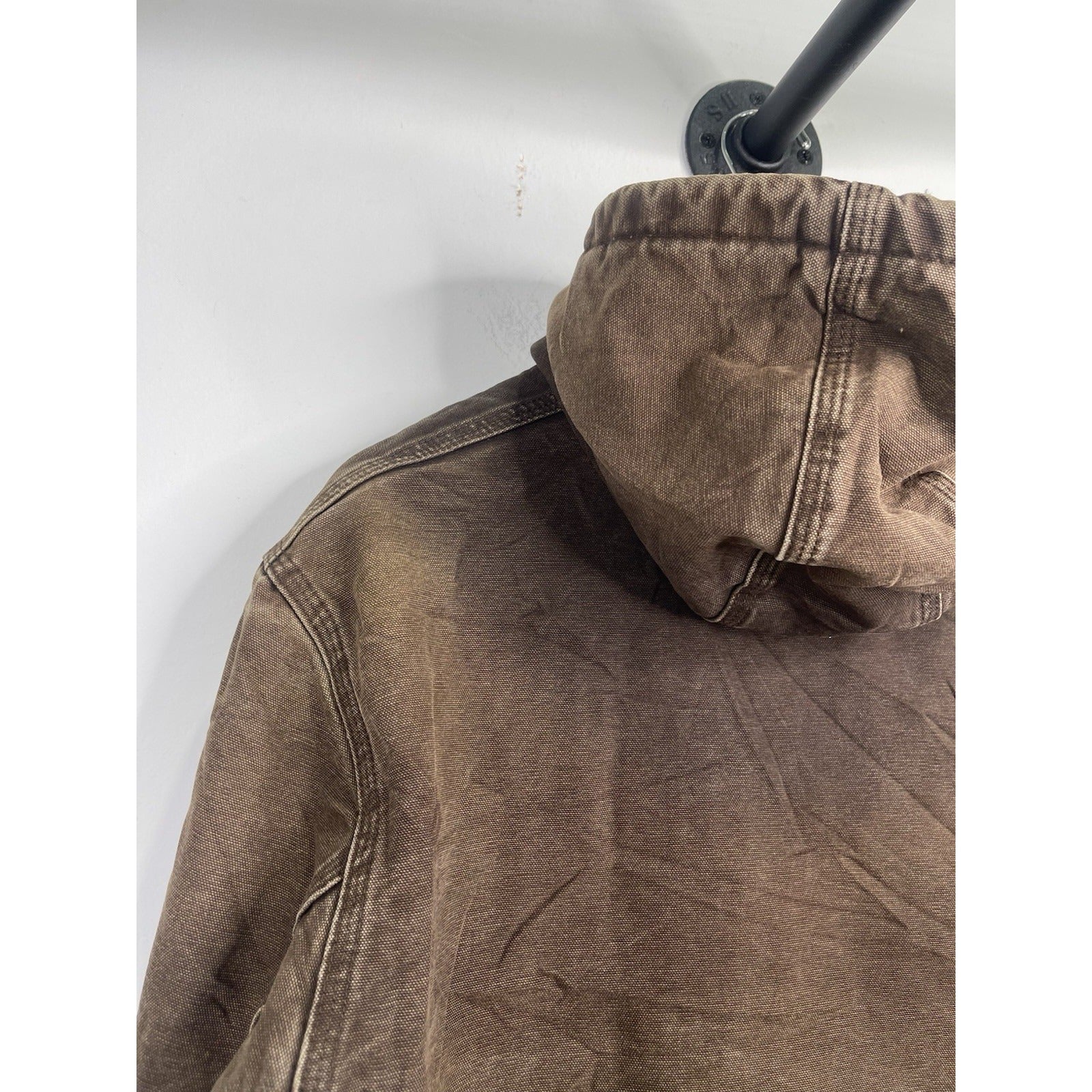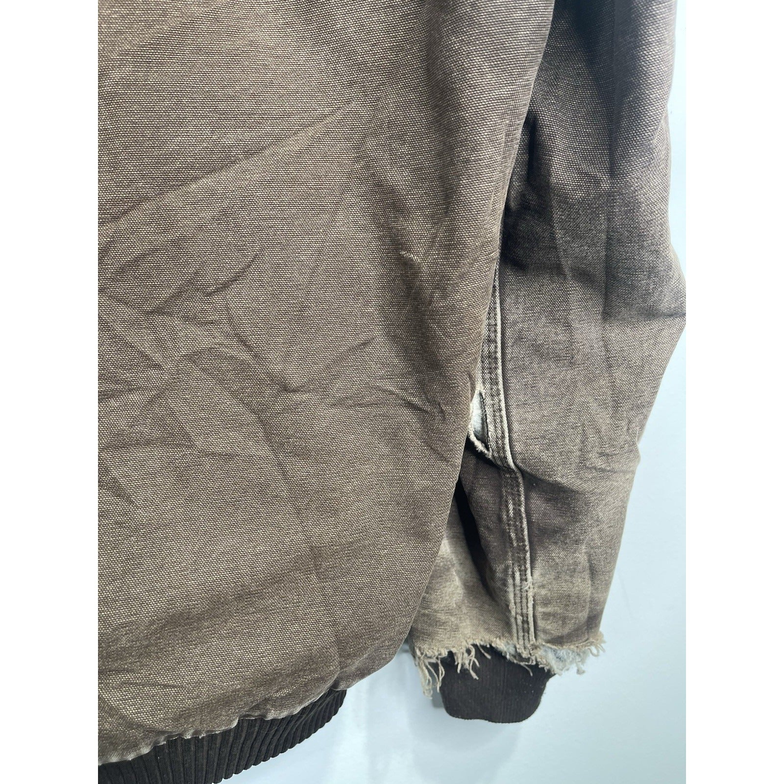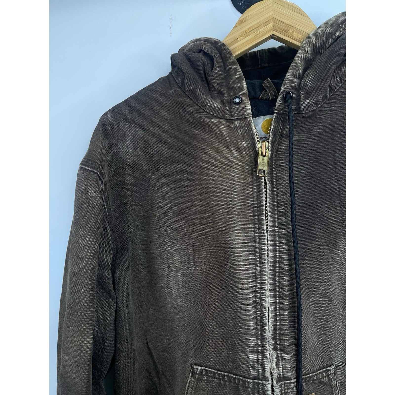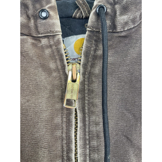 The VTG Carhartt J130 CHT Fleece Lined Full Zip Distressed Hooded Jacket in Brown 2XL is a vintage-inspired outerwear piece perfect for travel, casual wear, and workwear. Made of cotton with a mid-length design, this jacket features a zip closure and a hood for added warmth. The polyester lining and insulation ensure comfort during the winter months, while the classic fit and solid pattern give it a timeless appeal. The distressed detailing adds a rugged touch, making it ideal for those who appreciate a heavy-duty, 90s-inspired style.