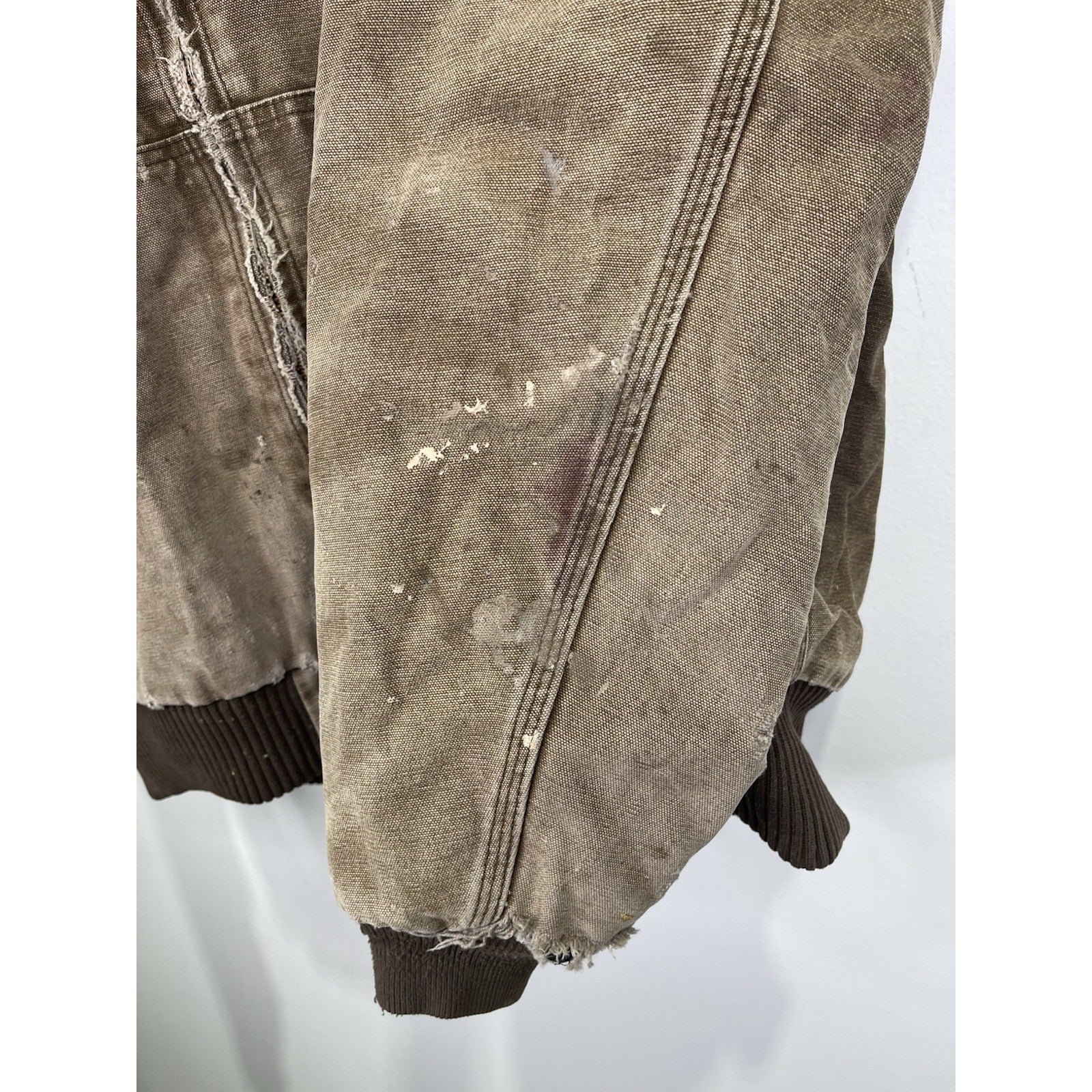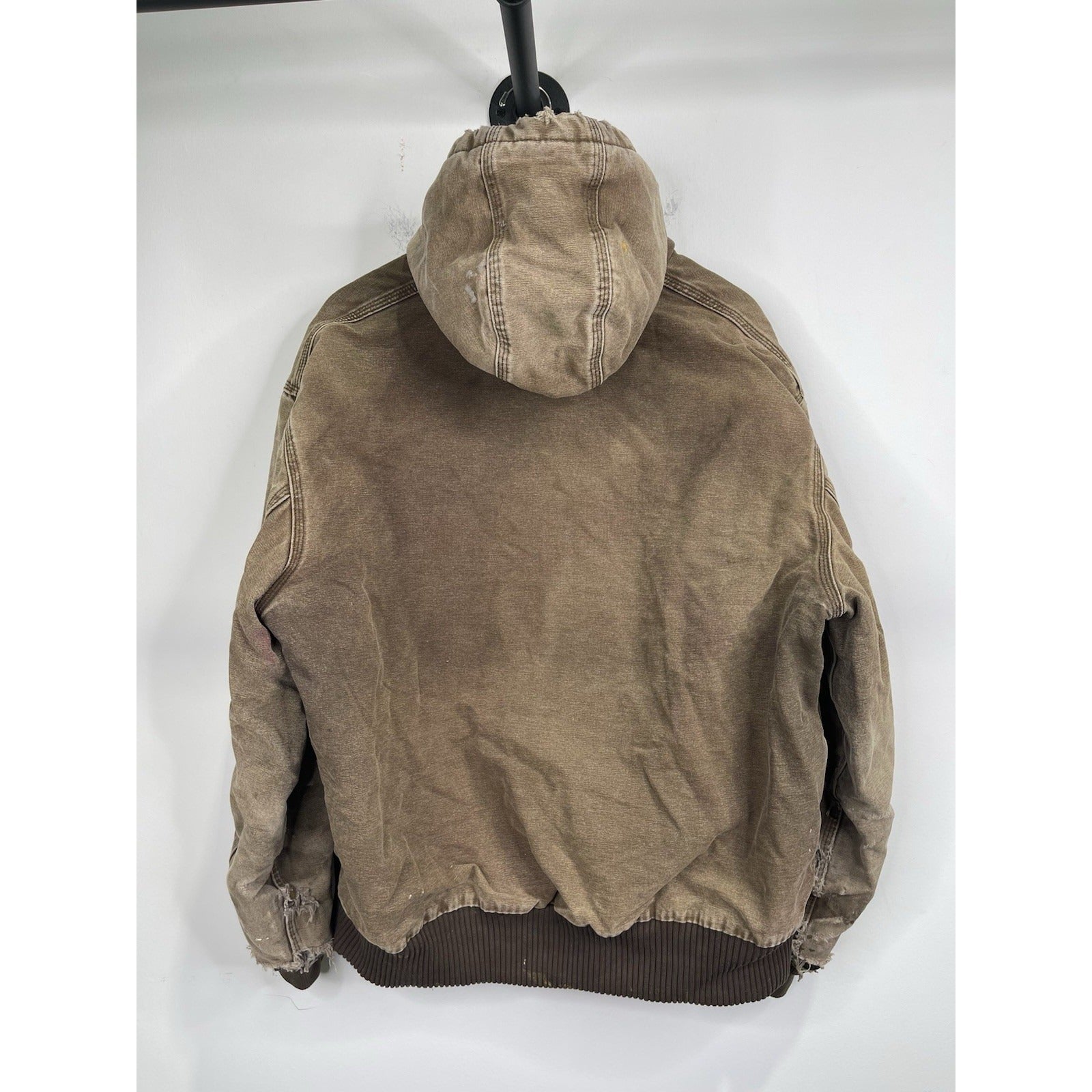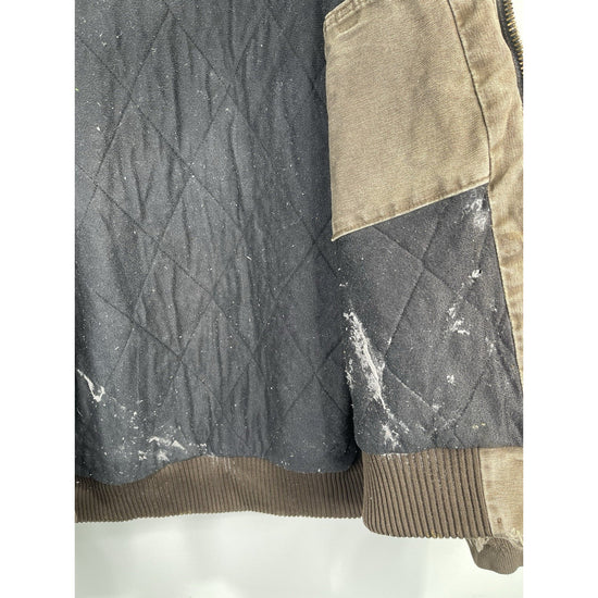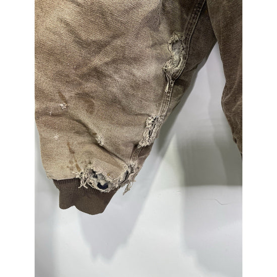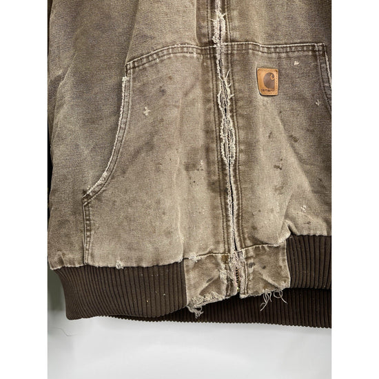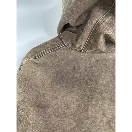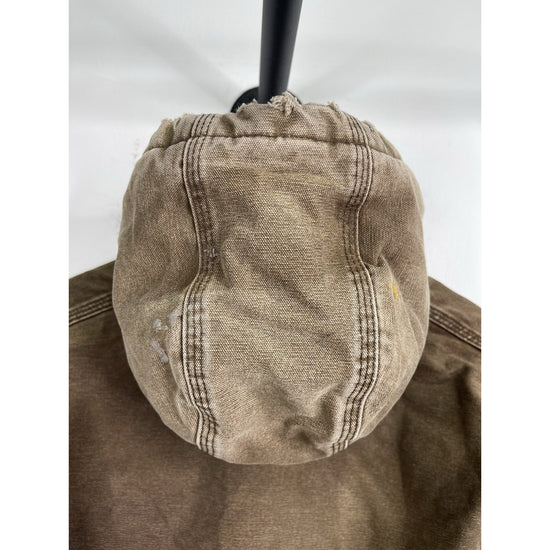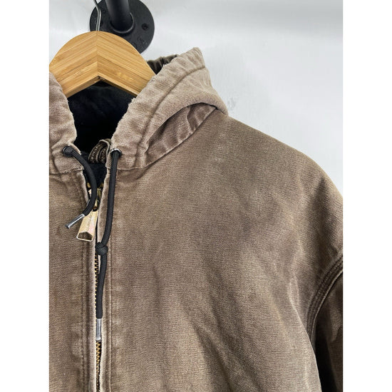 The VTG Carhartt J130 CHT Fleece Lined Full Zip Distressed Hooded Jacket in Brown XL is a vintage-inspired, heavy-duty jacket perfect for casual, travel, or workwear occasions. Made with a durable cotton outer shell and lined with cozy polyester fleece, this mid-length jacket features a classic fit with a hood for added protection. The distressed details give it a unique 90s workwear style, while the insulated design makes it ideal for winter season. Easy to care for with machine washable instructions, this Carhartt jacket is a timeless piece for any man's wardrobe.