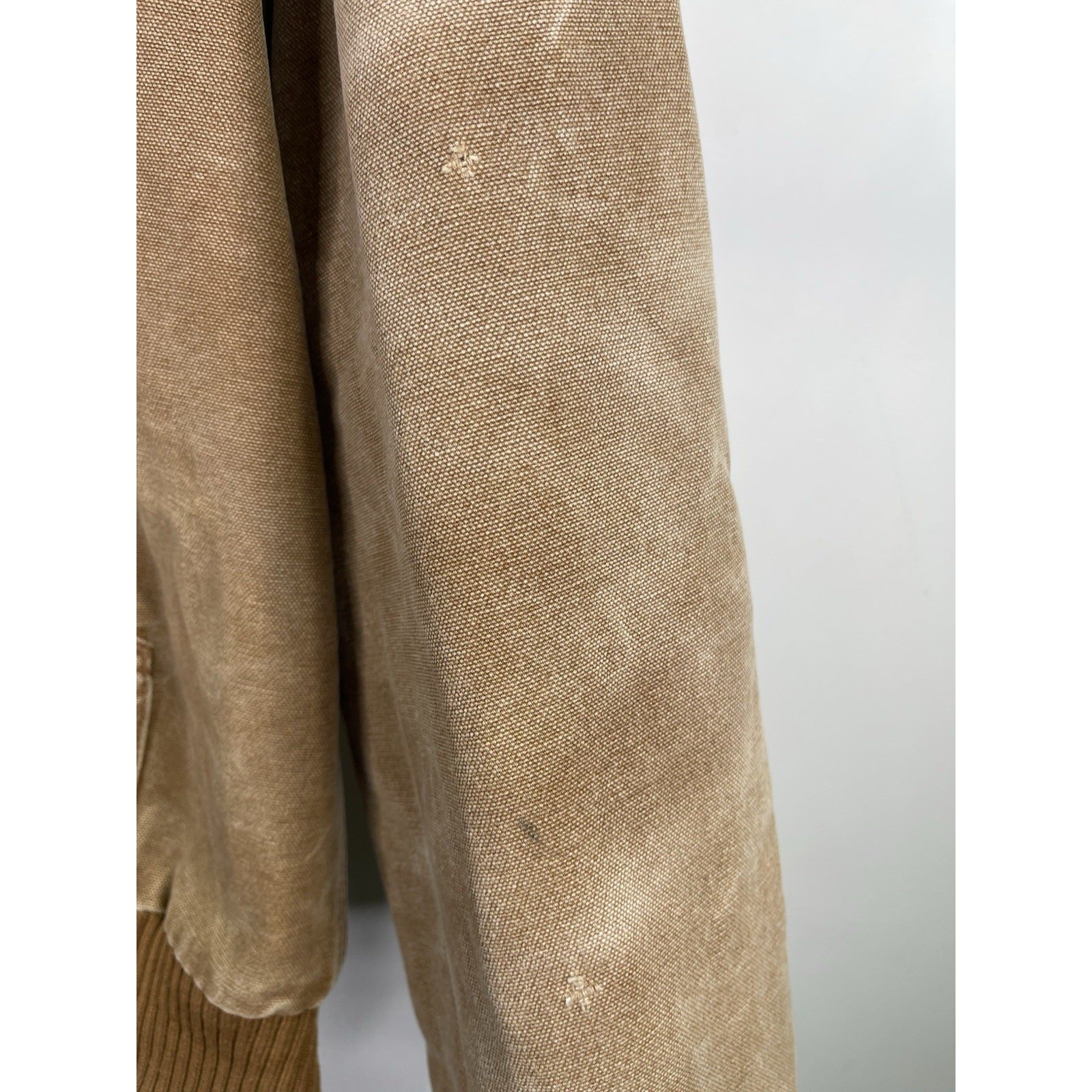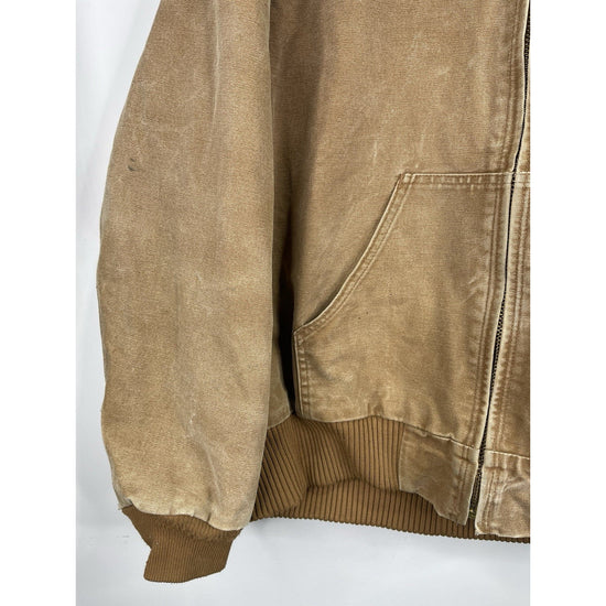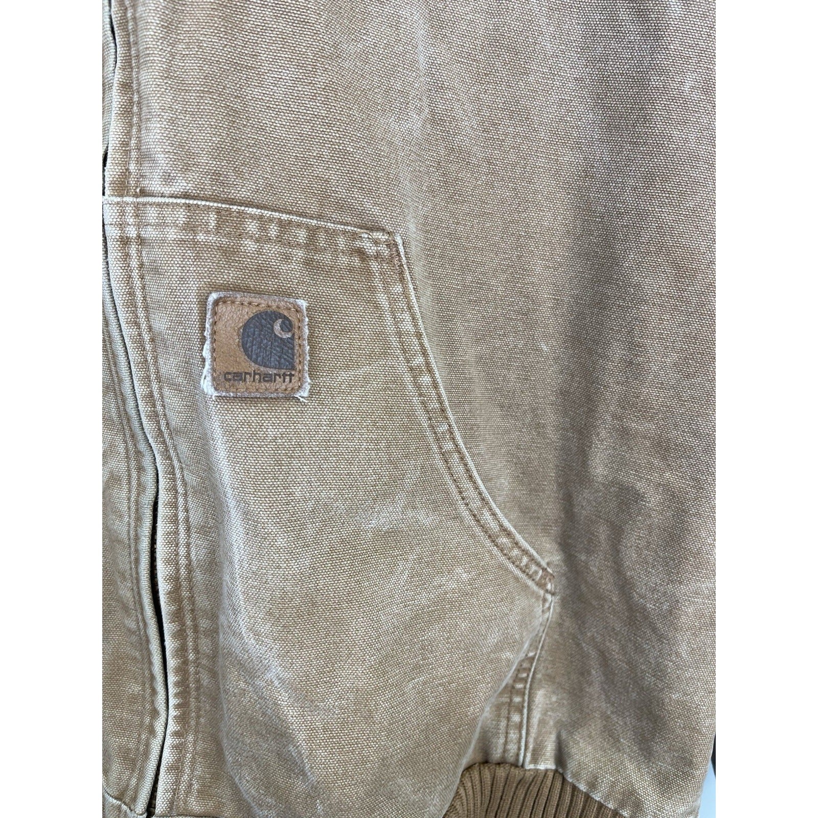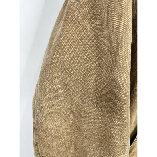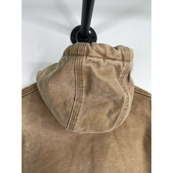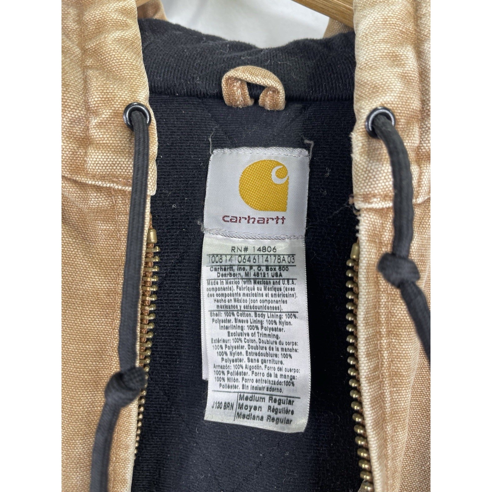 The VTG Carhartt Jacket is a vintage brown duck canvas jacket with a medium size, perfect for a casual or workwear occasion. It features a zipper closure, stand-up collar, and is insulated for added warmth. This bomber jacket has a hood, multiple pockets, and a heavyweight feel, making it suitable for the winter, fall, and spring seasons. The jacket bears the Carhartt logo and has a retro design with elements of nature, biker, and grunge aesthetics, appealing to those with a classic or hipster style. It is machine washable and ideal for a vintage-inspired look.