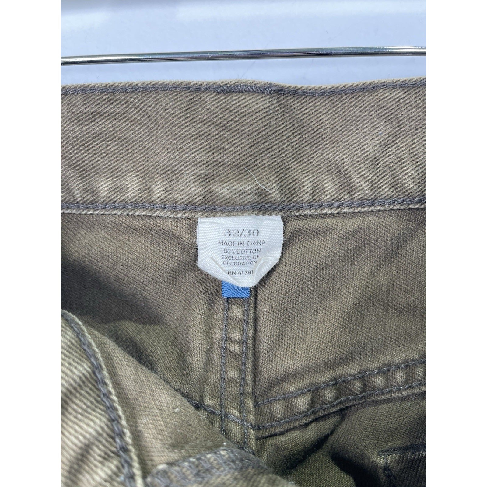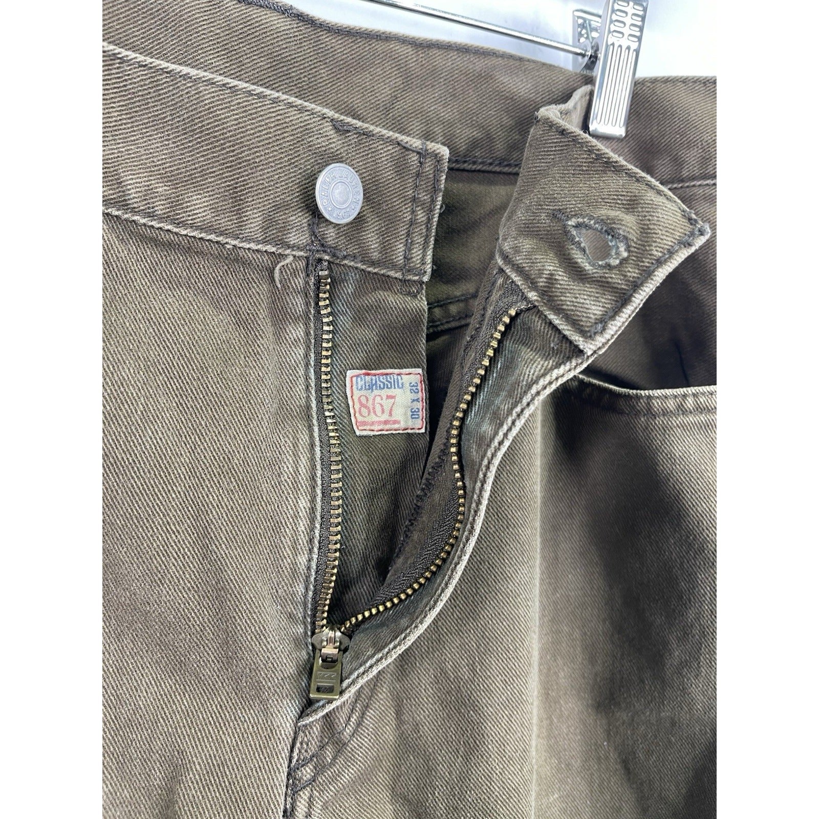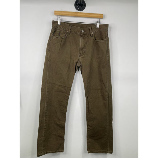 The product is a pair of vintage men's brown Polo Ralph Lauren jeans in a size 32x30. Made of cotton denim, these regular fit jeans feature a zip closure and a straight leg style. With a dark wash and solid pattern, they also have pockets and are part of the Polo Ralph Lauren Authentic Dungarees product line. Perfect for those who appreciate a classic American preppy look from the 90s, these dungarees are a stylish addition to any wardrobe.
