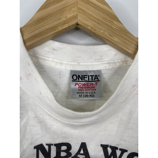 The product is a vintage men's shirt commemorating the Houston Rockets' 1994 NBA Conference Champions title. Officially licensed by the National Basketball Association (NBA) and made in the United States, this white shirt features the team's logo and is pre-shrunk to size medium. Perfect for any basketball fan looking to show their support for the Houston Rockets and celebrate the team's historical achievement in the conference finals.