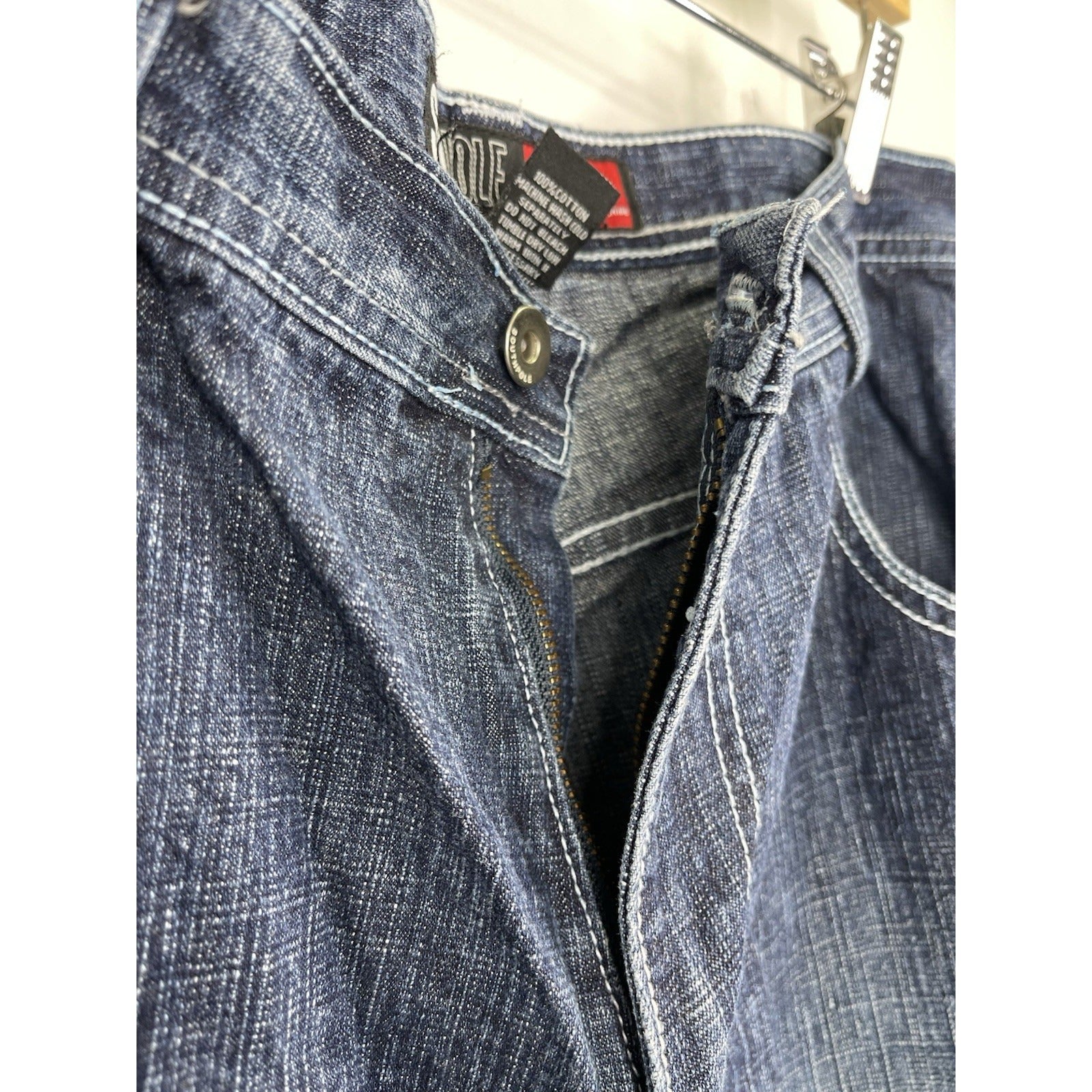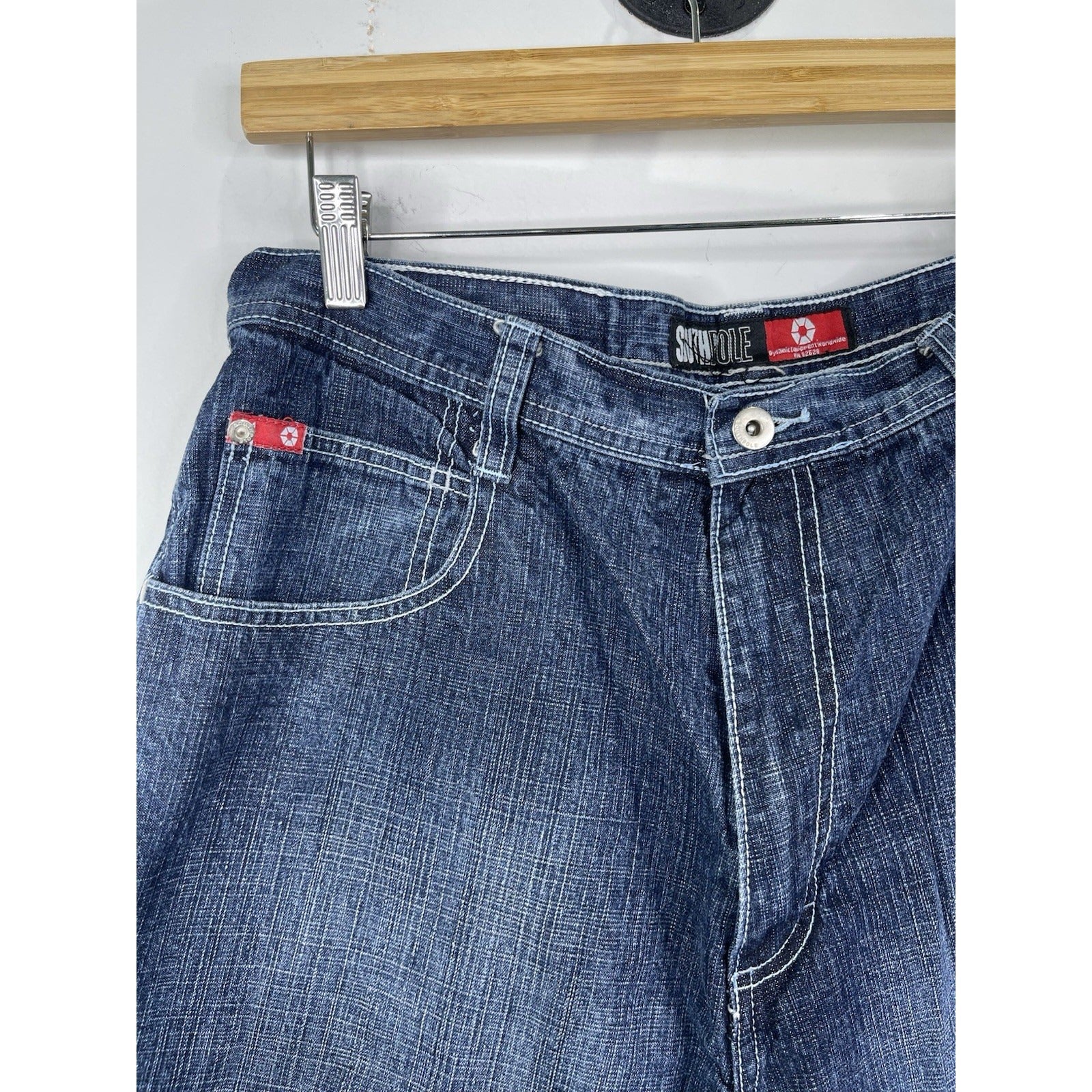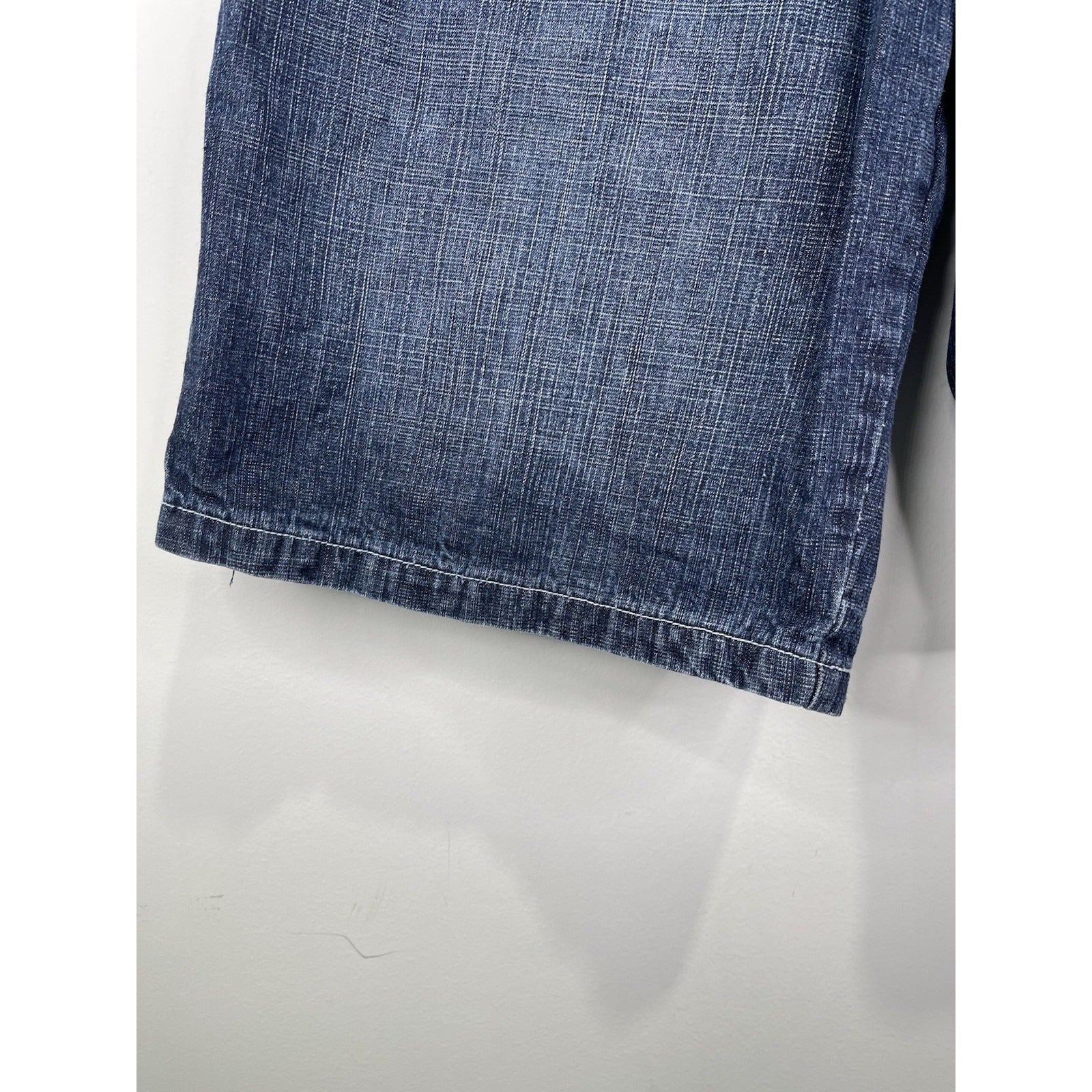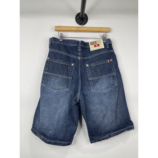 The product is a pair of VTG Men’s Southpole Dark Wash Denim Baggy Y2K Hip Hop Shorts in size 36. These shorts feature a solid blue color with a medium fabric wash, made of cotton denim. They have a zip closure, flat front, and mid-rise fit, perfect for casual or travel occasions. The design includes a logo accent, slash pockets, and a 12.5-inch inseam, suitable for a regular fit. The style is inspired by travel, beach, outdoor, classic, hip hop, and modern themes, making them a comfortable and stylish choice for the summer and spring seasons.