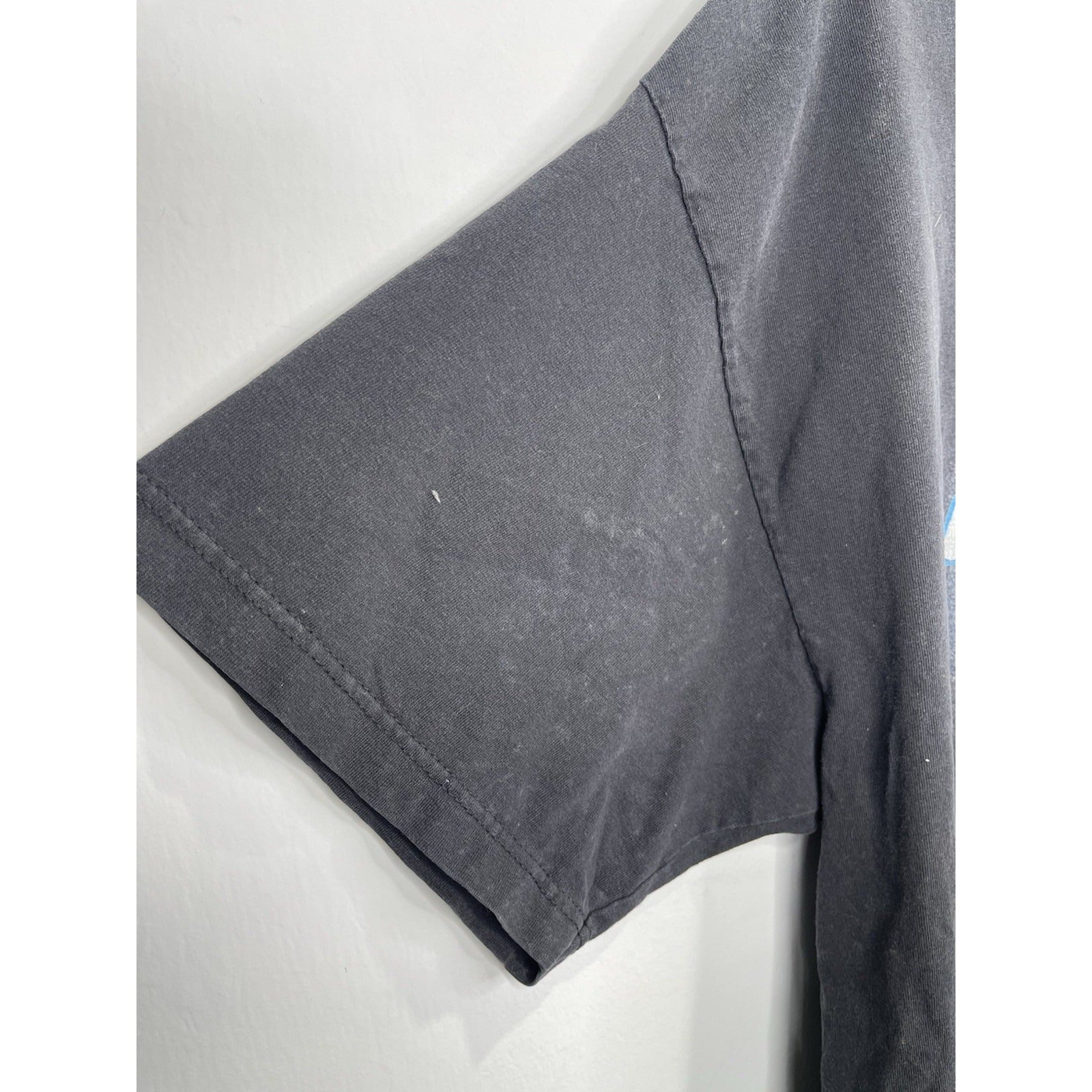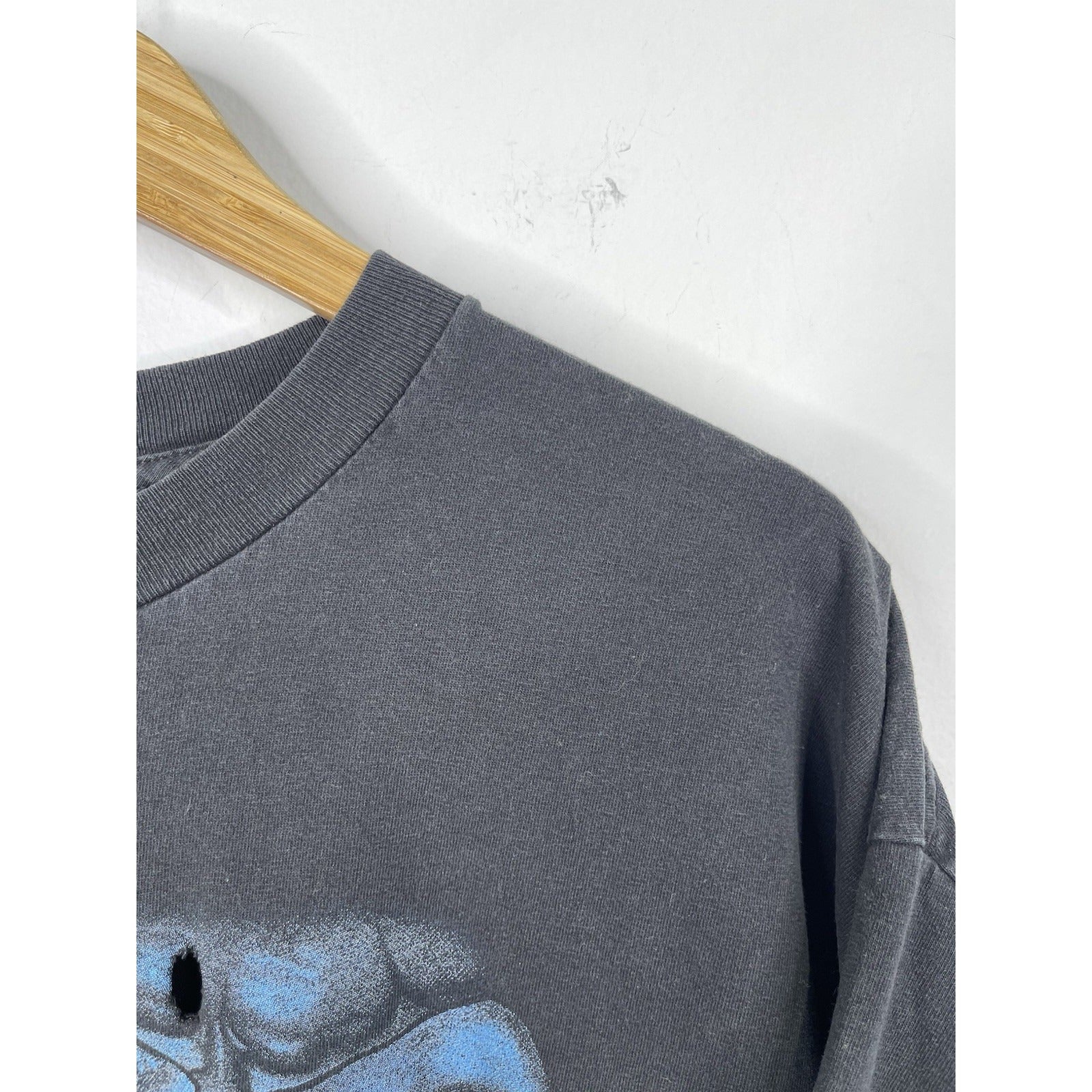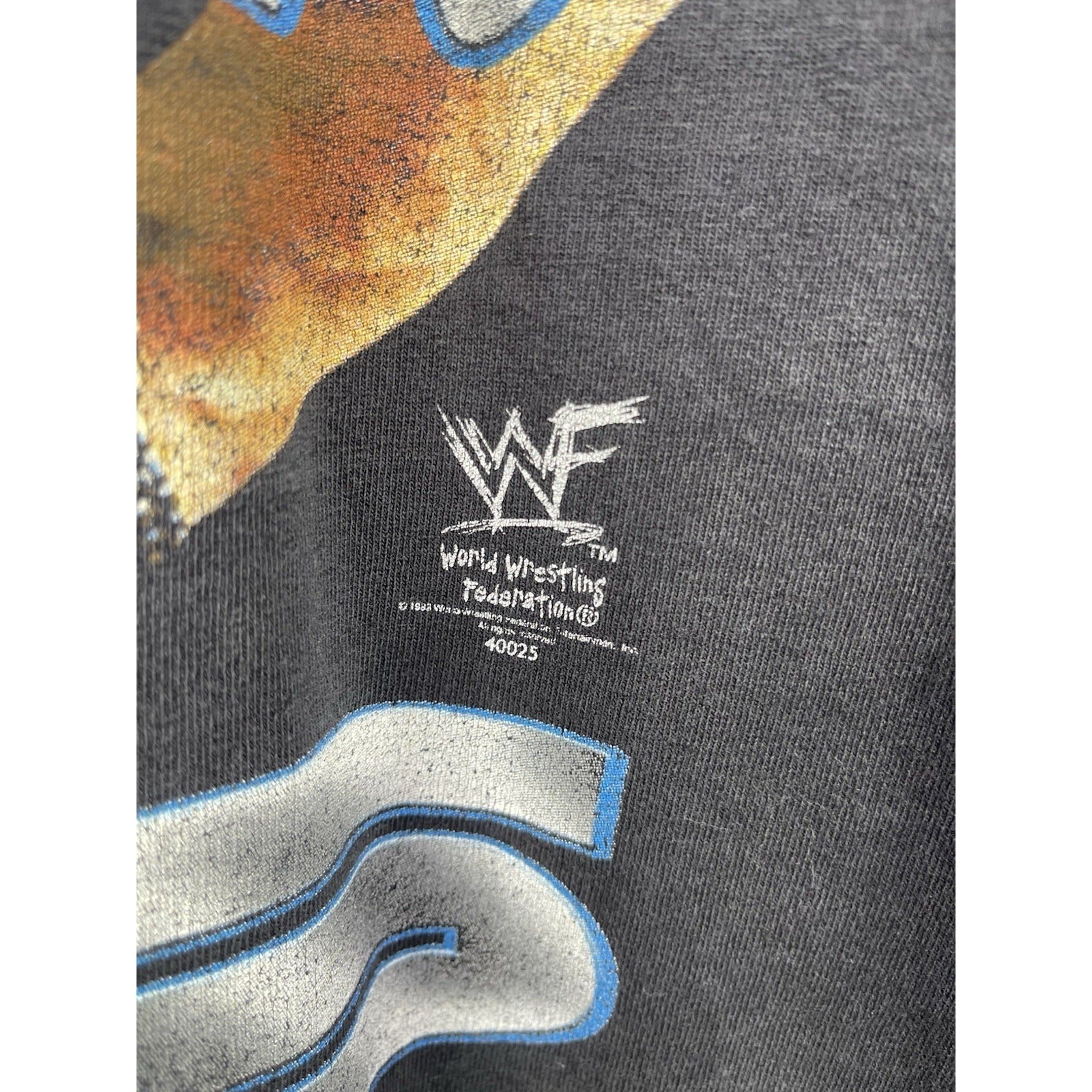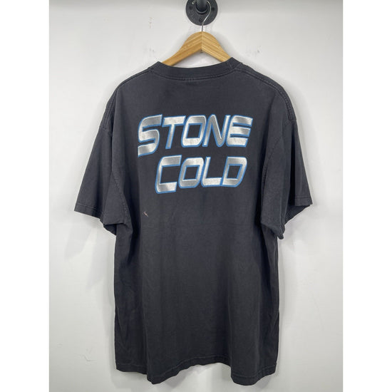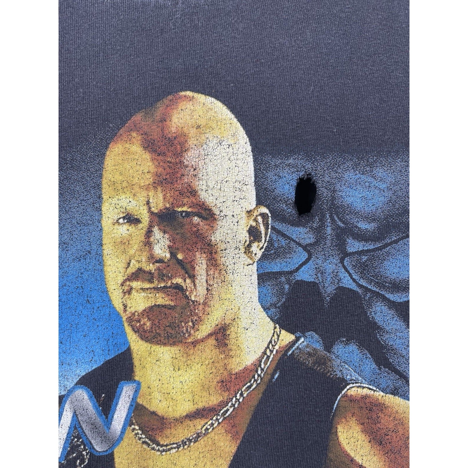 The VTG Men's Stone Cold Steve Austin Lean Mean Double Sided Wrestling T-Shirt in size 2XL is a vintage piece from the 90s featuring a round neck and short sleeves. Made of black cotton with a solid pattern, this shirt showcases a double-sided graphic print of Stone Cold and Steve Austin, making it a must-have for wrestling fans. Machine washable and with a regular fit, this T-shirt is perfect for summer and spring wear, adding a touch of nostalgia to any outfit.