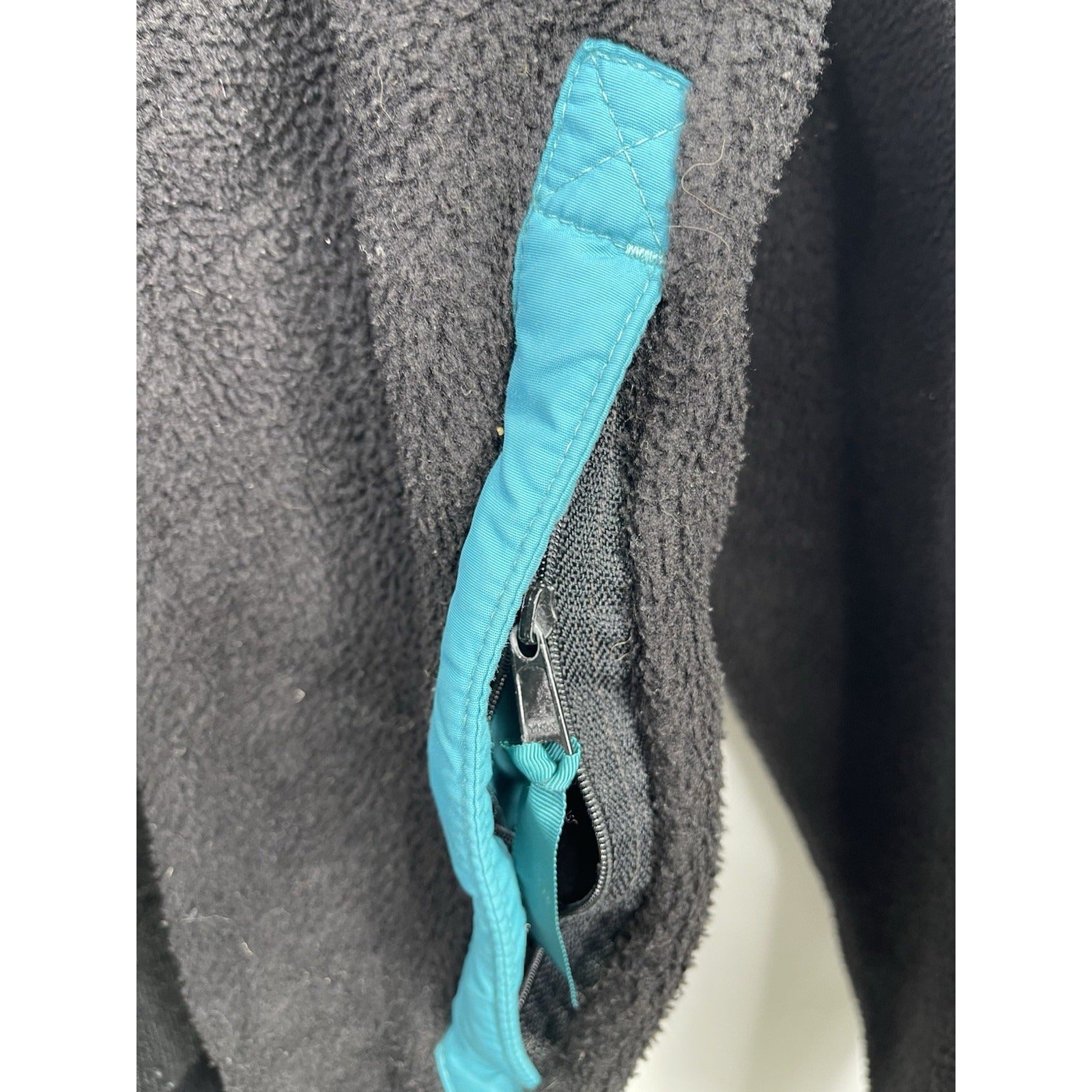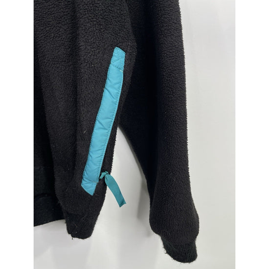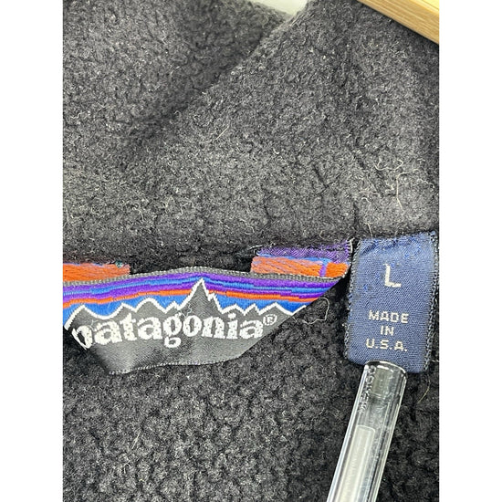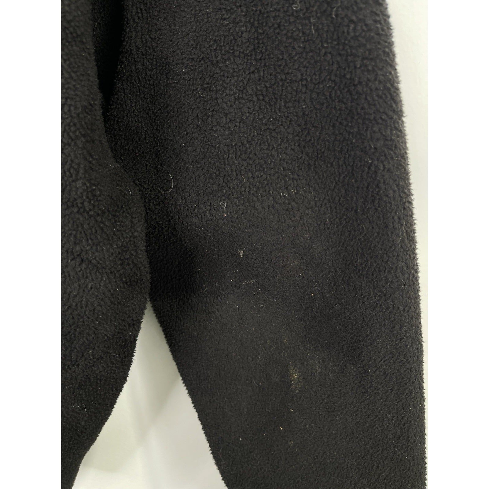 This vintage Patagonia Synchilla 1/4 zip fleece jacket is a unique and stylish addition to any man's wardrobe. Made in the USA with high-quality materials, this black jacket features a playful monkey pattern and stylish accents like Goretex detailing. The full zip design and cozy Synchilla lining make it perfect for outdoor activities or casual wear, while the abstract insulation material adds a touch of flair. With a size large and regular fit, this jacket combines retro style with modern performance for a standout piece.
