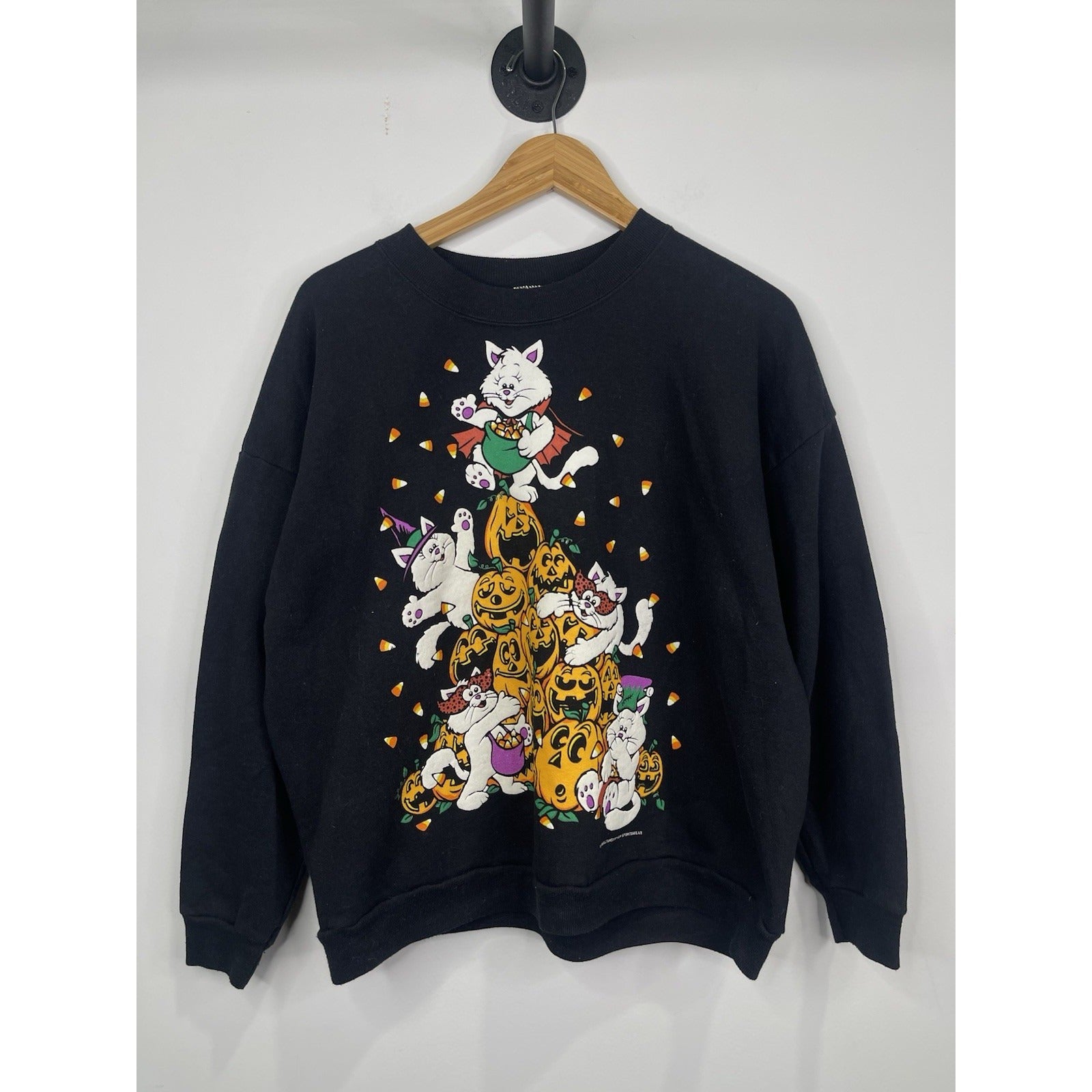 This vintage Sun Sportswear Halloween sweatshirt in XL is a classic black sweatshirt with a round neck and long sleeves. Featuring a cute animal print of cats, pumpkins, and candy corn, this pullover sweatshirt is perfect for celebrating the Halloween season. Made of comfortable cotton material, this sweatshirt is machine washable and suitable for all seasons. With a casual fit and basic style, it is a must-have for any Halloween enthusiast looking to add a fun and festive touch to their wardrobe.