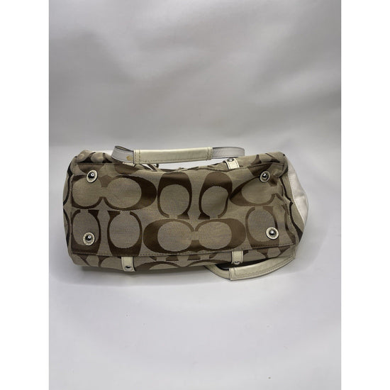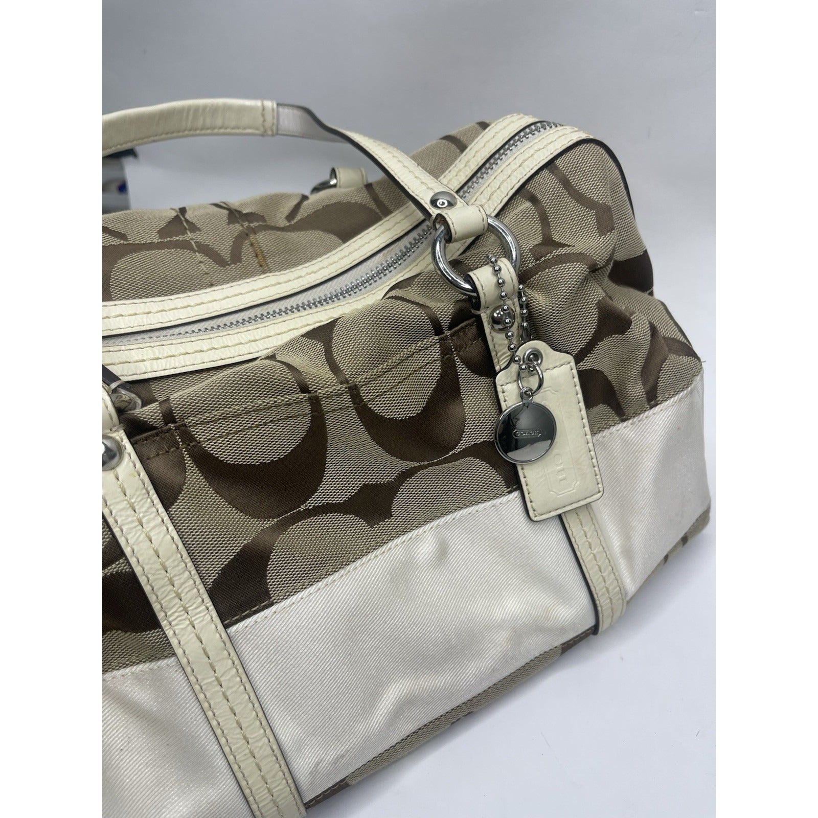 The VTG White/Brown/Beige Coach Satchel Handbag is a classic rectangular handbag with a monogram pattern, zip closure, and silver hardware. It features a beige exterior and brown lining, with a blend of white, brown, and beige colors. The bag has a width of 12 inches, height of 10 inches, and depth of 6 inches, making it a versatile size for everyday use. Weighing around 1.5 pounds, this Coach handbag is lined and includes inner pockets for added functionality, making it a timeless and stylish accessory for any woman's wardrobe.