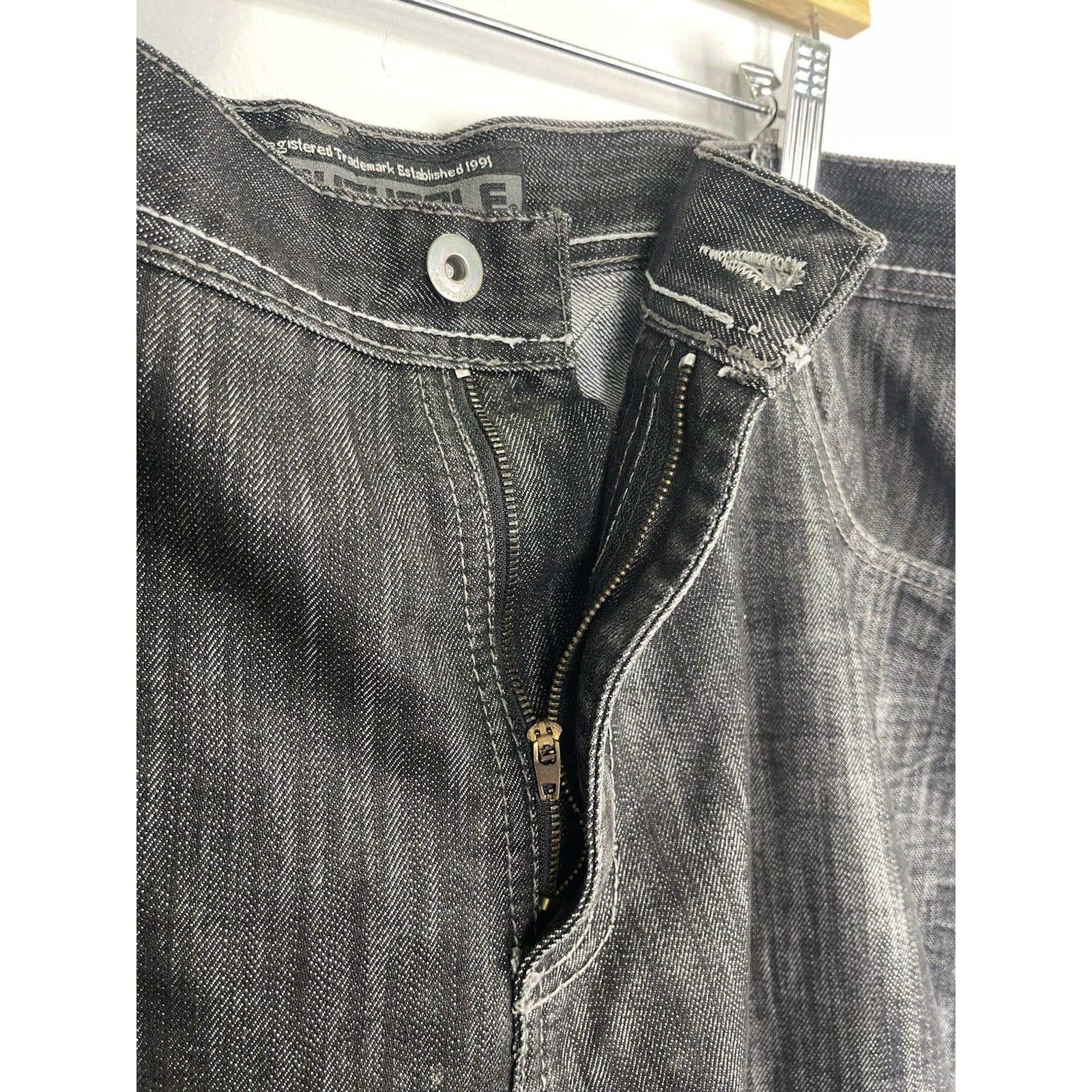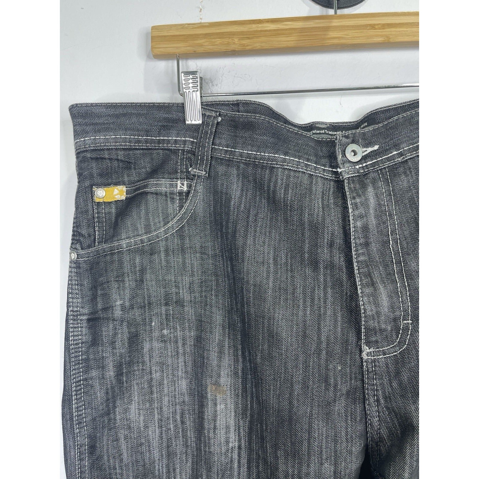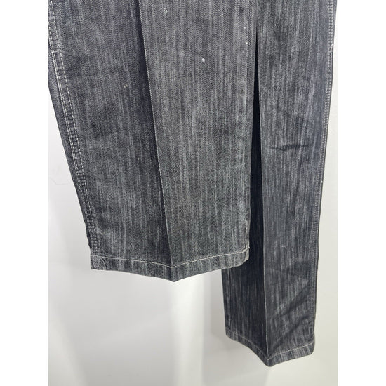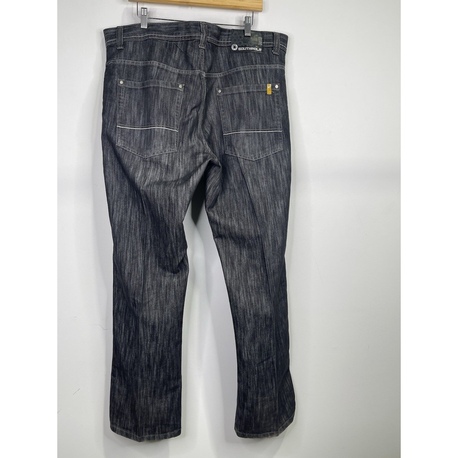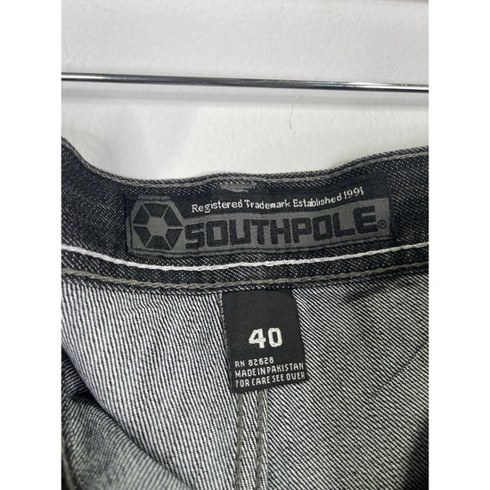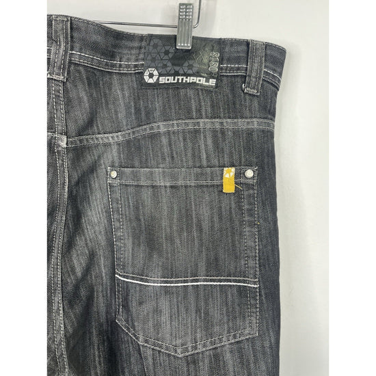 The product is a pair of Men's Distressed Dark Wash Black Southpole Baggy Denim Jeans in size 40x36. These relaxed fit jeans feature a solid black color with a dark wash, made from cotton denim fabric. The jeans have a wide-leg style with a 5-pocket design, perfect for a casual and comfortable look. The Southpole brand adds a touch of logo accents, making them a stylish choice for various seasons including winter, summer, fall, and spring. Easy to care for with machine washable instructions, these jeans are both practical and fashionable for any wardrobe.