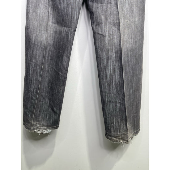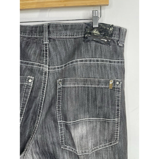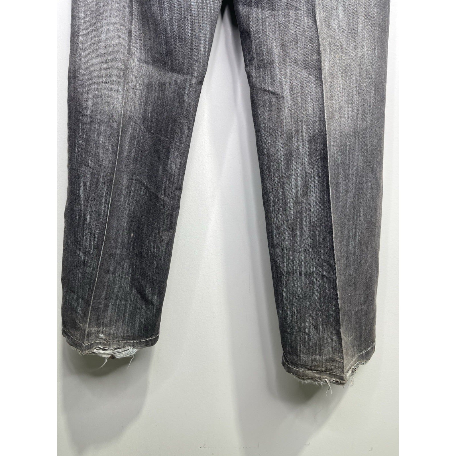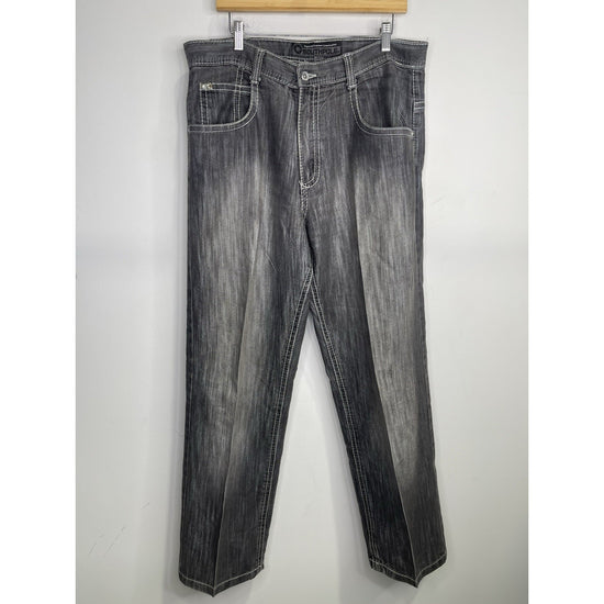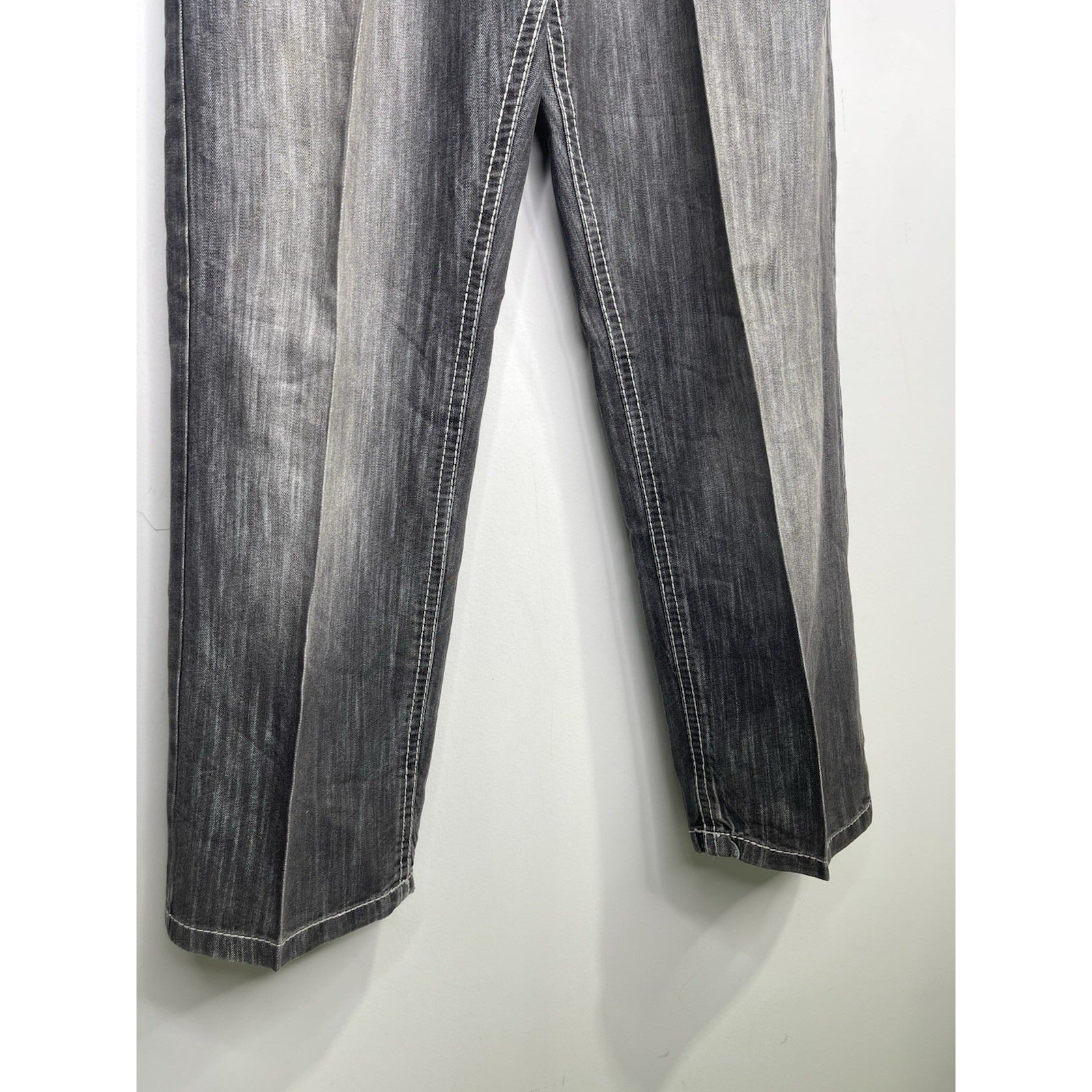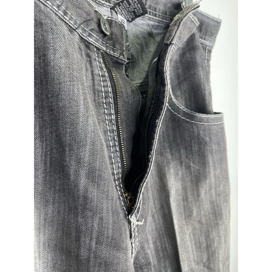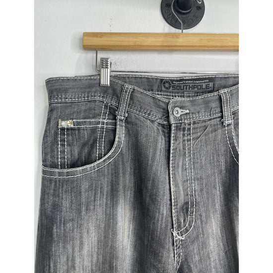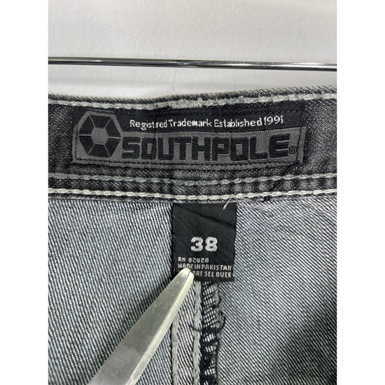 The product is a pair of vintage Y2K Southpole baggy denim jeans in a distressed dark wash gray color. These relaxed fit jeans have a solid pattern with a logo accent and a classic 5-pocket design. Made from cotton denim, they offer easy care and comfort, perfect for all seasons. The wide-leg style and 90s hip hop theme give these jeans a unique and stylish look, ideal for a regular fit for men who appreciate retro fashion.