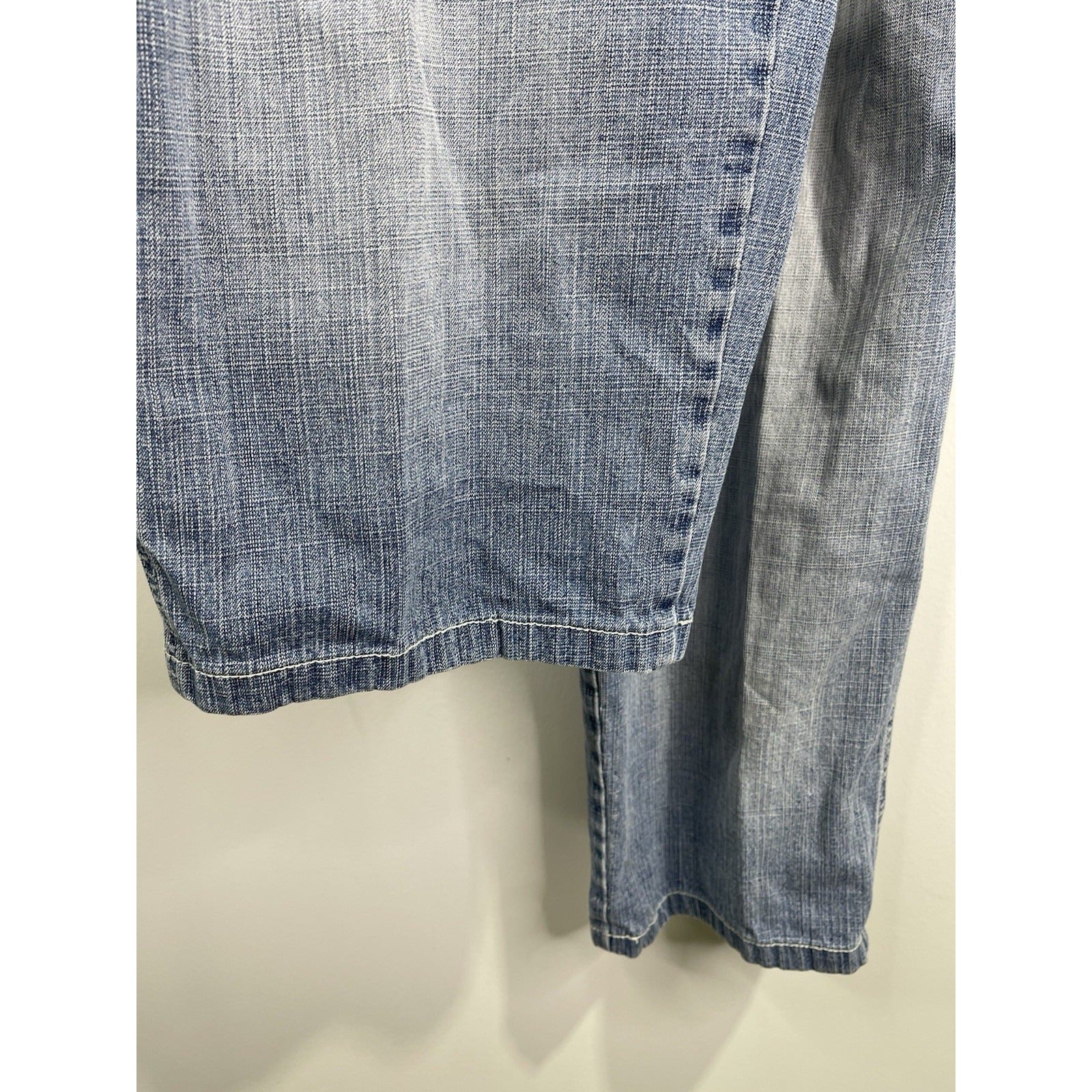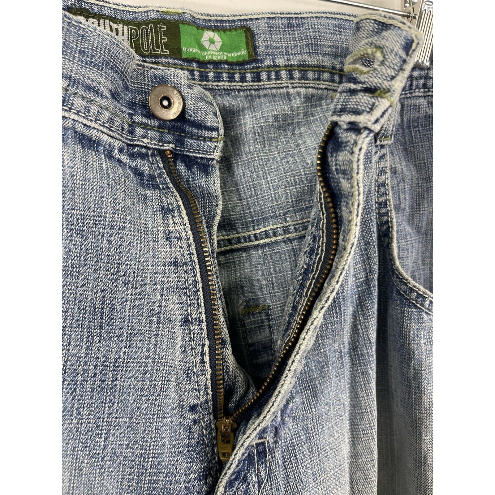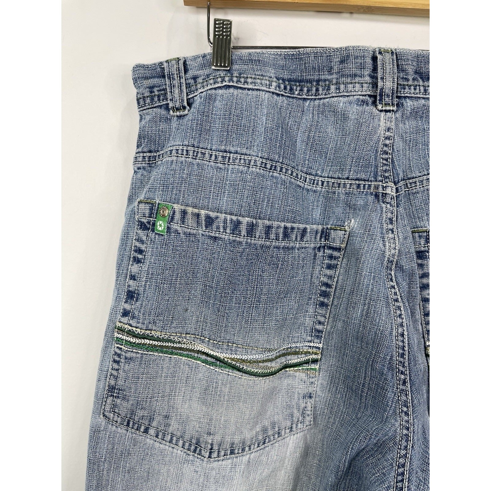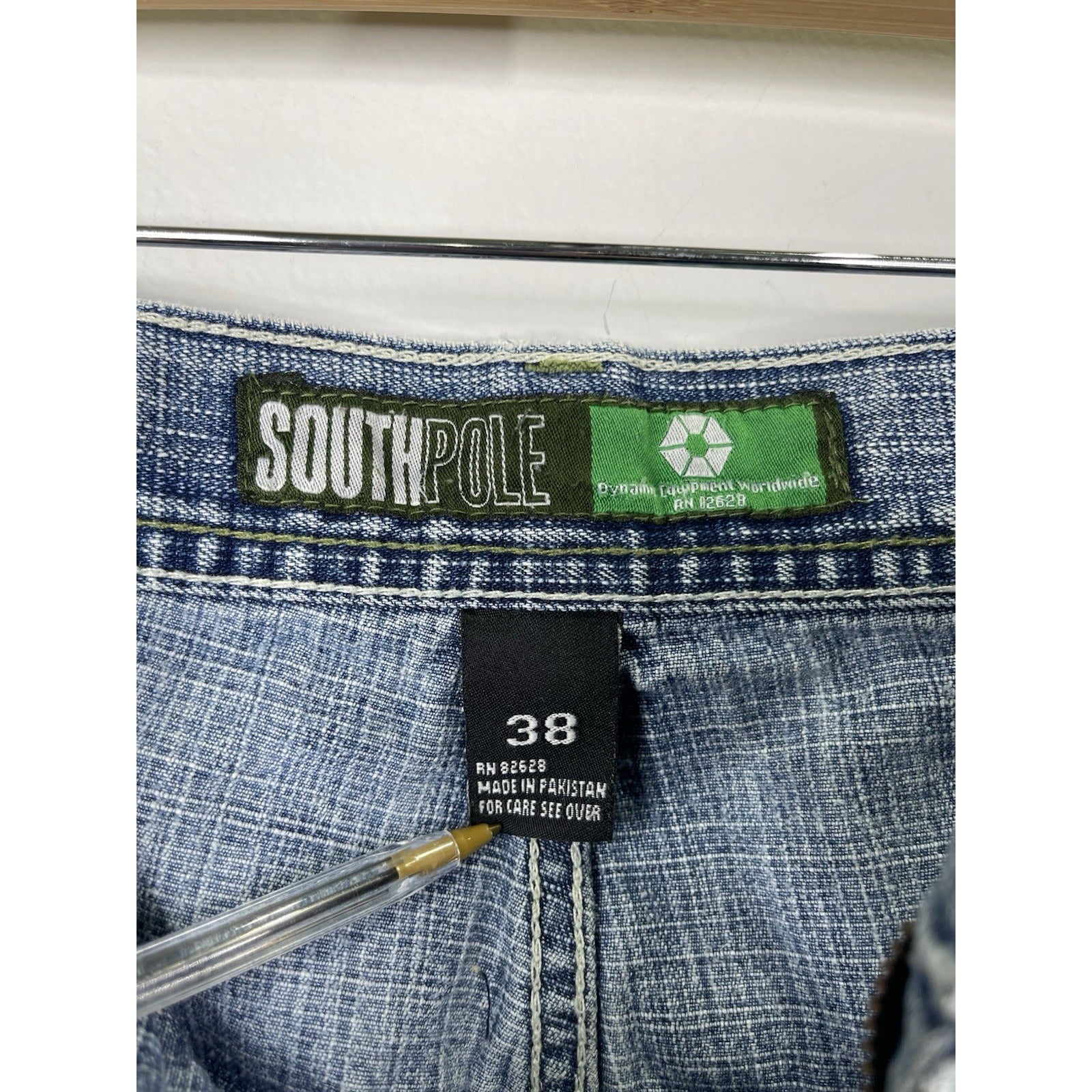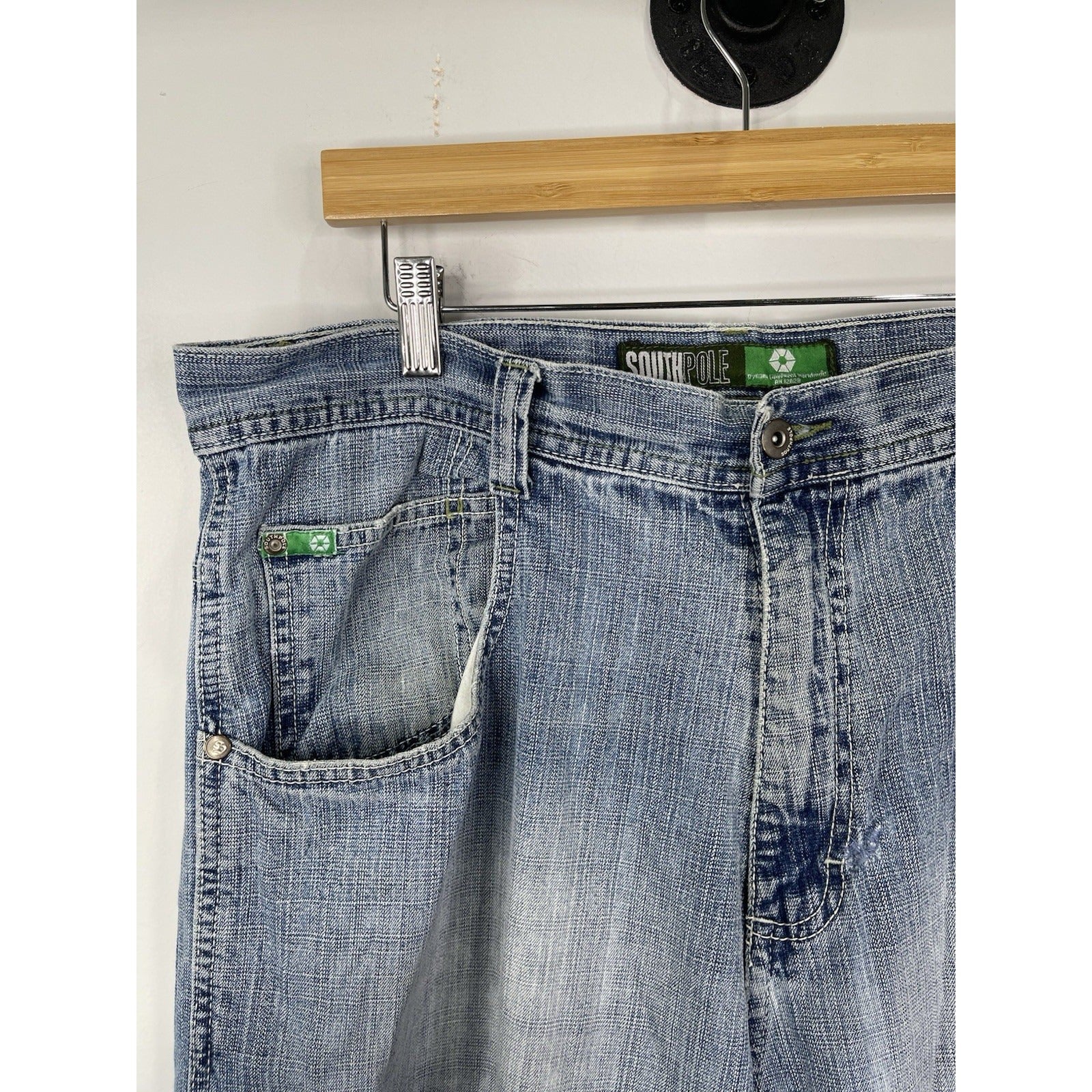 These VTG Y2K Men’s Distressed Light Blue Wash Southpole Baggy Denim Jeans in size 38x31 offer a relaxed fit with a wide-leg style, perfect for a comfortable and stylish look. Made of cotton denim with a dark wash, these jeans feature a solid pattern and a classic 5-pocket design with a Southpole logo accent. Easy to care for with machine washable fabric, these jeans are ideal for all seasons and can be paired with a variety of outfits to create a hip-hop inspired 90s vibe.