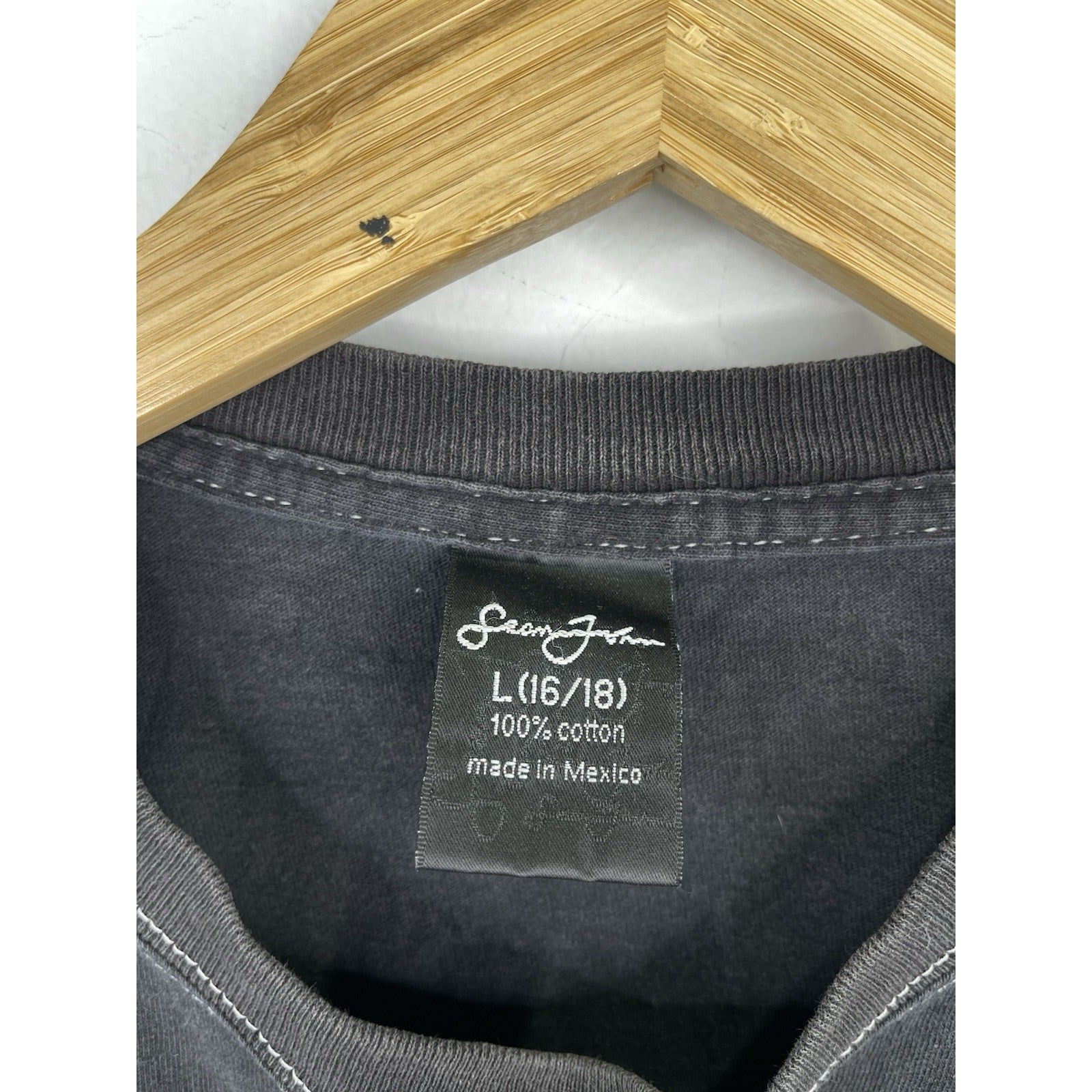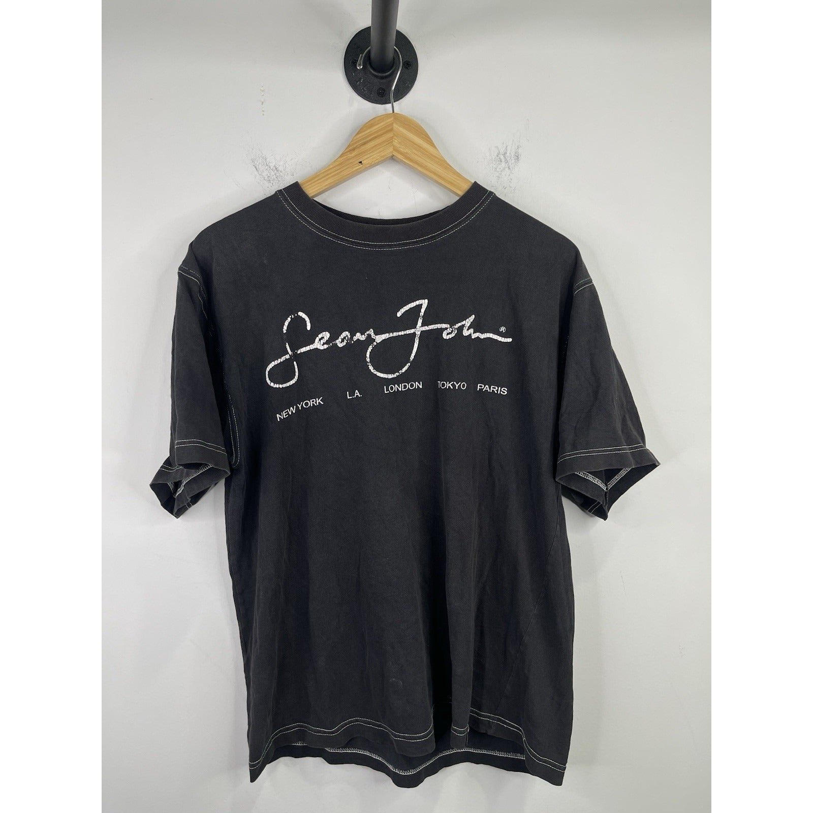 The Vtg Y2k Sean John Men's T-shirt in Black is a vintage piece from the early 2000s, featuring a graphic spell out of the brand logo. Made of heavy cotton, this shirt is machine washable and has a crew neck and short sleeves for a regular fit. Perfect for fans of 90s hip hop culture, this T-shirt is suitable for all seasons, especially summer and spring. With its classic design and iconic branding, this Sean John shirt is a stylish and nostalgic addition to any wardrobe.