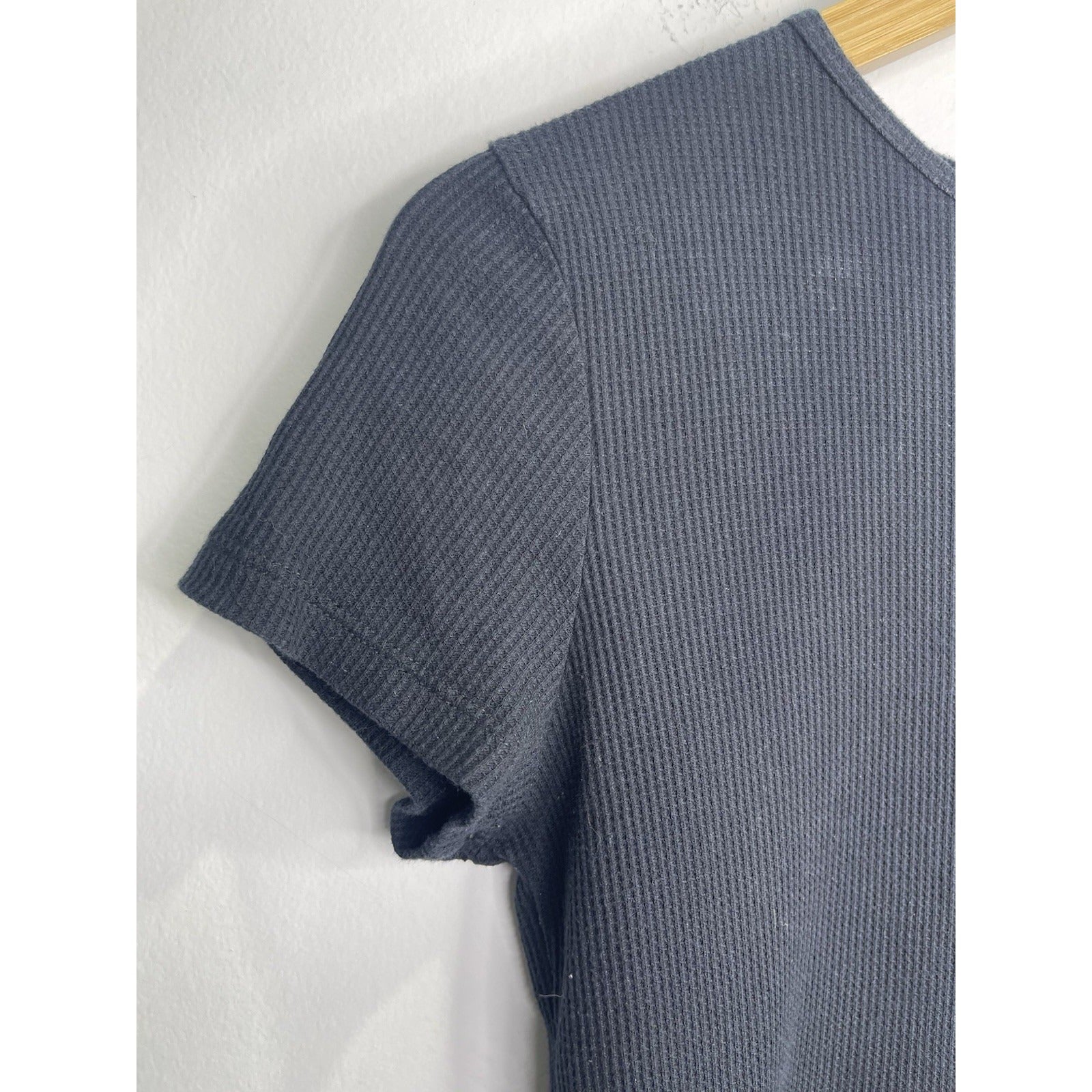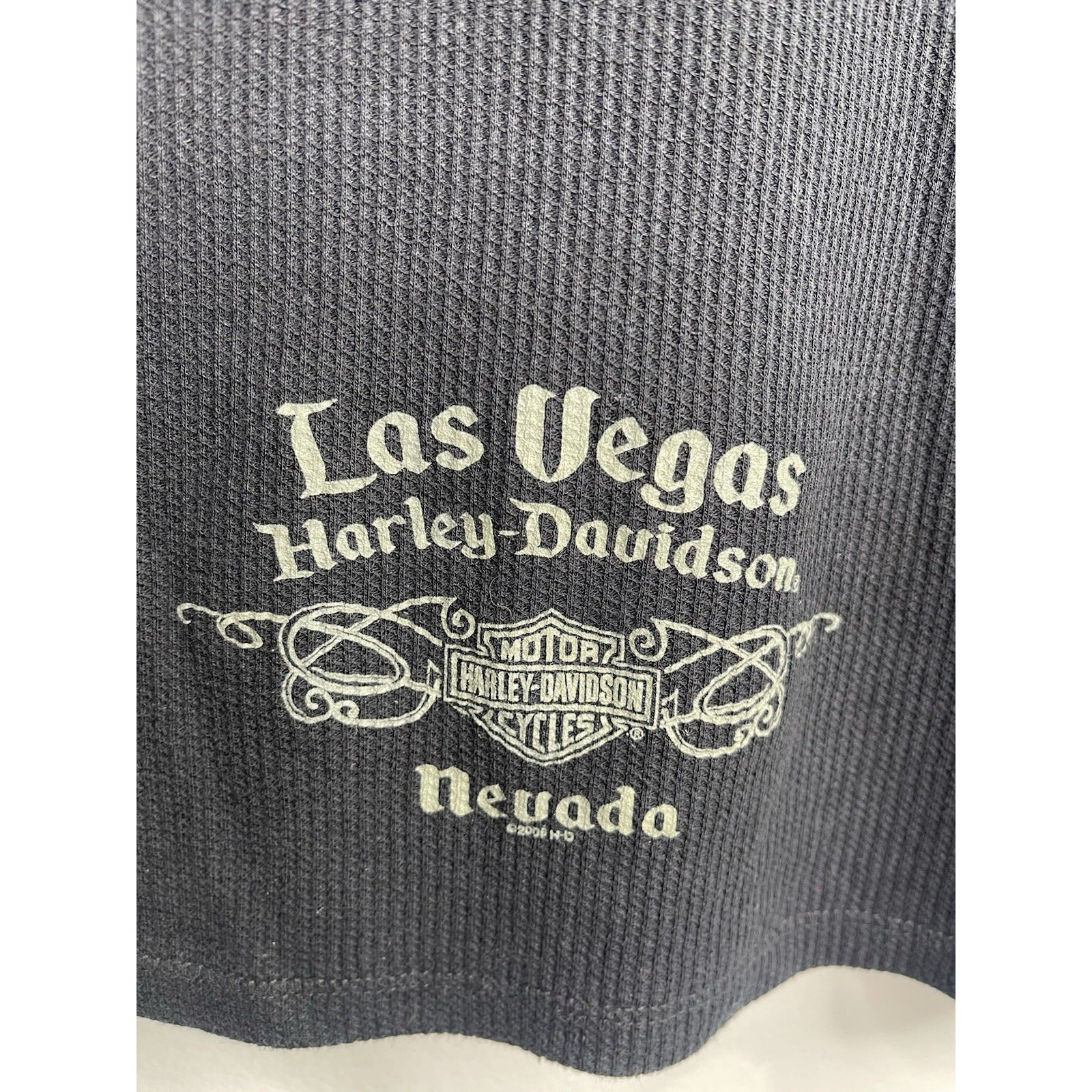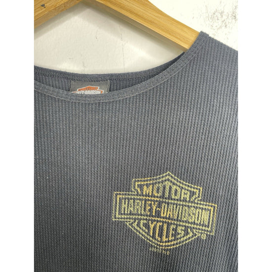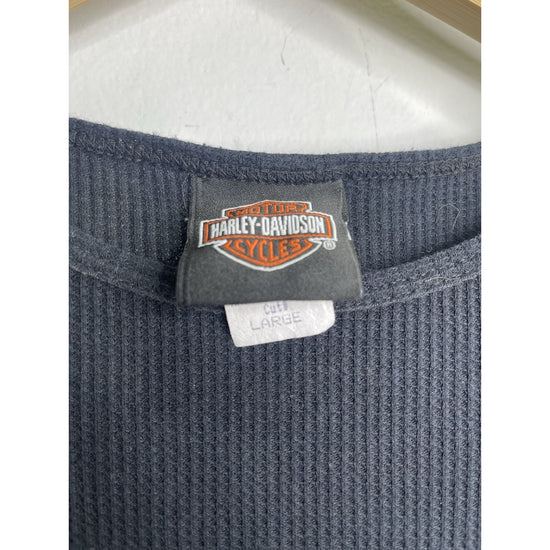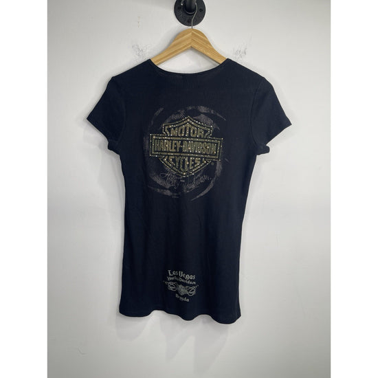 This Women's 2009 Ribbed Harley Davidson Black Studded T-Shirt in size L is a stylish and edgy piece perfect for any biker or motorcycle enthusiast. Made of comfortable cotton material, this slim fit t-shirt features a solid black color with studded accents, giving it a bold and trendy look. The round neck and short sleeves make it ideal for all seasons, while the lightweight design ensures easy care and comfort. Perfect for adding a touch of rebellion to your wardrobe, this Harley-Davidson t-shirt is a must-have for any woman looking to make a statement.