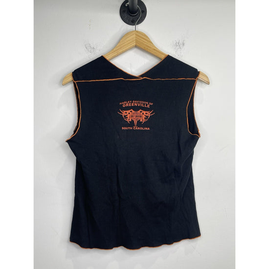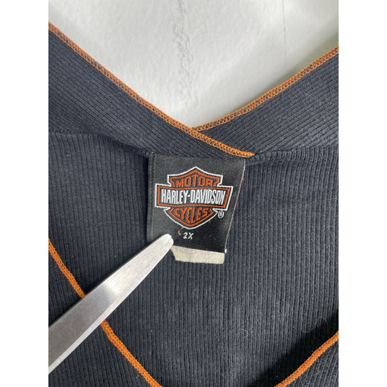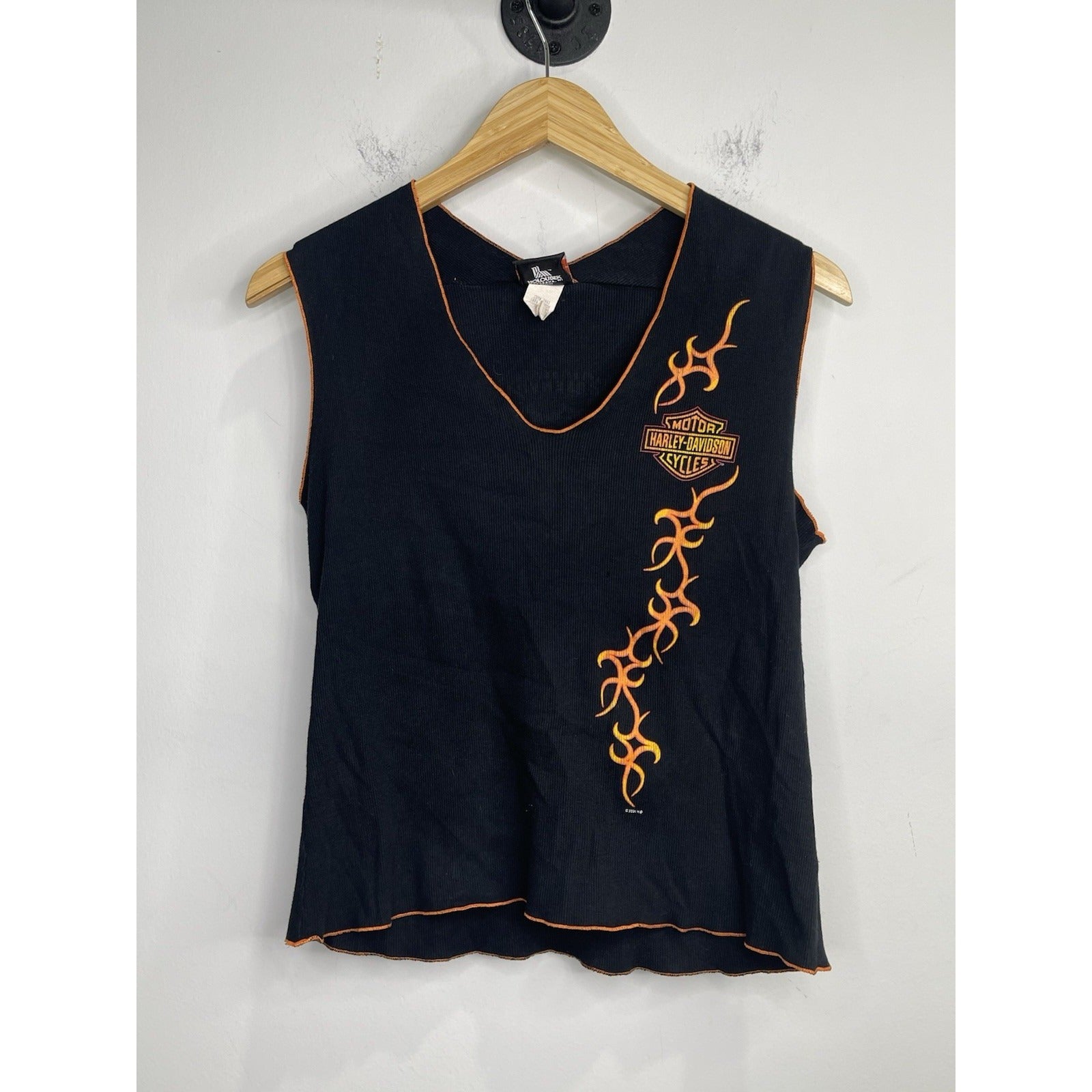 This Women's Harley Davidson Holoubek Black Tank Top Shirt in size 2X is a vintage piece made from 100% cotton. Featuring a sleeveless design, round neckline, and regular fit, this lightweight and breathable tank top is perfect for all seasons. The black color and Harley-Davidson branding give it a classic American style that is both comfortable and trendy. Made in the United States, this tank top is a versatile and stylish addition to any woman's wardrobe.