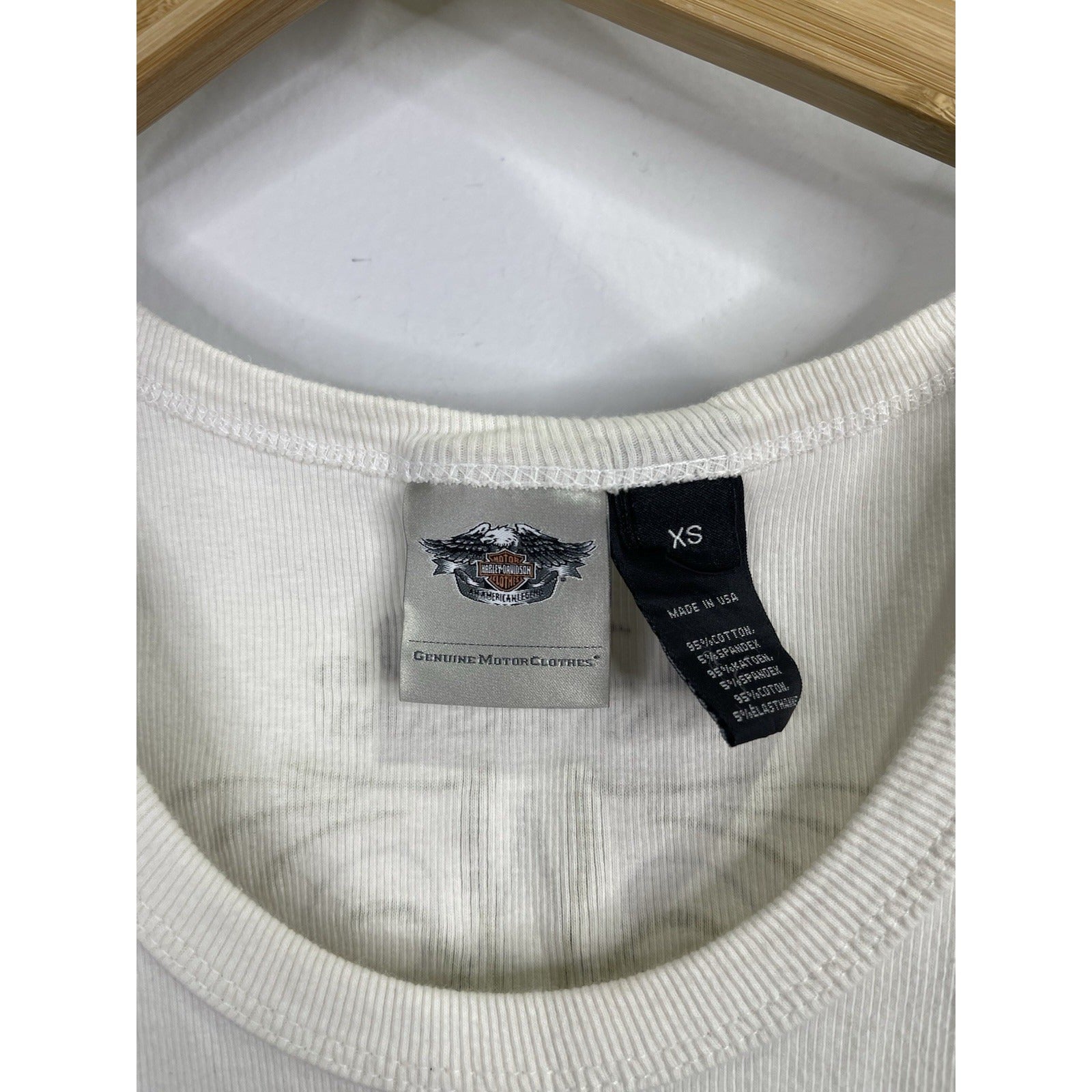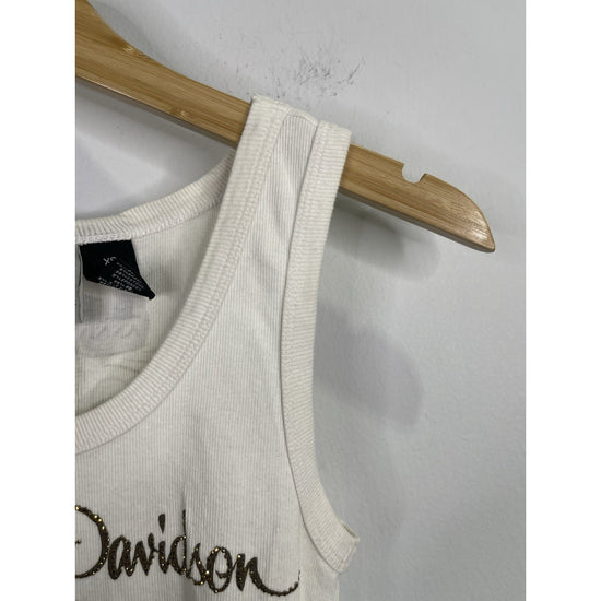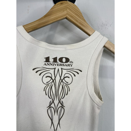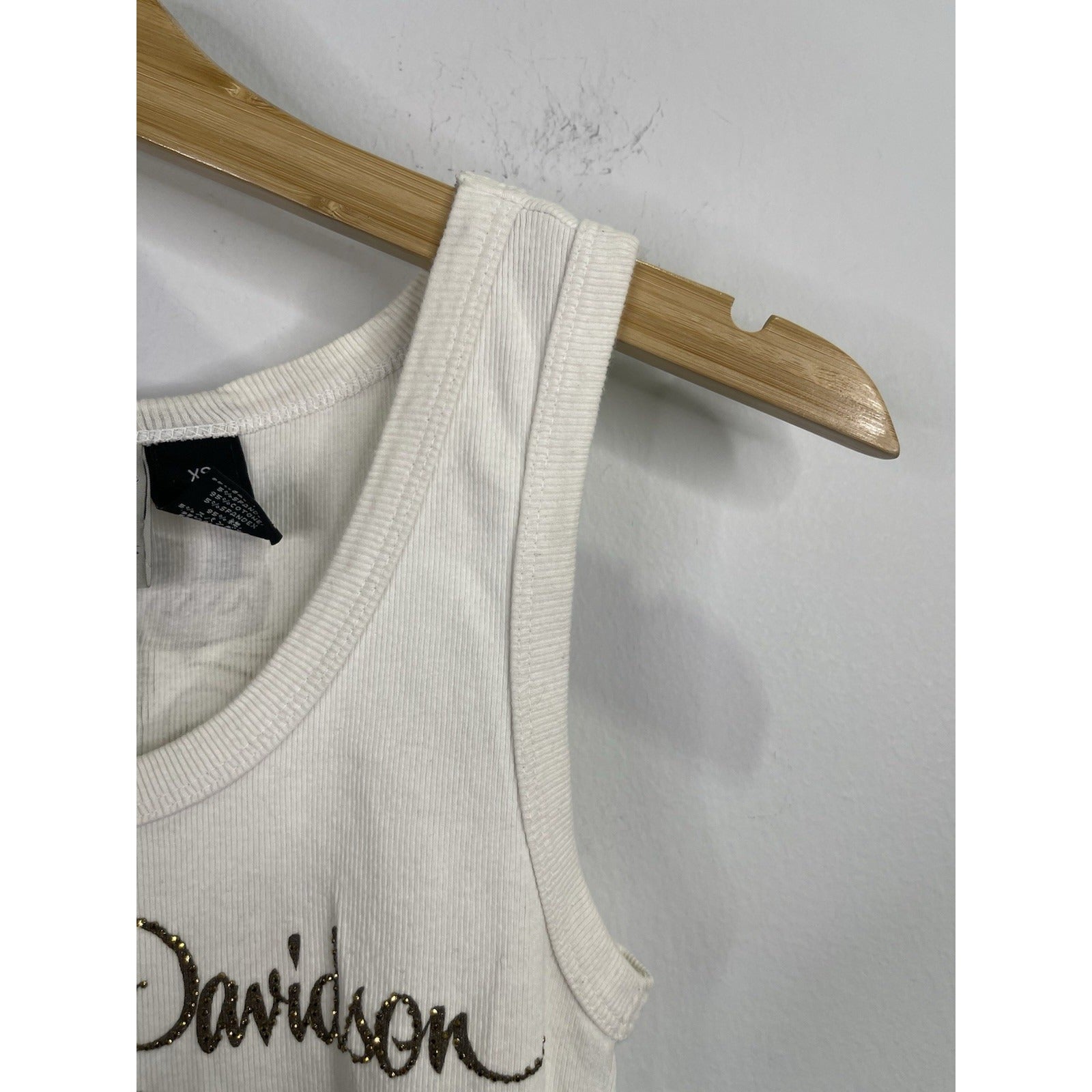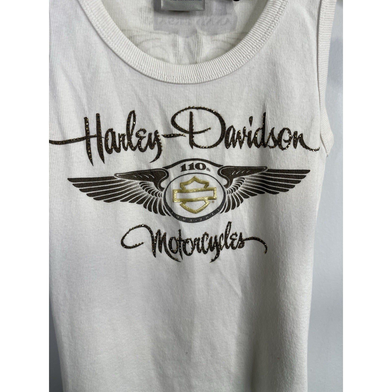 This Women's Harley-Davidson White Gold 110th Anniversary Bling Wings Tank Top in size XS is a stylish and eye-catching piece perfect for any motorcycle enthusiast. Made from a comfortable blend of spandex and cotton, this sleeveless top features a scoop neckline and a solid white color with sparkling rhinestone accents. The slim fit and lightweight design make it perfect for easy care and everyday wear. Show off your love for Harley-Davidson with this basic yet chic tank top adorned with the iconic biker theme.