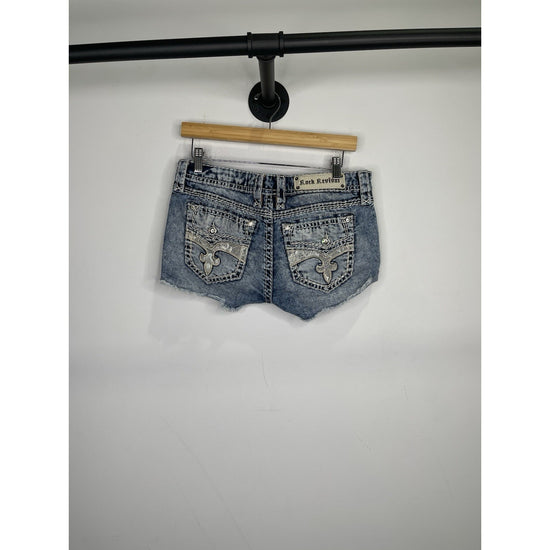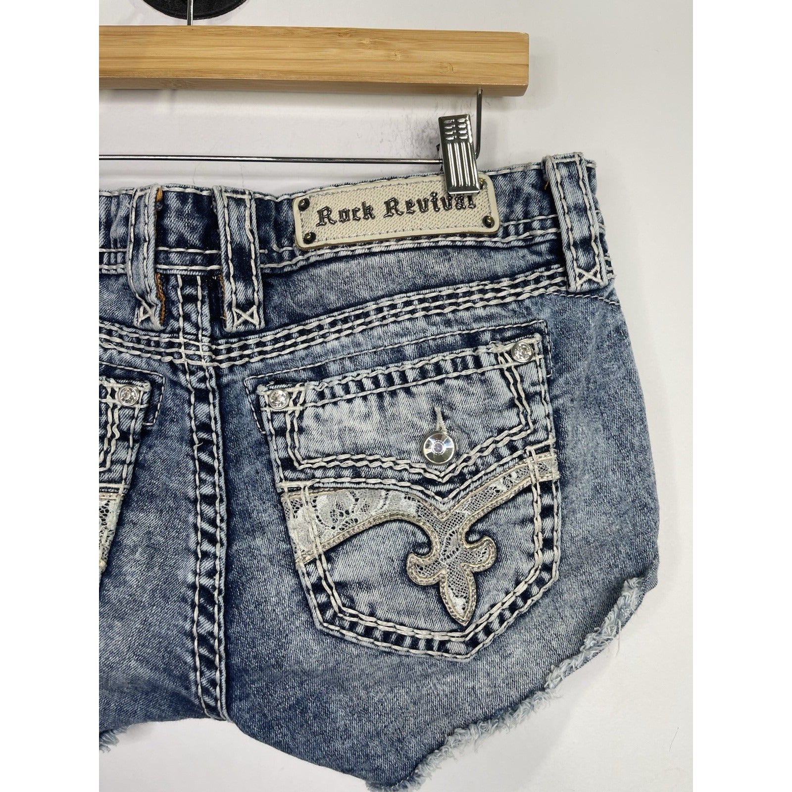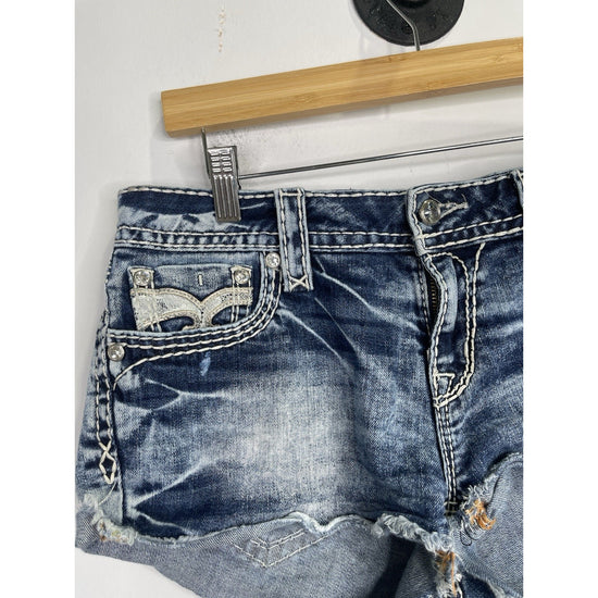 These Women’s Rock Revival Denim Shorts in Blue offer an edgy style with a distressed frayed hem, perfect for a casual day out or a party. The mid-rise cut-off shorts feature studded and rhinestone accents, a 5-pocket design, and a comfortable stretch fabric blend of spandex and cotton. The shorts are machine washable and ideal for summer or spring occasions, with a Western, festival, rock, and grunge theme. Whether you're traveling or just hanging out, these shorts provide a fashionable and versatile option for your wardrobe.