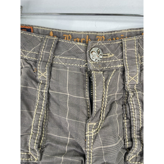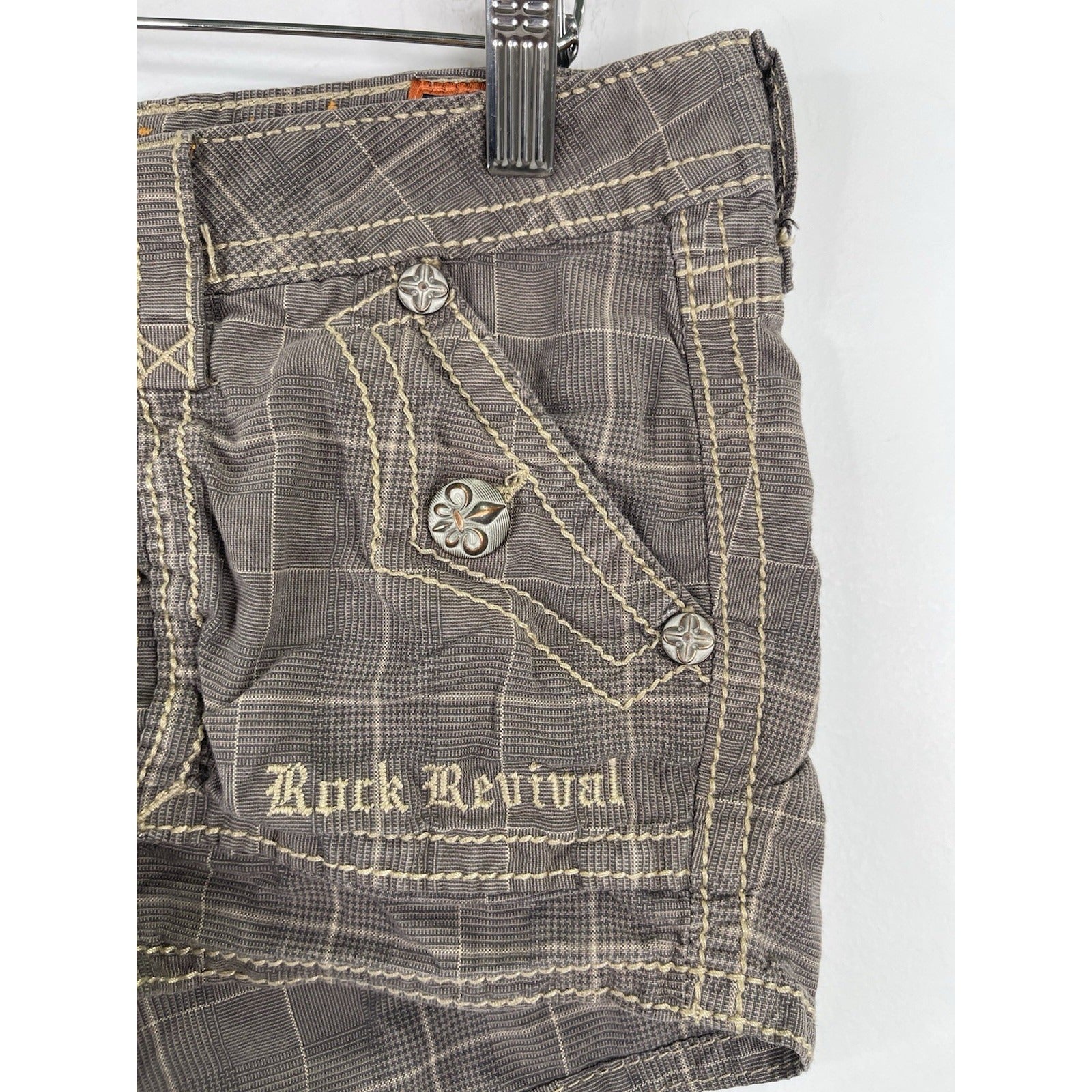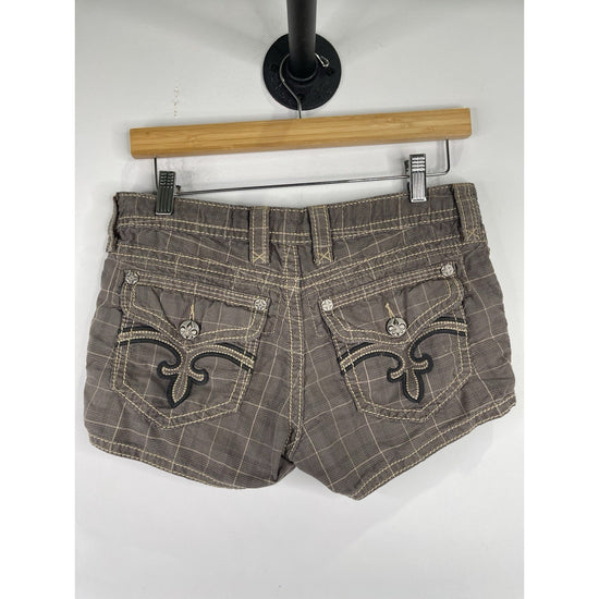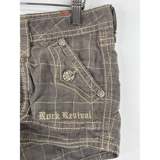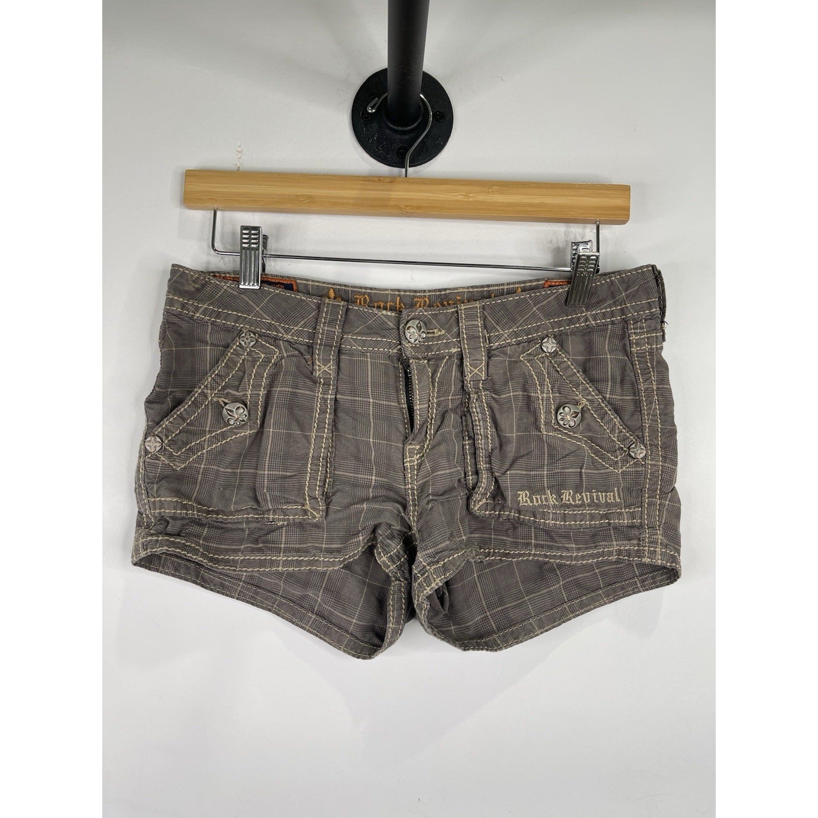 The product is a pair of Women's Rock Revival plaid short shorts in size 25. These shorts feature a biker style with a flat front and a vintage design. The brown plaid pattern adds a unique and stylish touch to the regular fit and size. Perfect for women looking to make a statement with their fashion choices, these shorts are a great addition to any wardrobe for a trendy and edgy look.