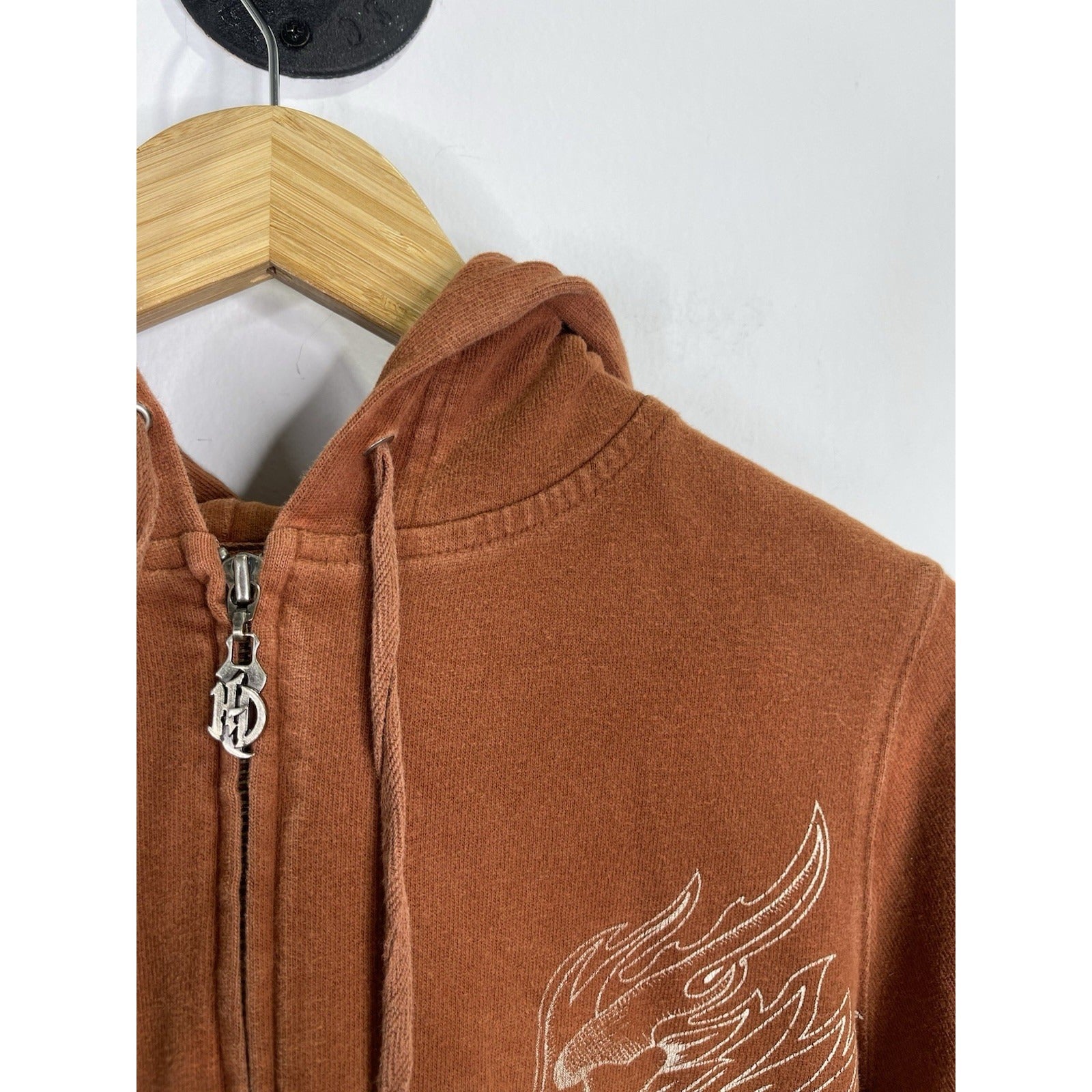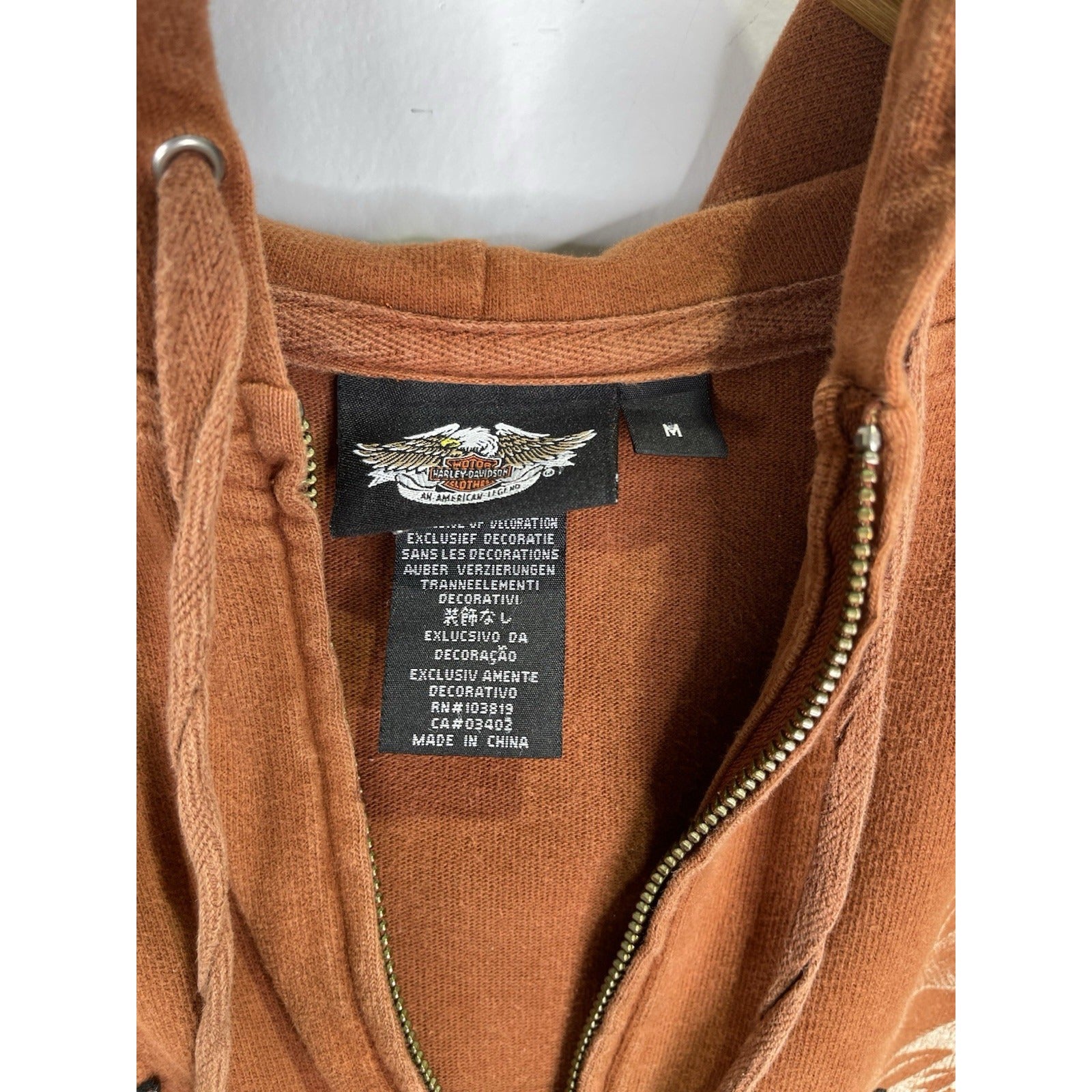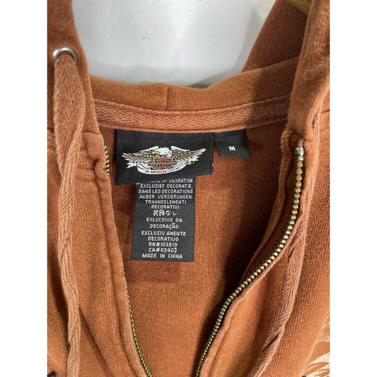 This Women's Vintage Y2K Harley Davidson Wings Full Zip Hoodie Jacket in orange is a stylish and comfortable activewear piece perfect for the fall, winter, and spring seasons. Made of cotton knit material, the hoodie features long sleeves, a zip closure, round neckline, and embroidered Harley-Davidson logo accents. The full zip style with hood and pockets adds practicality to the jacket, making it a versatile addition to any wardrobe. With a regular fit and vintage theme, this Harley Davidson hoodie is a unique and trendy choice for women who love biker and motorcycle styles.